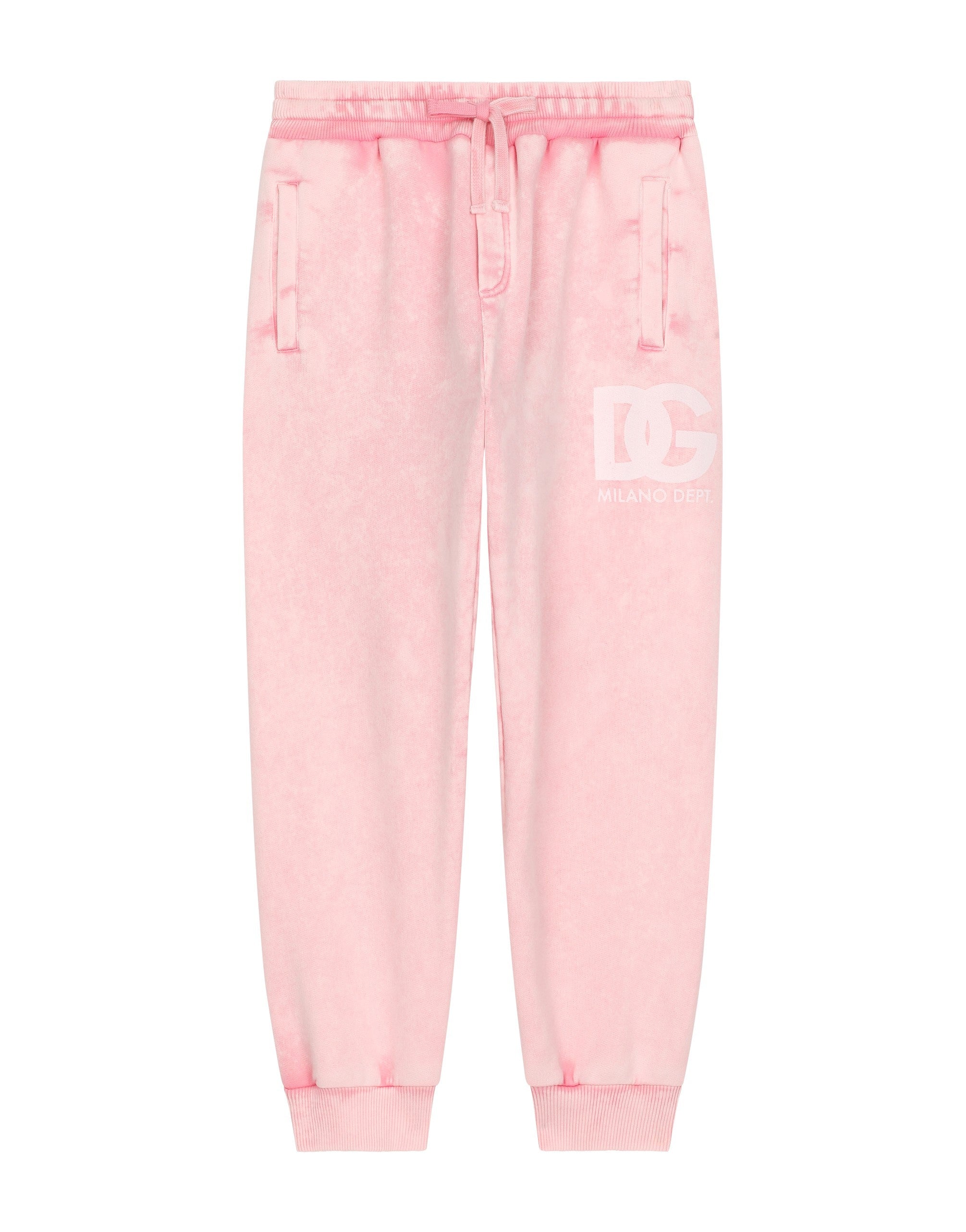 The inspiration is LA, one of the most beautiful, diverse and varied cities in the world. The collection presents a closet distinguished by an attitude that enhances the mix and match present in this incredible multifaceted city. Black, gray, brown, lilac, purple and red merge with oversize shapes packed with special treatments, recreating looks that are perfect for an immersive experience in the city’s lifestyle a place where fashion and innovation come together to create a new expressive language. Washed-look cotton jersey jogging pants with DG logo print: • Pink • Regular fit • Stretch waistband with drawstring • Slant pockets • Stretch knit cuffs • Placed print • Inner leg: 50 cm on a size 6 years • Hem: 10 cm on a size 6 years • Made in Italy