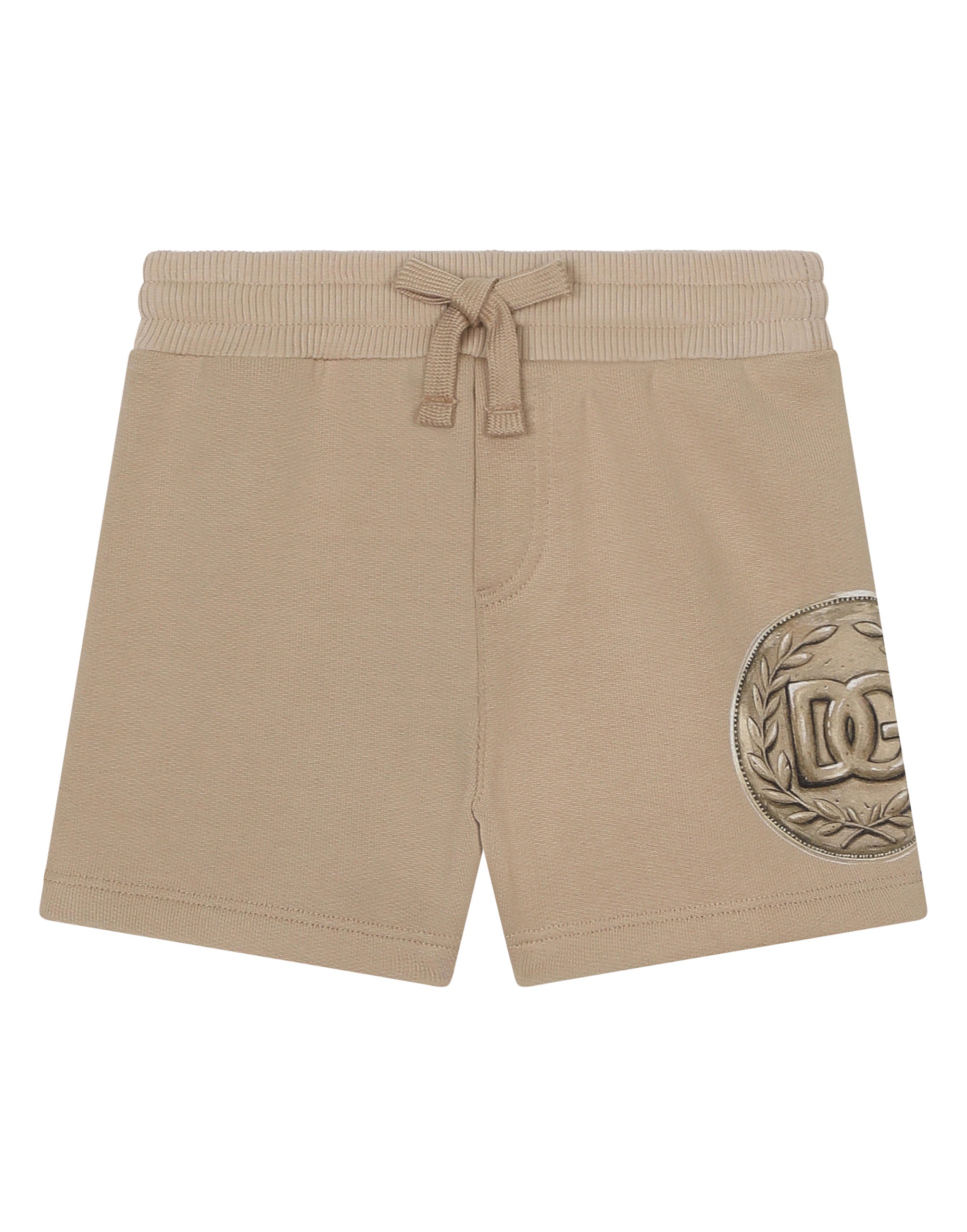 The Rome collection presents us with the grand past of the Roman Empire and our cultural roots in all its beauty and modern interpretations. Roman coins, faces inspired by the great emperors, stand out against a plain background paired with micro-coined trims or ramage detailing of laurel plants. Different treatments reinvent themselves and play with the past by creating special pieces for boys for a solid-color head-to-toe look with accents of youthful and fun street prints. Jersey jogging shorts with coin print: • Beige • Regular fit • Stretch waistband with drawstring • Unlined • The item in the size 6/9 months measures 22 cm in length • Made in Italy The difference in the print placement that you may find on this product is a feature of Dolce&Gabbana’s “Handmade” pieces. A detail that makes every garment or accessory unique and exclusive.