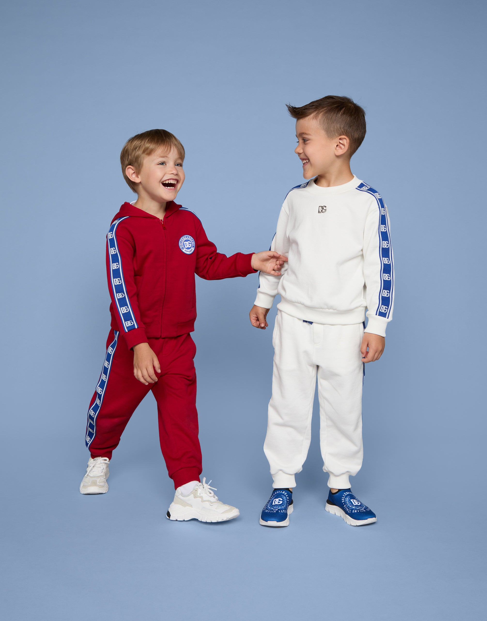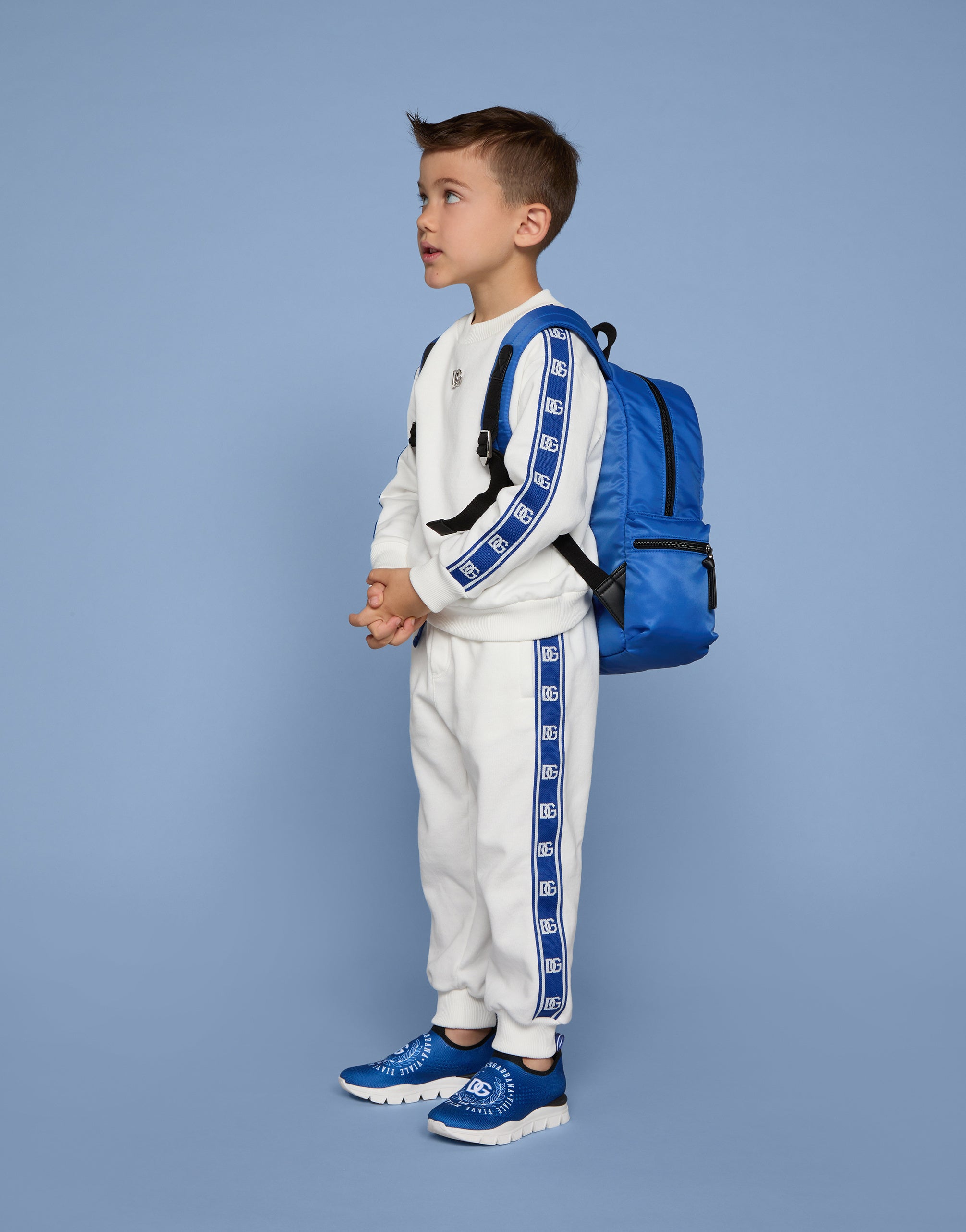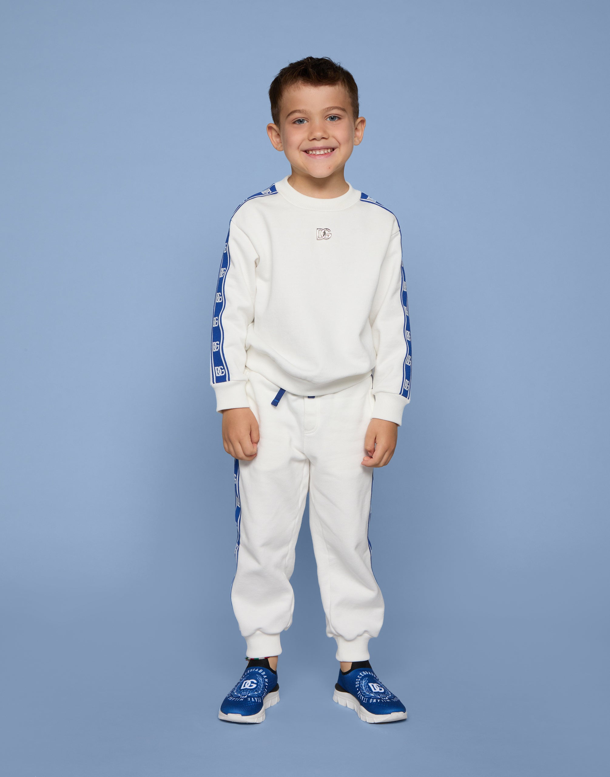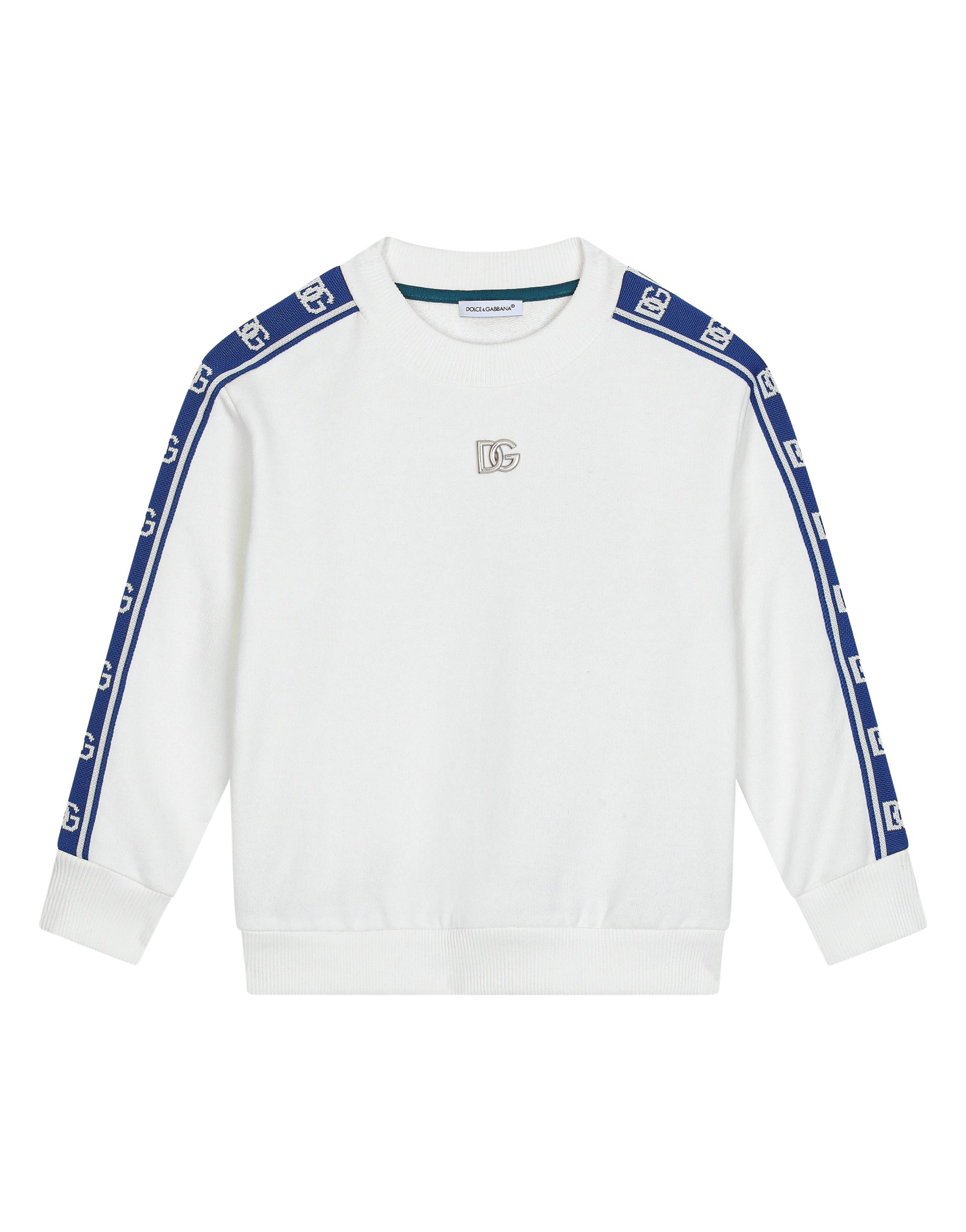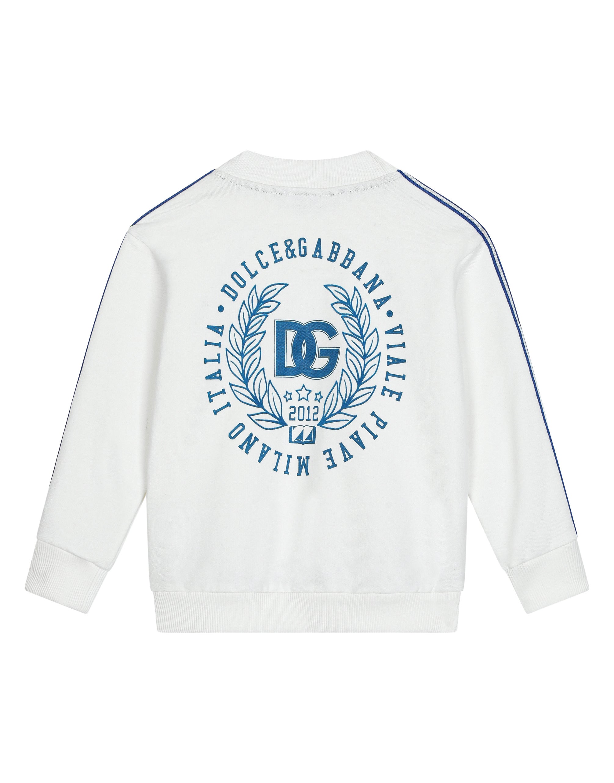 With DG Sport, Dolce&Gabbana is recounting the evolution of sports style that is being embellished with 70s-inspired details and taking its place in your everyday closet. Vibrant colors and branded details distinguish sporty technical clothing, creating contemporary and unique outfits. This cotton jersey sweatshirt features branded side bands. • Oversize fit • Stretch knit round neck • Long sleeves • Stretch knit hem and cuffs • Metal DG logo on the front • Flocked DG laurel print on the back • Unlined • The item in the size 3 years measures 41 cm from the shoulder seam • Made in Italy