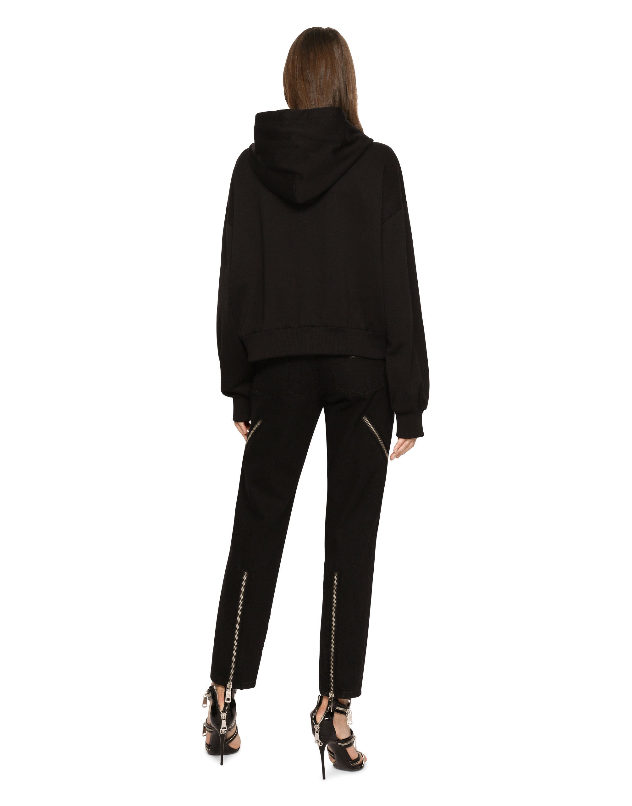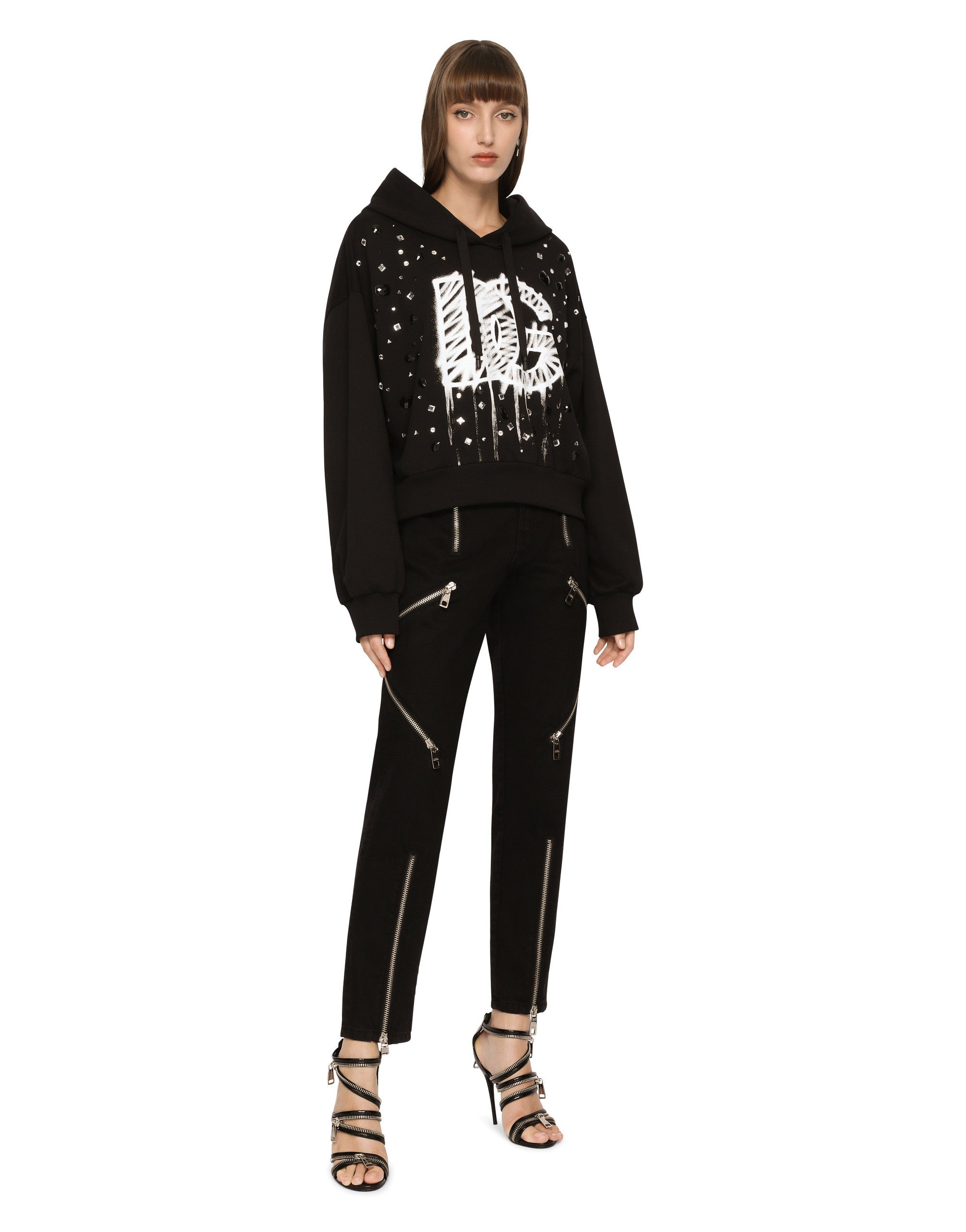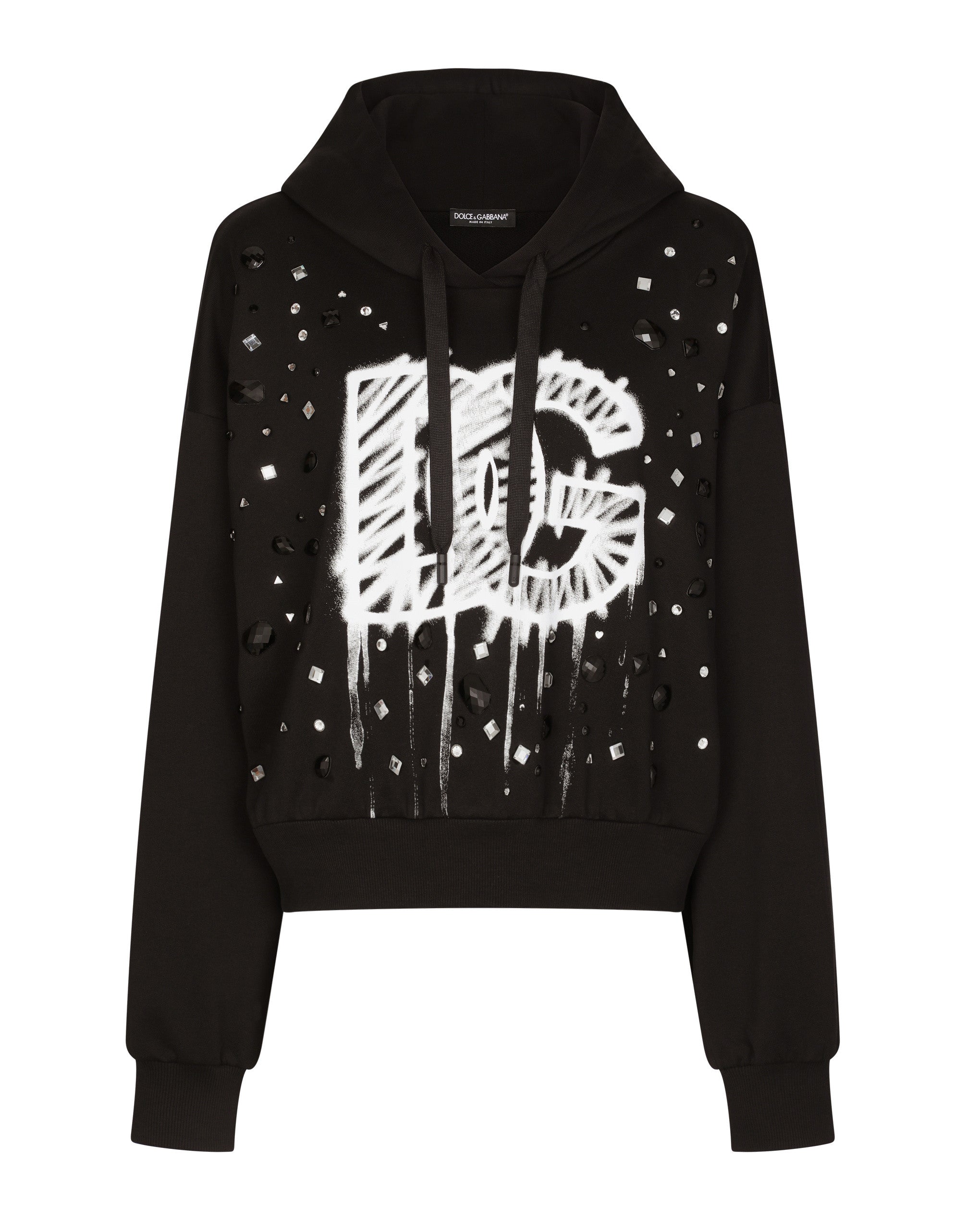 In this collection, Dolce&Gabbana is paying tribute to the logo that has been loved by entire generations and is back as the brand’s signature symbol. The fashionistas will find it hard to resist this oversize cotton hoodie with graffiti-style DG lettering and fusible rhinestone appliqués. A garment that will give you a chic casual look with clear contemporary flair. • Drawstring hood • Long sleeves • Oversize fit • Jersey trims • The piece measures 54 cm from the rear seam on a size M • The model is 175 cm tall and wears a size IT 40 • Made in Italy