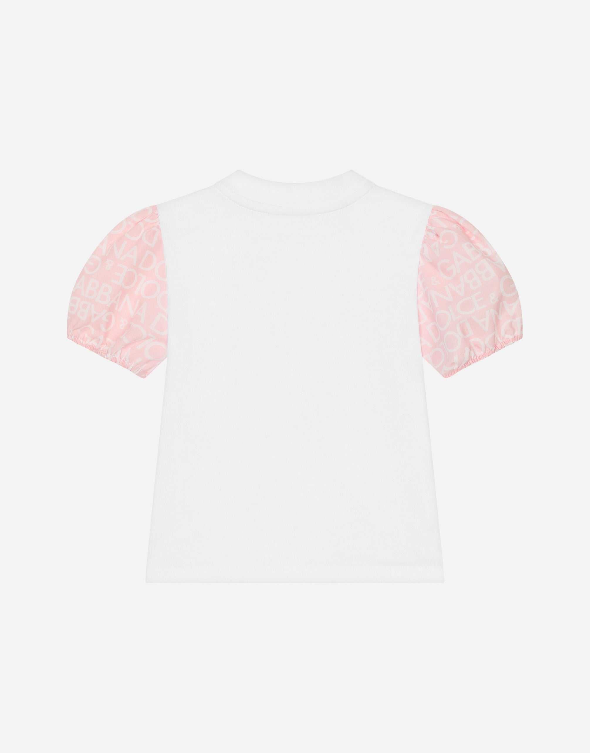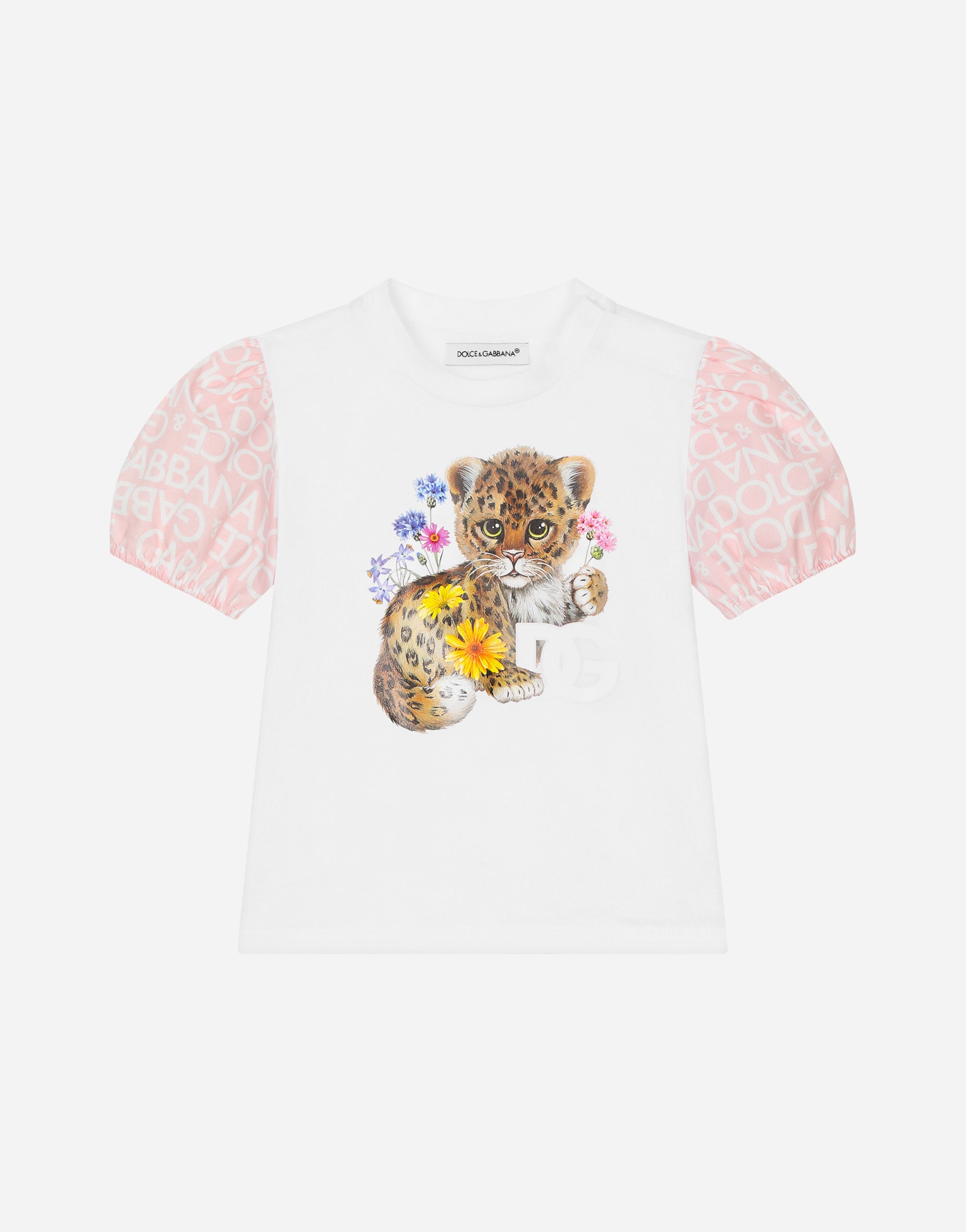 Dolce&Gabbana Kids’ formalwear reflects the uniqueness and elegance of Italian tradition, yet in a contemporary way, reworking elegant men’s closets for little ones too. Jersey T-shirt with baby leopard embroidery: • White • Regular fit • Embroidered round collar • Short puff sleeves • DG logo embroidery on the front • Small concealed press-stud fastenings on the back • The item in the size 6/9 months measures 31.5 cm from the shoulder seam • Made in Italy