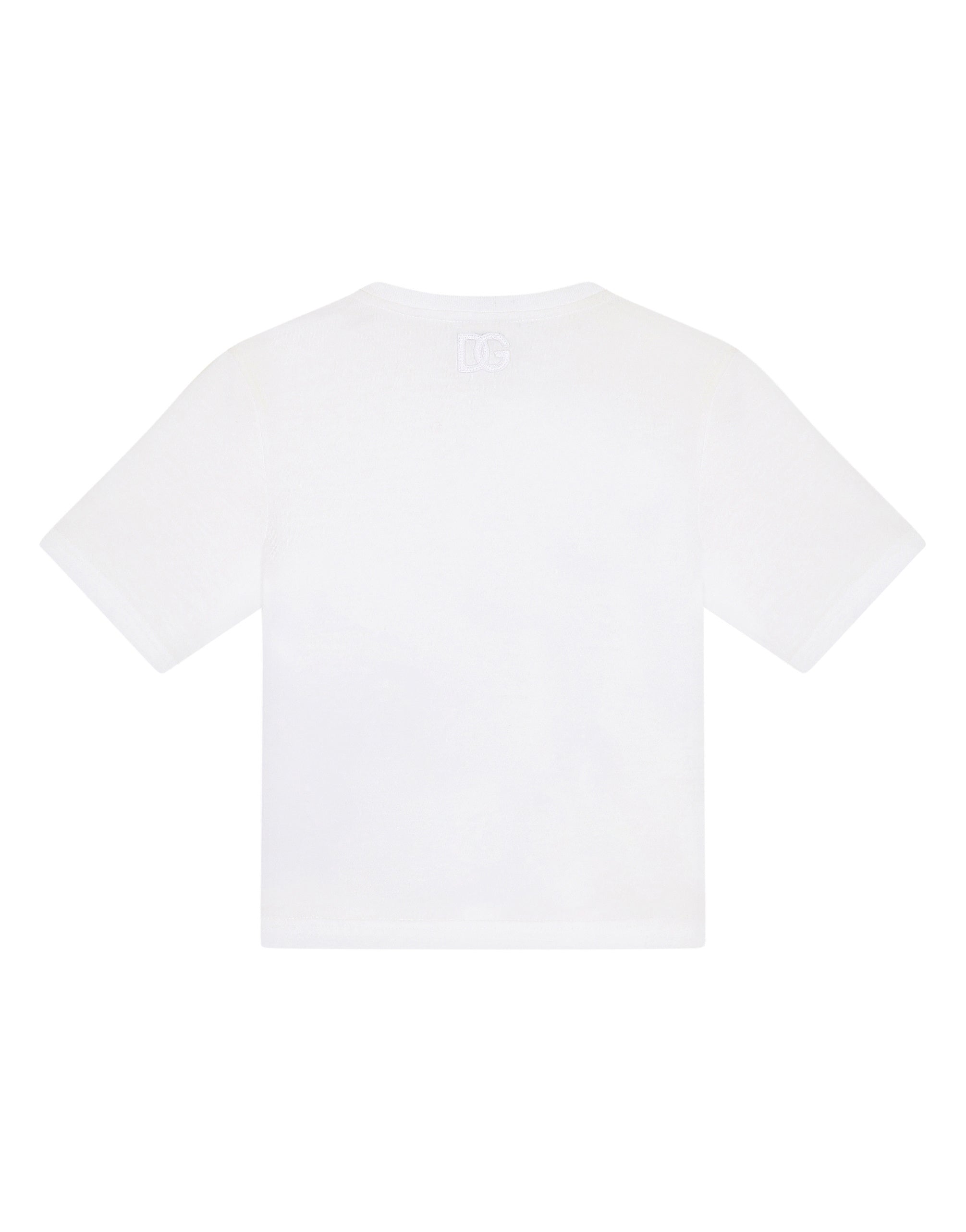 Italian craftsmanship and the “homemade” are the beating heart of the Fatto a mano Collection, the mini-me version of our Women's Collection. The star of the theme is the knitwear, which is imbued with Dolce&Gabbana’s key colors of red and black and conveys Sicilian tradition and love with a modern feel. This soft cotton jersey T-shirt is embellished by a cross-stitch rose patch. • Regular fit • Stretch knit round neck • Short relaxed sleeves • DG patch on the back • Unlined • The item in the size 3 years measures 39 cm - 15.4 inches from the shoulder seam • Made in Italy Composition: 100% Cotton