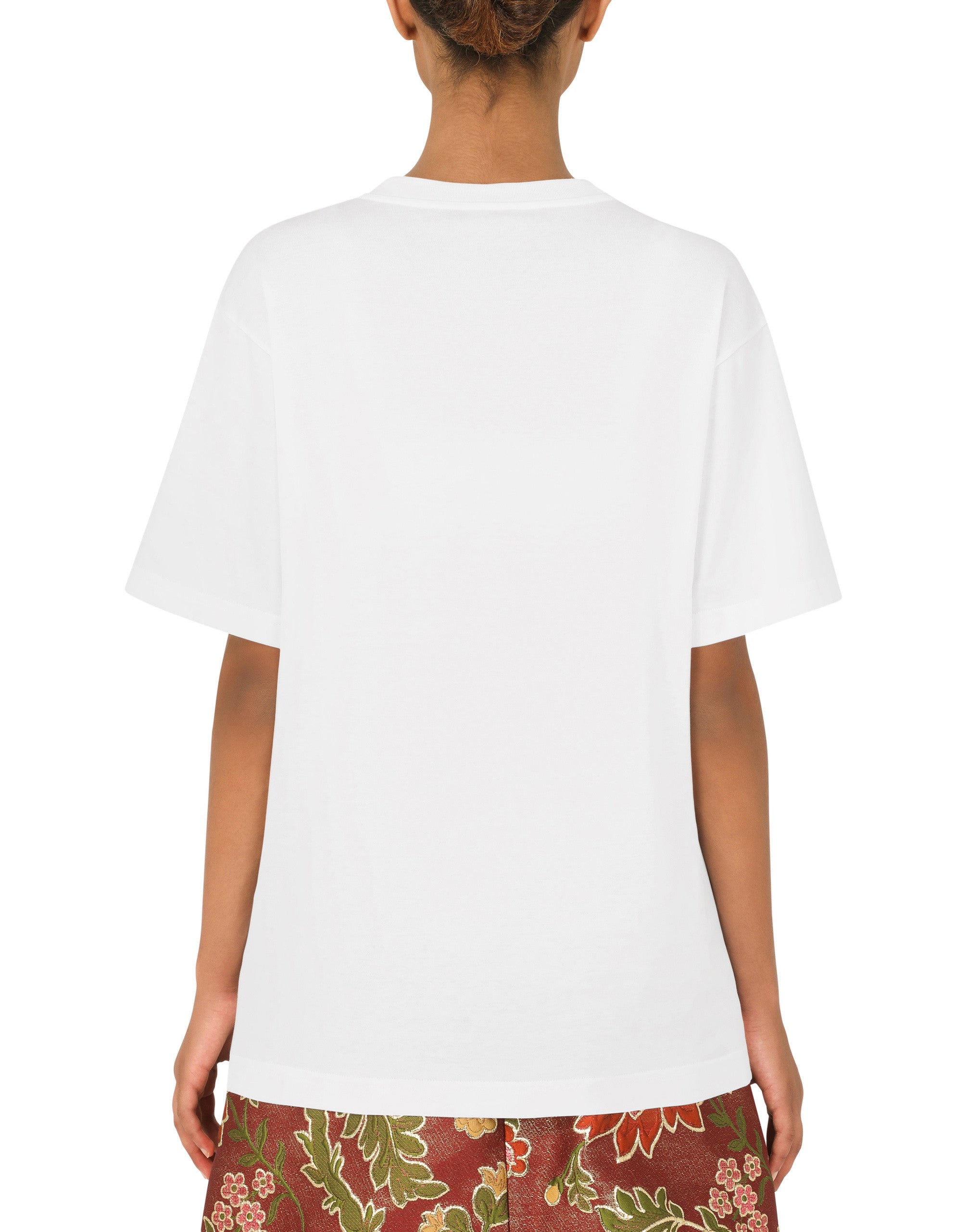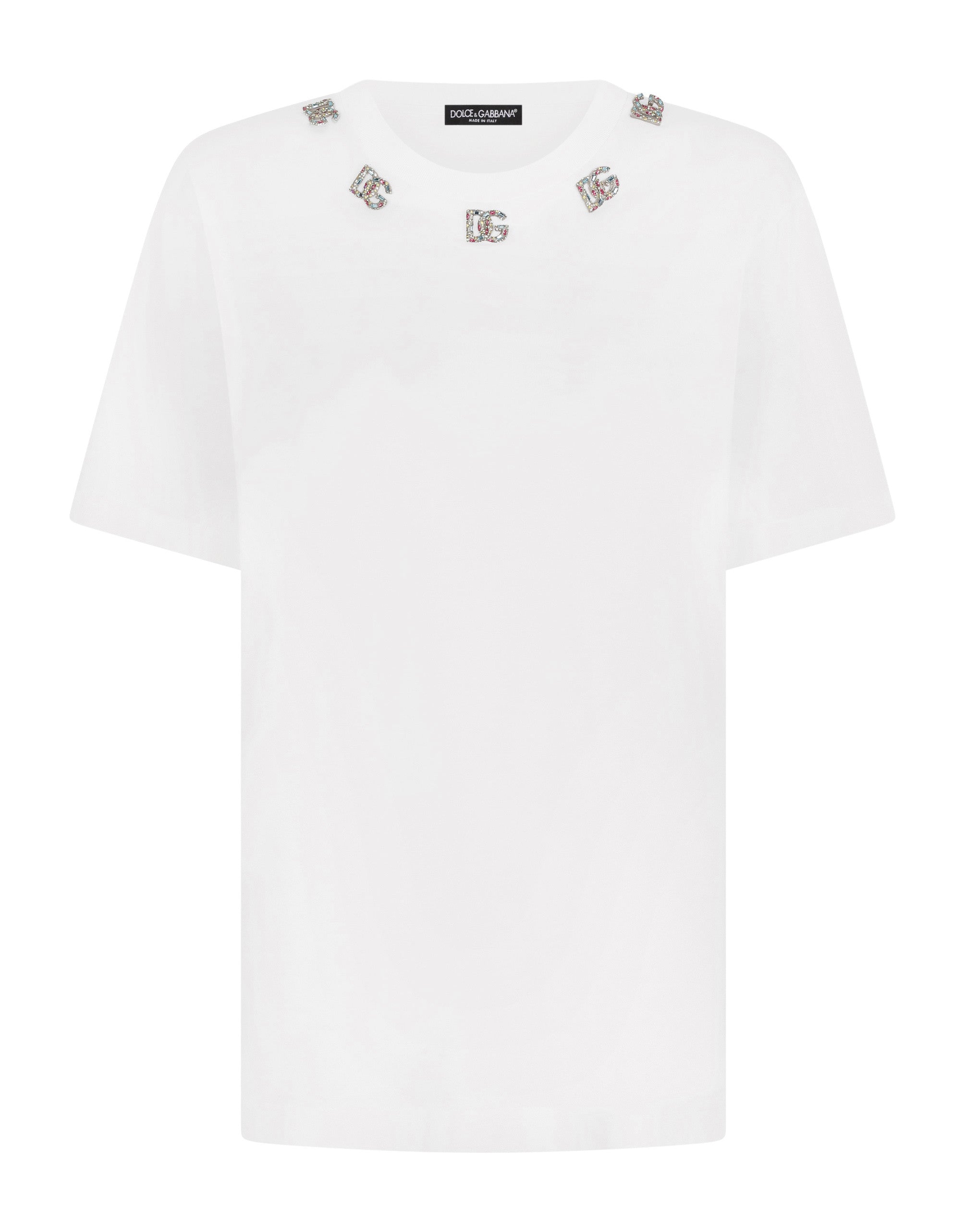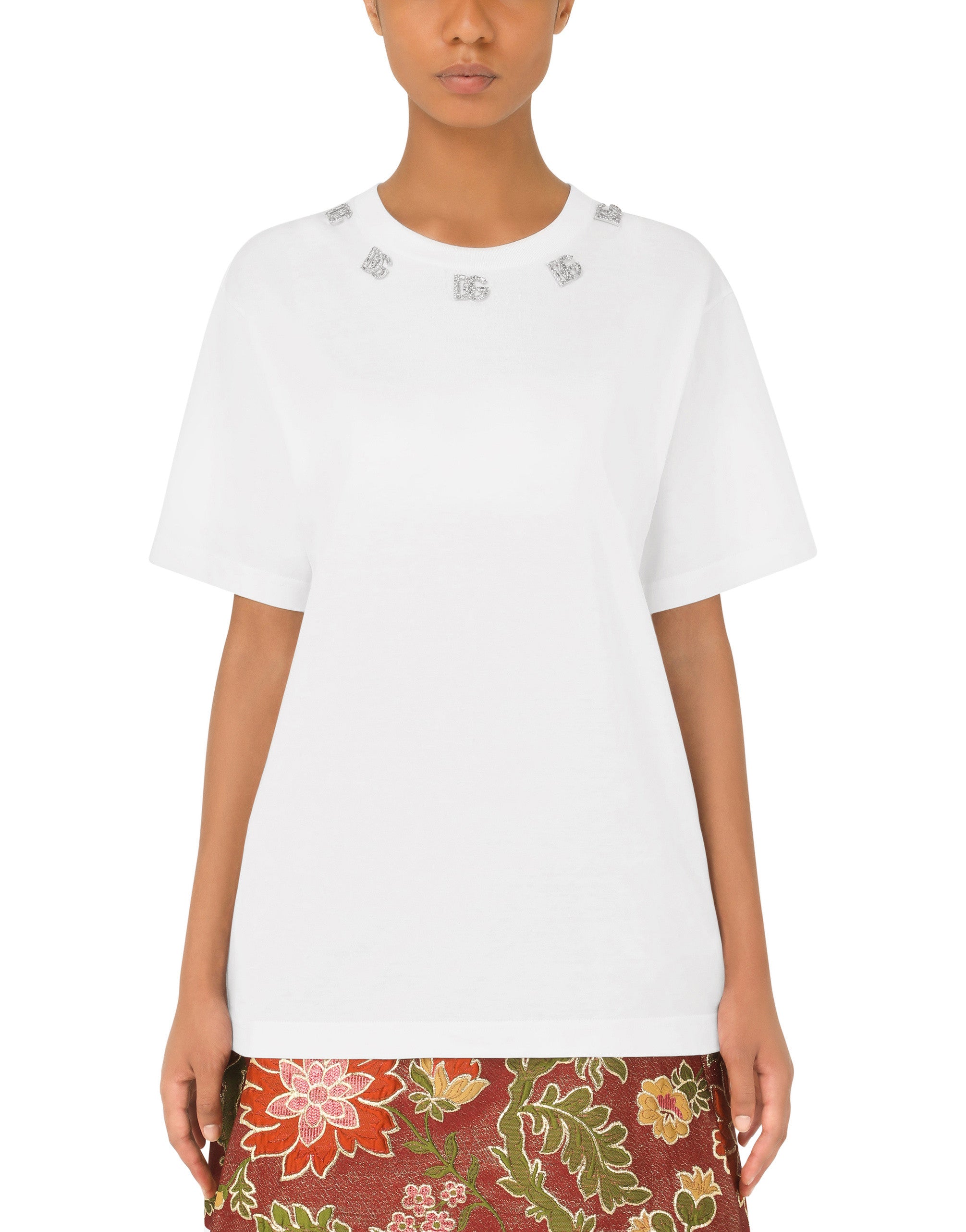 Featuring a classic shape with crystal-rhinestone-adorned DG logo appliqués, this slightly oversize T-shirt comes in light white cotton jersey and will be your go-to garment that will add some refined personality to all your looks. • Round neck • Short sleeves • Oversize fit • The piece measures 70 cm - 27.6 inches from the rear collar seam on a size IT 40 • The model is 175 cm - 68.9 inches tall and wears a size IT 40 • Made in Italy