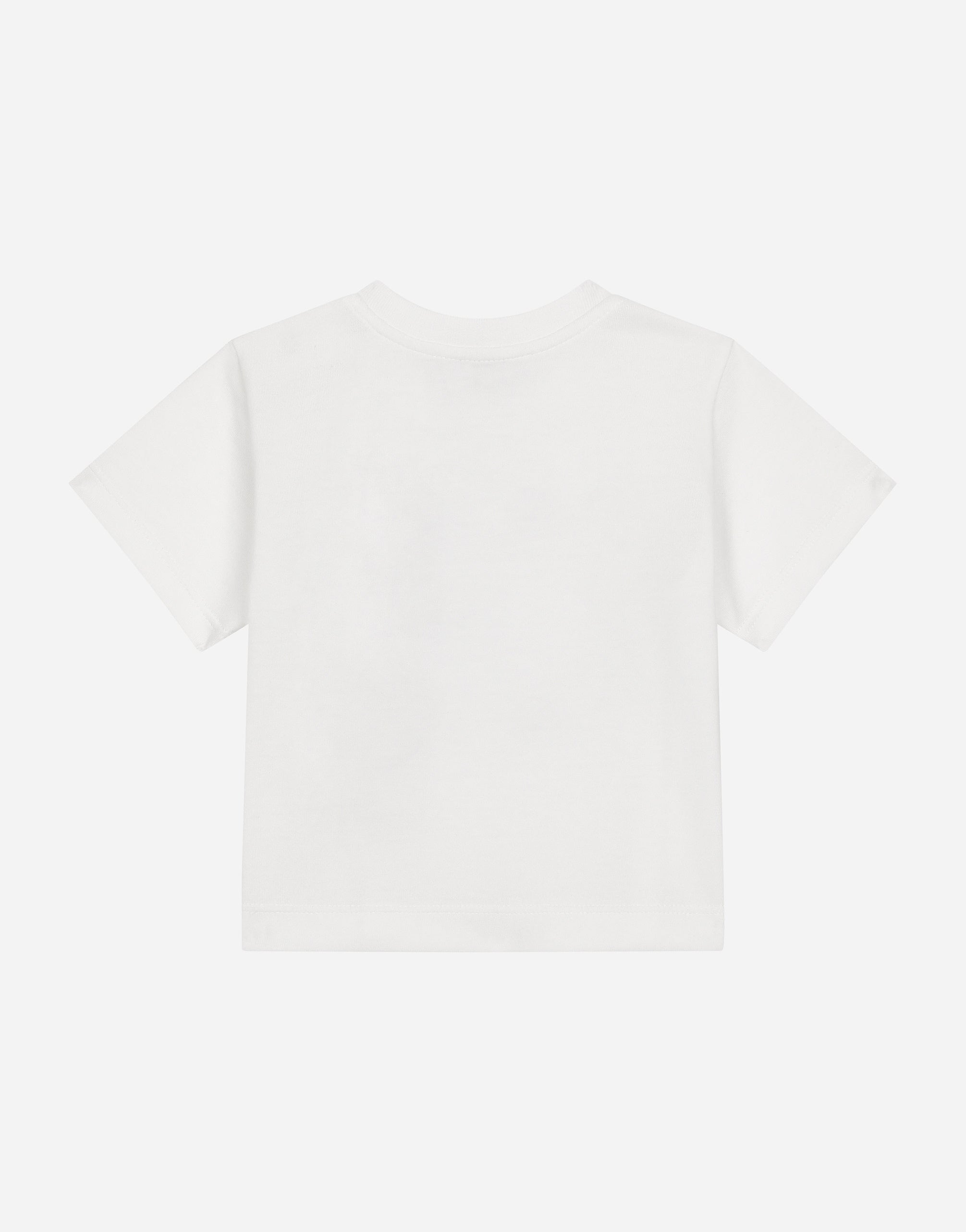 The Boy’s “Banano” line immerses us in the beauty of nature and transports us on a joyful vacation with parents to tropical cities, distinguished by lush gardens and vibrant, energetic colors. A giant “Banana” leaf print, vintage 1940s graphics, and special fabrics for a boy who plays with craftsmanship and beauty. This is how the designers recount a fantastic place, the tropics, a magical locale where you can dream, where nature spoils us with its unique colors. Cotton jersey T-shirt with DG logo print: • White • Oversize fit • Stretch knit round neck • Short sleeves • Rubberized DG logo print • Small concealed press-stud fastenings on the shoulder • The item in the size 6/9 months measures 32 cm from the shoulder seam • Made in Italy