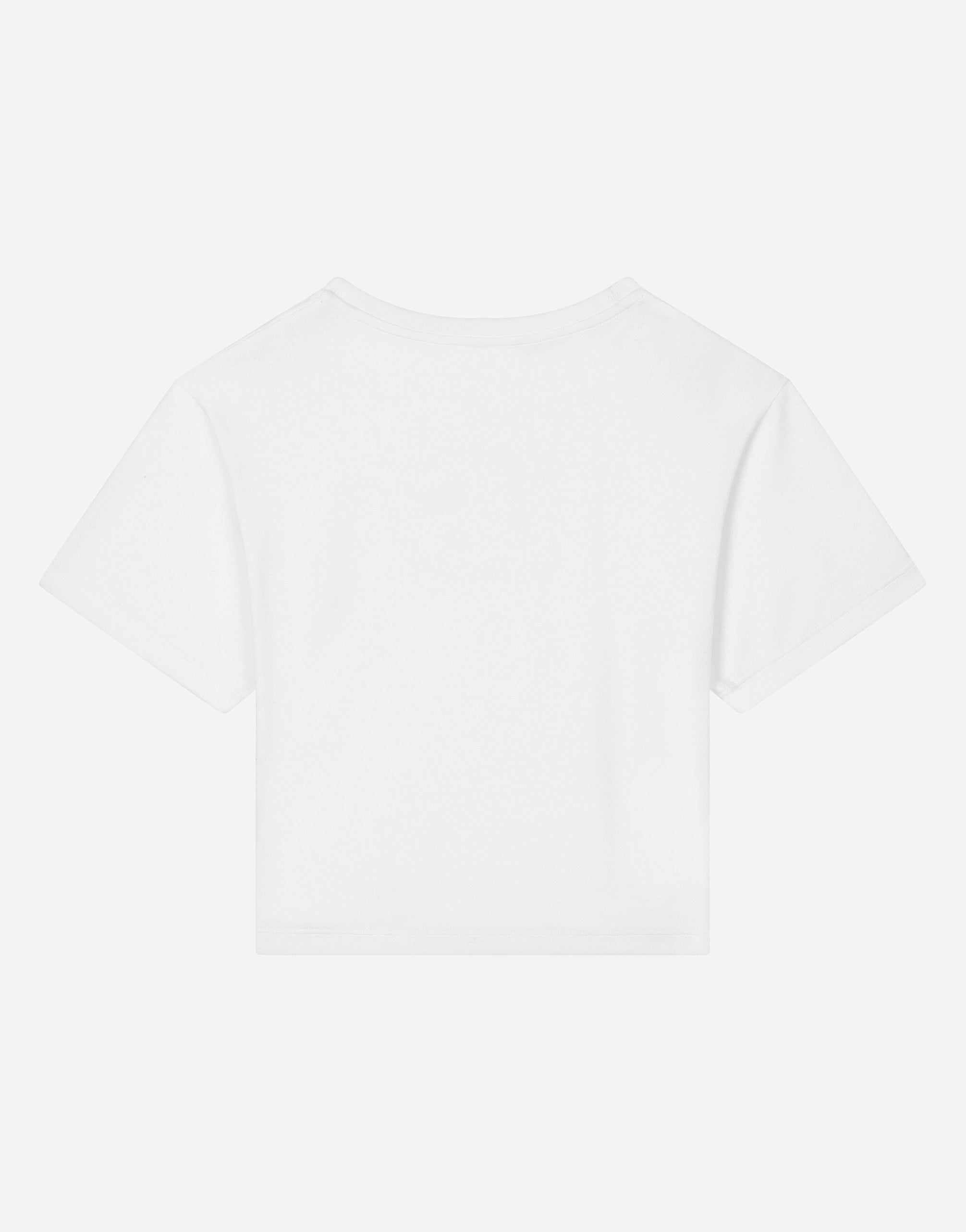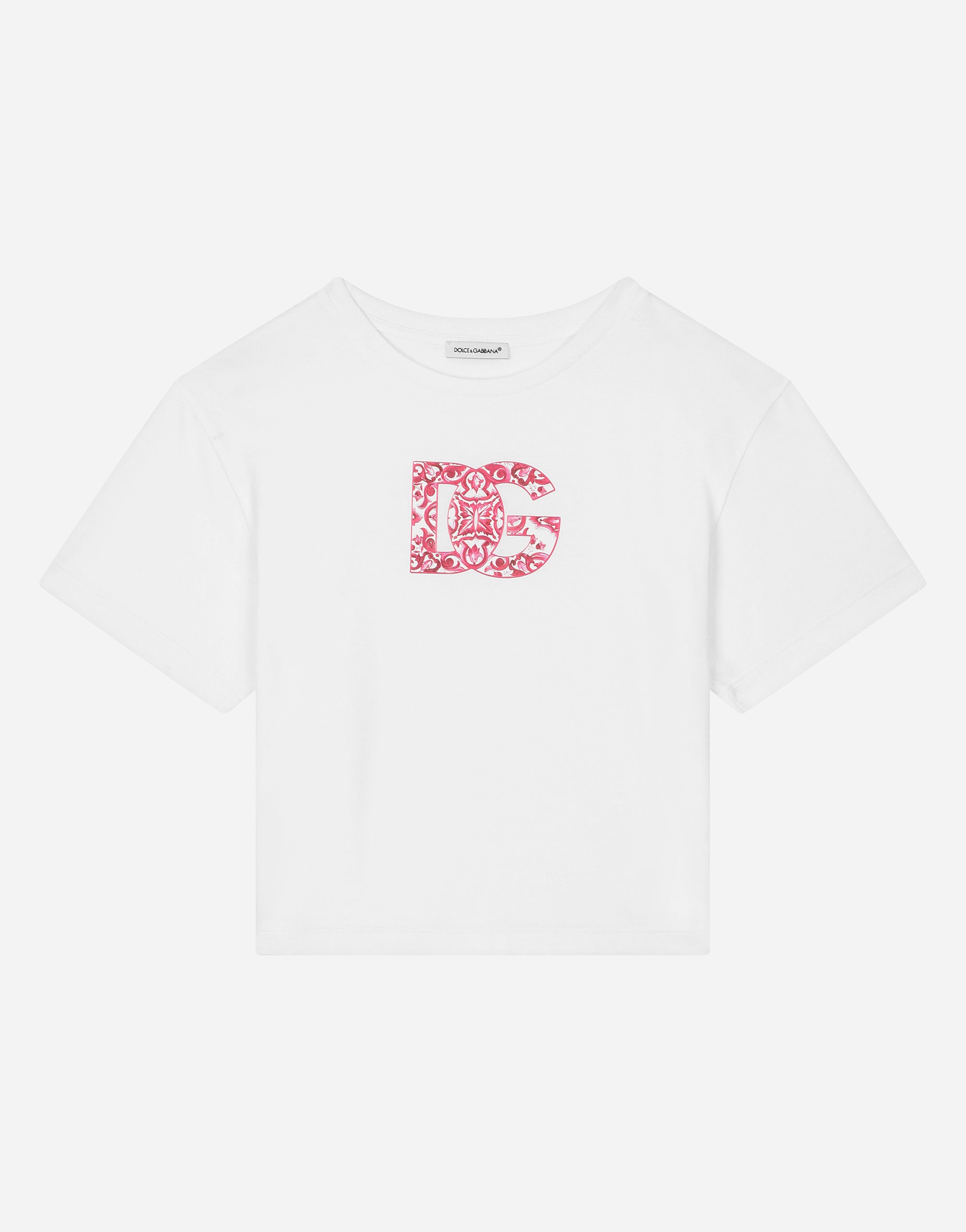 Summer told by Stefano and Domenico is tinged with the iconic majolica print presented against a striking and pure white background, as though the pieces were surrounded by dazzling sunlight. The two-tone color palette takes us on a journey to discover Sicilian colors and iconic, authentic silhouettes, made even more special by single, nonrecurring, placed prints that celebrate the originality of handmade pieces and highlight the concept of lightness and femininity. Jersey T-shirt with majolica DG logo print: • White • Oversize fit • Round neck • DG logo print on the front • Short sleeves • The item in the size 6 years measures 42 cm from the shoulder seam • Made in Italy The difference in the print placement that you may find on this product is a feature of Dolce&Gabbana’s “Handmade” pieces. A detail that makes every garment or accessory unique and exclusive.