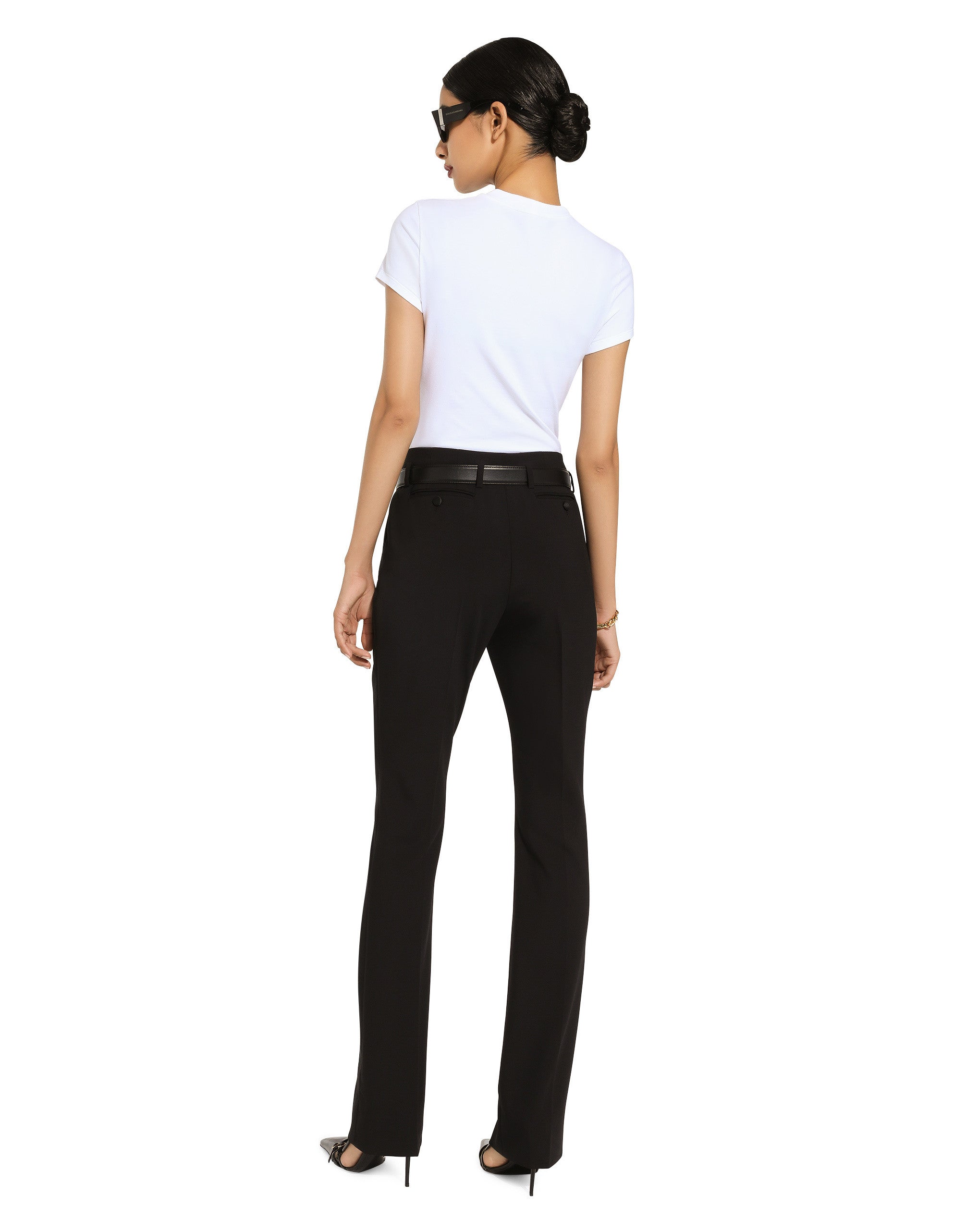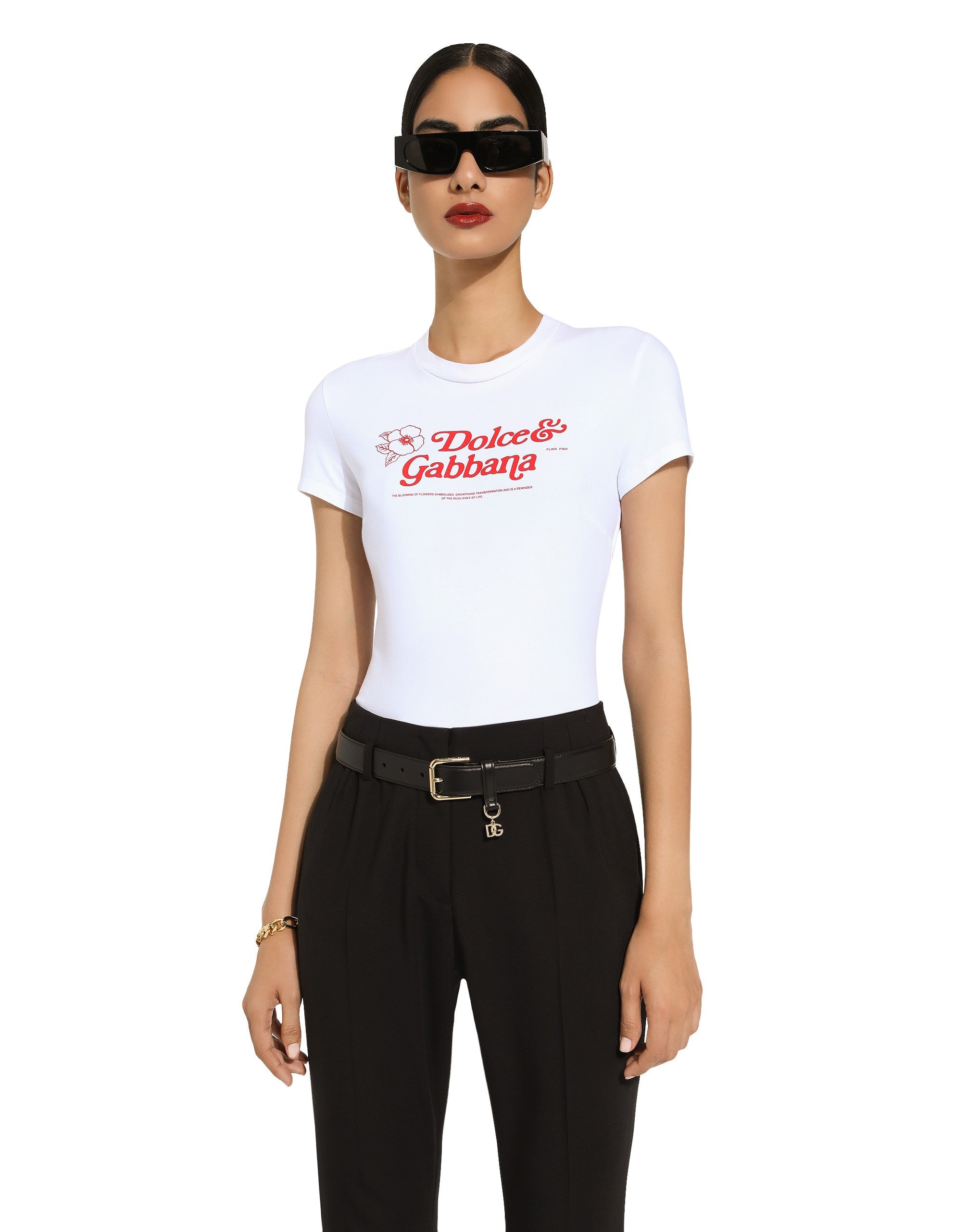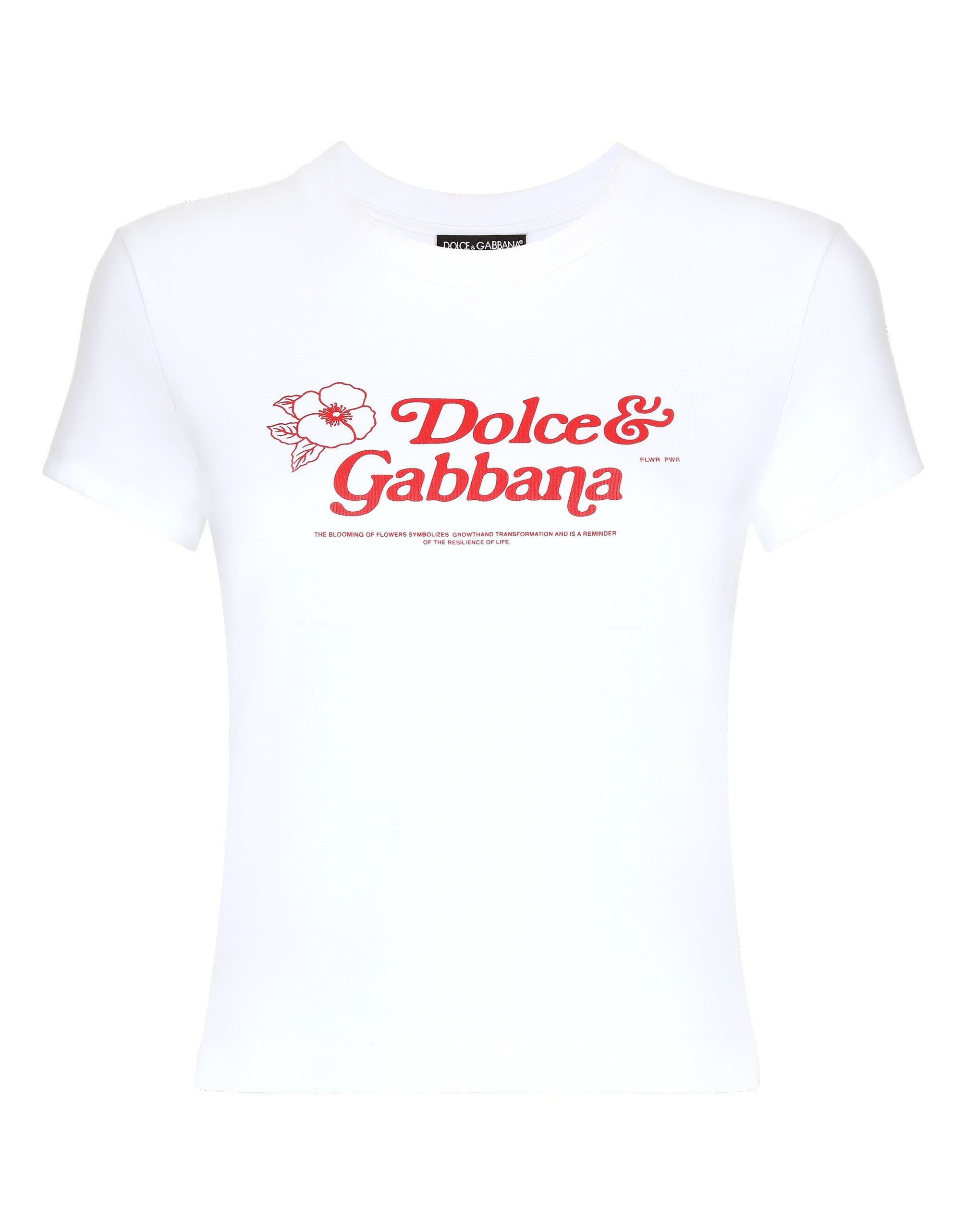 The spirit of the 1960s is taking over the new Flower Power collection. The focus is a head-to-toe floral look built around pairing and layering rose, anemone and floral bouquet maxi-prints. A cosmopolite poised between playful and sexy, this women interprets the austerity and elegance of the 1960s, harking back to boldly opulent imagery that here at Dolce&Gabbana is condensed and reinterpreted through silhouettes, ample proportions and airy shapes, bringing femininity and sensuality to the forefront. Cotton jersey T-shirt with Dolce&Gabbana lettering: • White • Round neck • Short sleeves • Form fitting • The piece measures 60.5 cm from the back of the neck on a size IT 40 • The model is 175 cm tall and wears a size IT 40 • Made in Italy