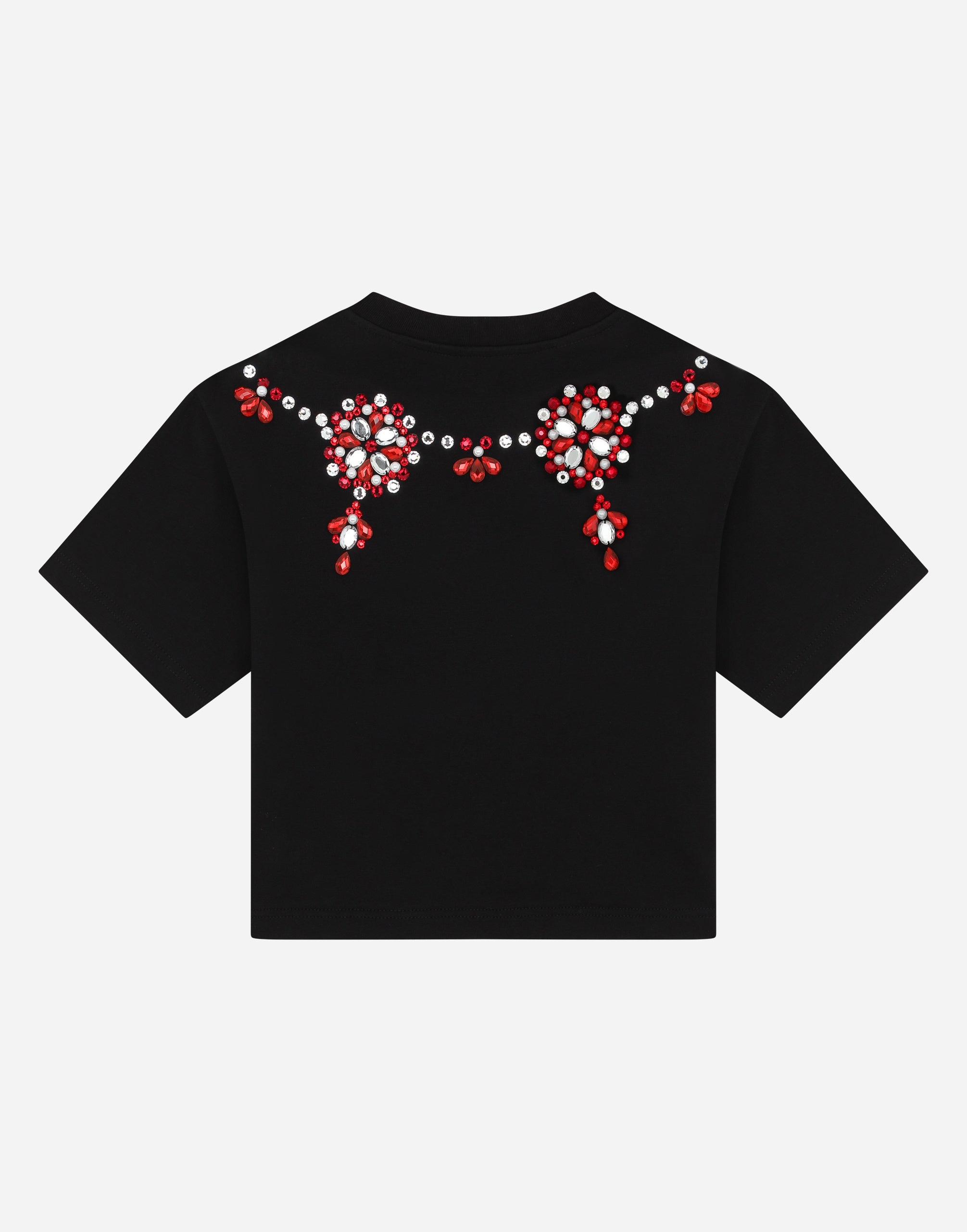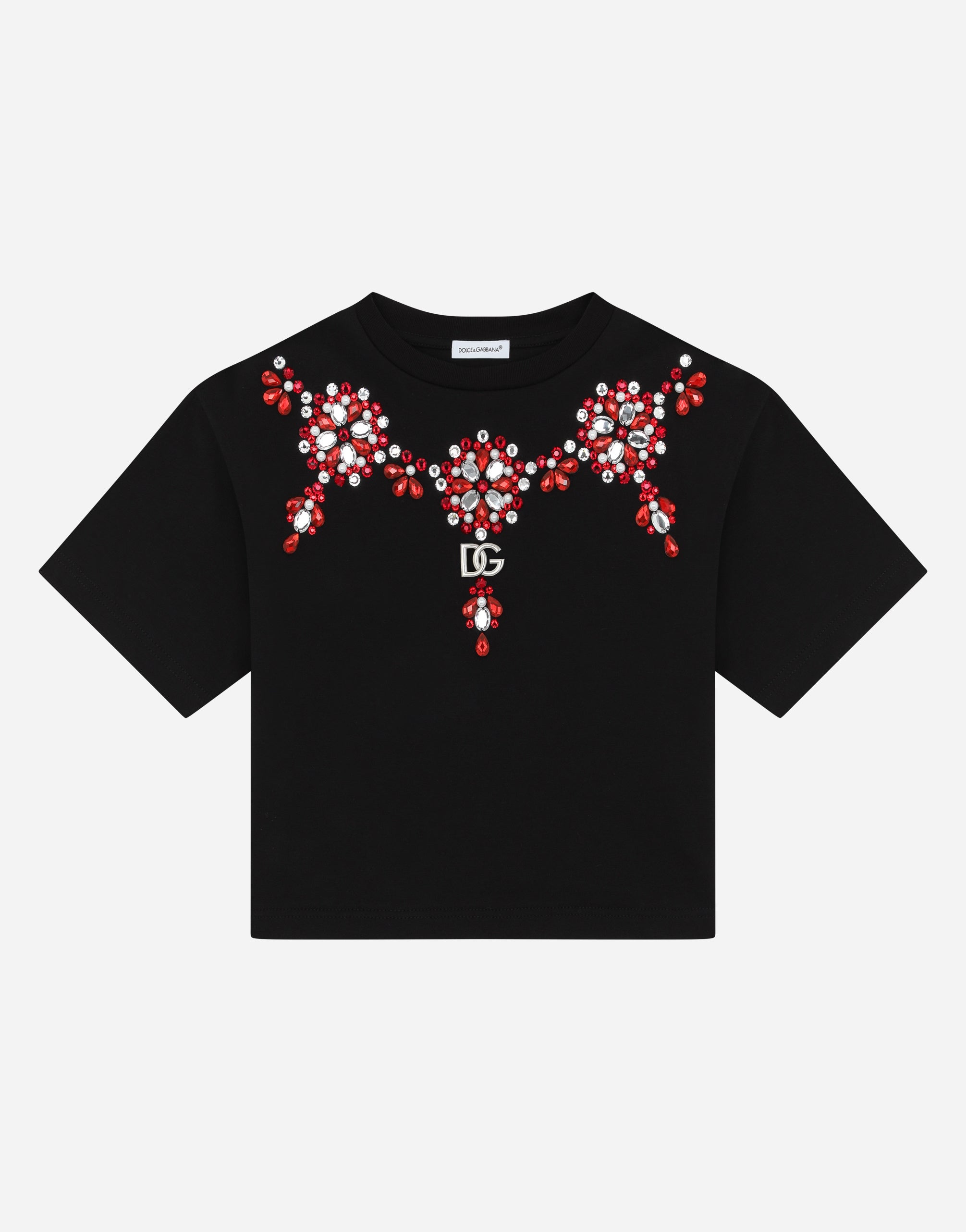 With the DG Light fashion show, Dolce&Gabbana is bringing a glamorous, optimistic world to life by merging animal and floral prints with camouflage accents in an unexpected way. Lurex brocade and fusible rhinestone appliqués add sparkle to the pieces, inventing a new mix and match that enhances the desire to play around with fashion. This T-shirt with exquisite sparkly fusible rhinestone embellishment will make your little princesses shine. • Oversize fit • Round neck • Short sleeves • Fusible rhinestone appliqué on the front • Metal DG logo on the front • Jersey lining on the front • The item in the size 3 years measures 38.5 cm - 15.2 inches from the shoulder seam • Made in Italy