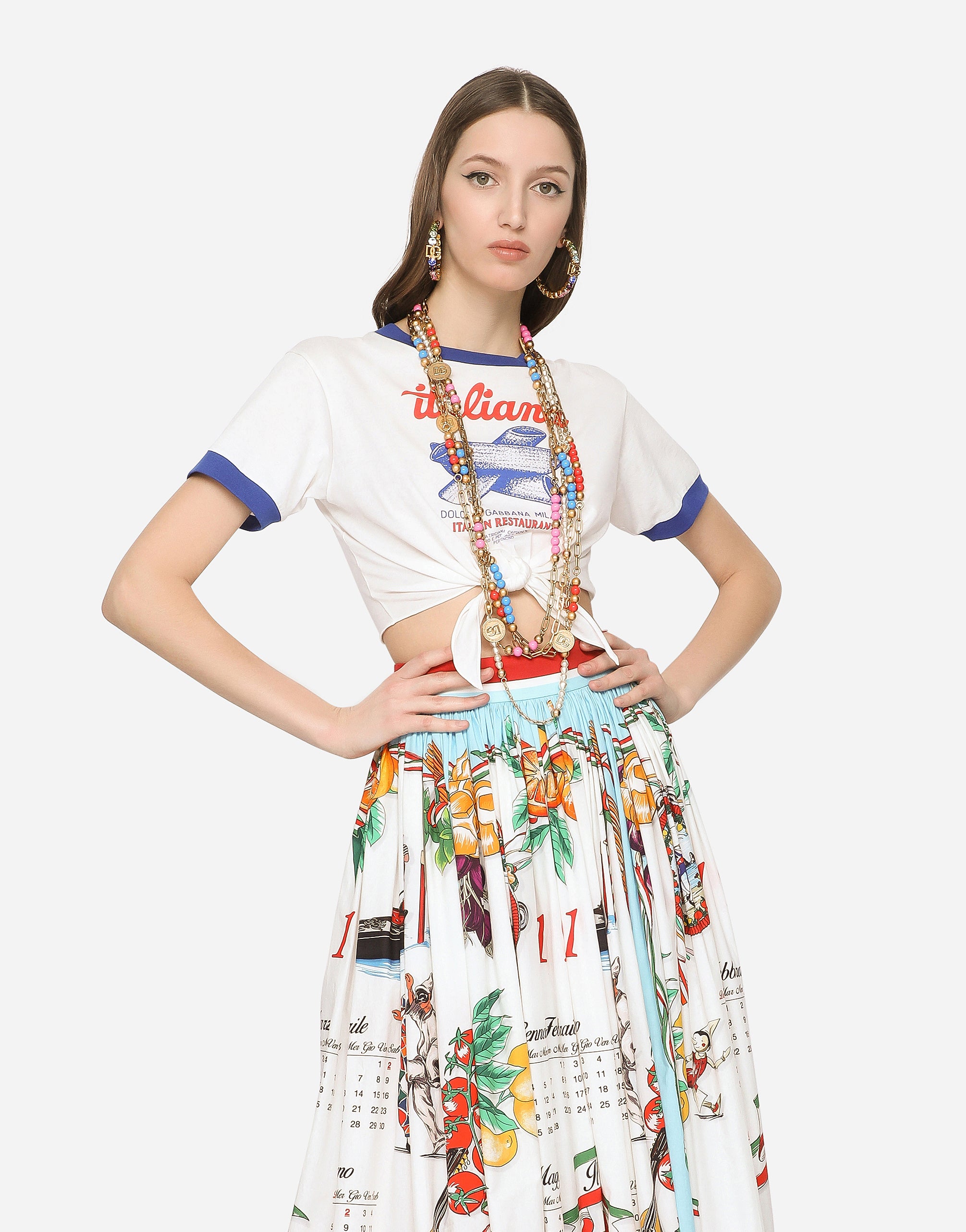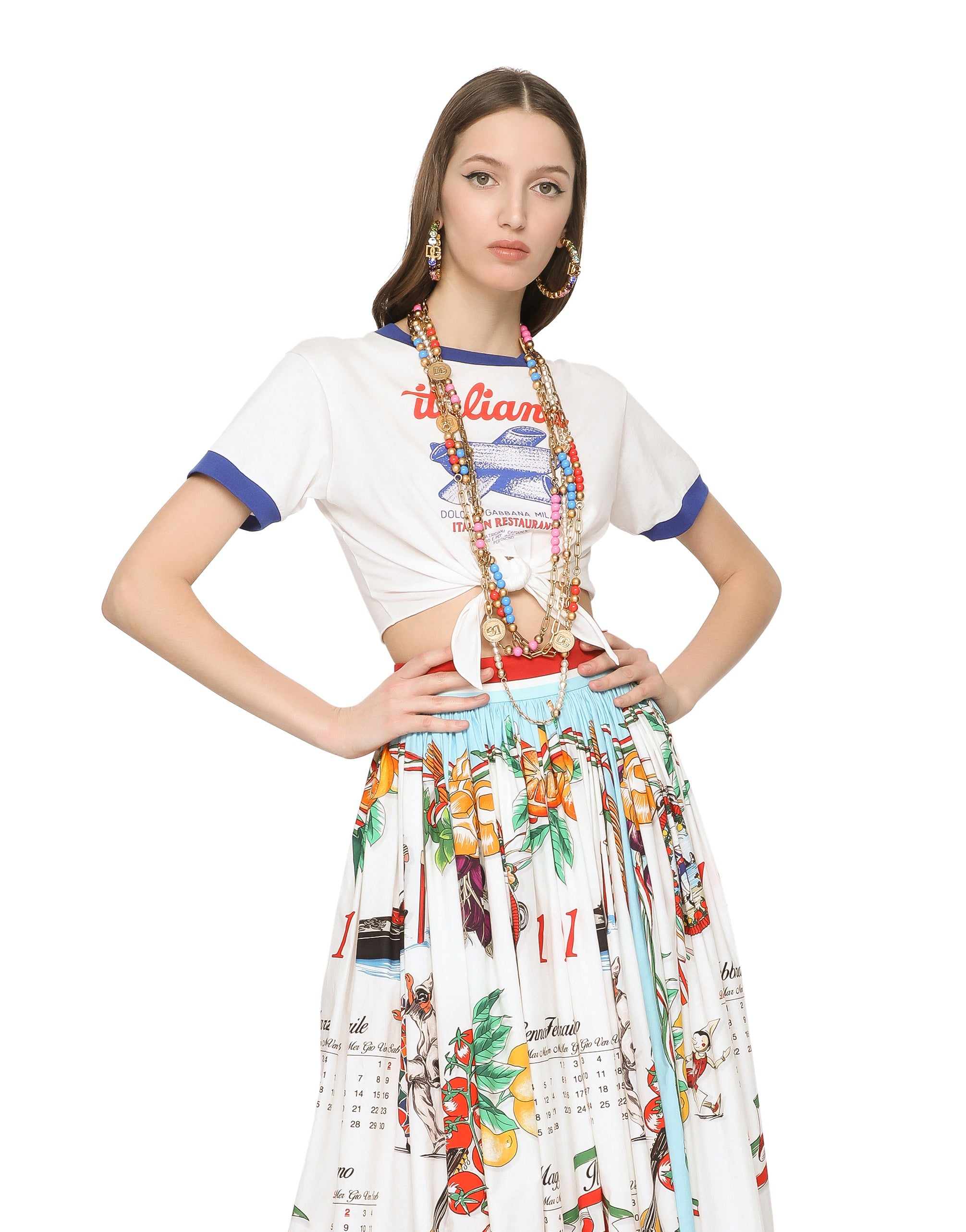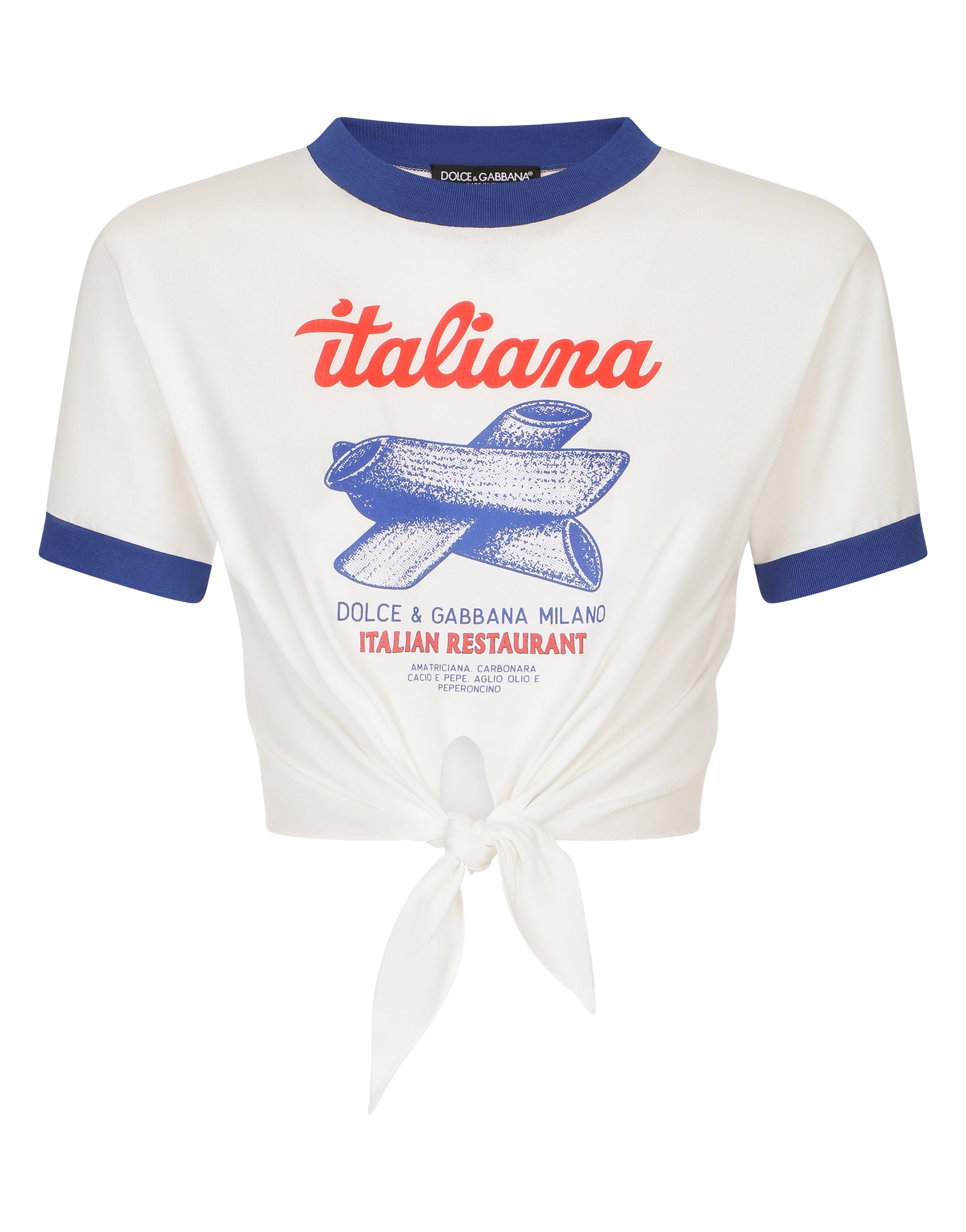 This DG-logo T-shirt with “Dolce&Gabbana Milano Italian restaurant” print emphasizes the beauty and originality of Italian culture. Coming in white cotton jersey with a knot detail on the waist, it will be the go-to garment that will add some ironic personality to your every look. • Round neck • Short sleeves • Cropped fit • The piece measures 41 cm from the rear seam on a size IT 40 • The model is 175 cm tall and wears a size IT 40 • Made in Italy
