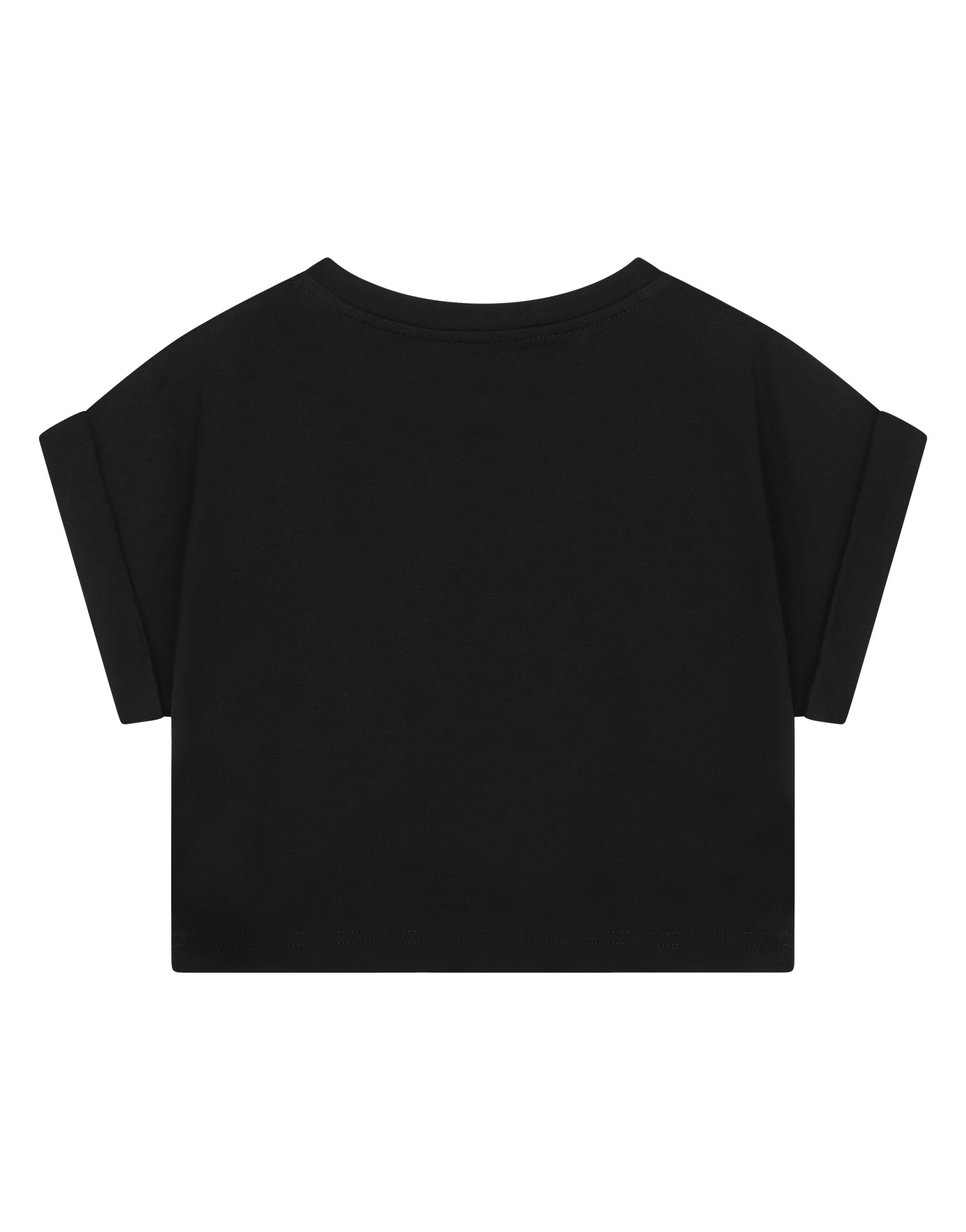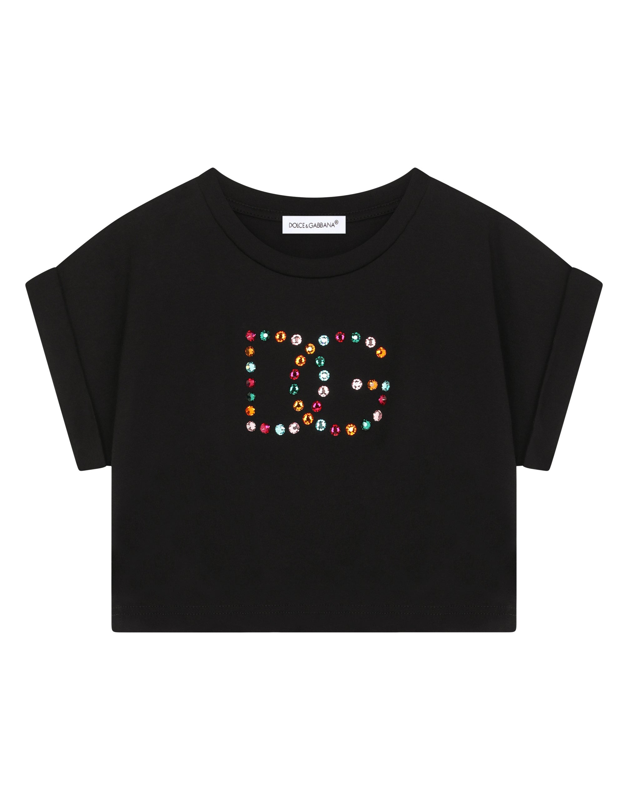 The Light Therapy theme, inspired by the illuminations of Sicilian folklore, is a message of joy and optimism, joie de vivre and fun. Multi-colored crystal and sequin appliqués steal the scene, adding sparkle to denim and black and white, a signature detail from the brand. Unique, fine and special pieces light up with scintillating colors to celebrate the feeling of light and the party atmosphere. This soft cotton jersey T-shirt with the DG logo featuring multi-colored crystals is perfect for every occasion. • Cropped fit • Round neck • Short turn-up sleeves • The item in the size 3 years measures 30 cm - 11.8 inches from the shoulder seam • Made in Italy