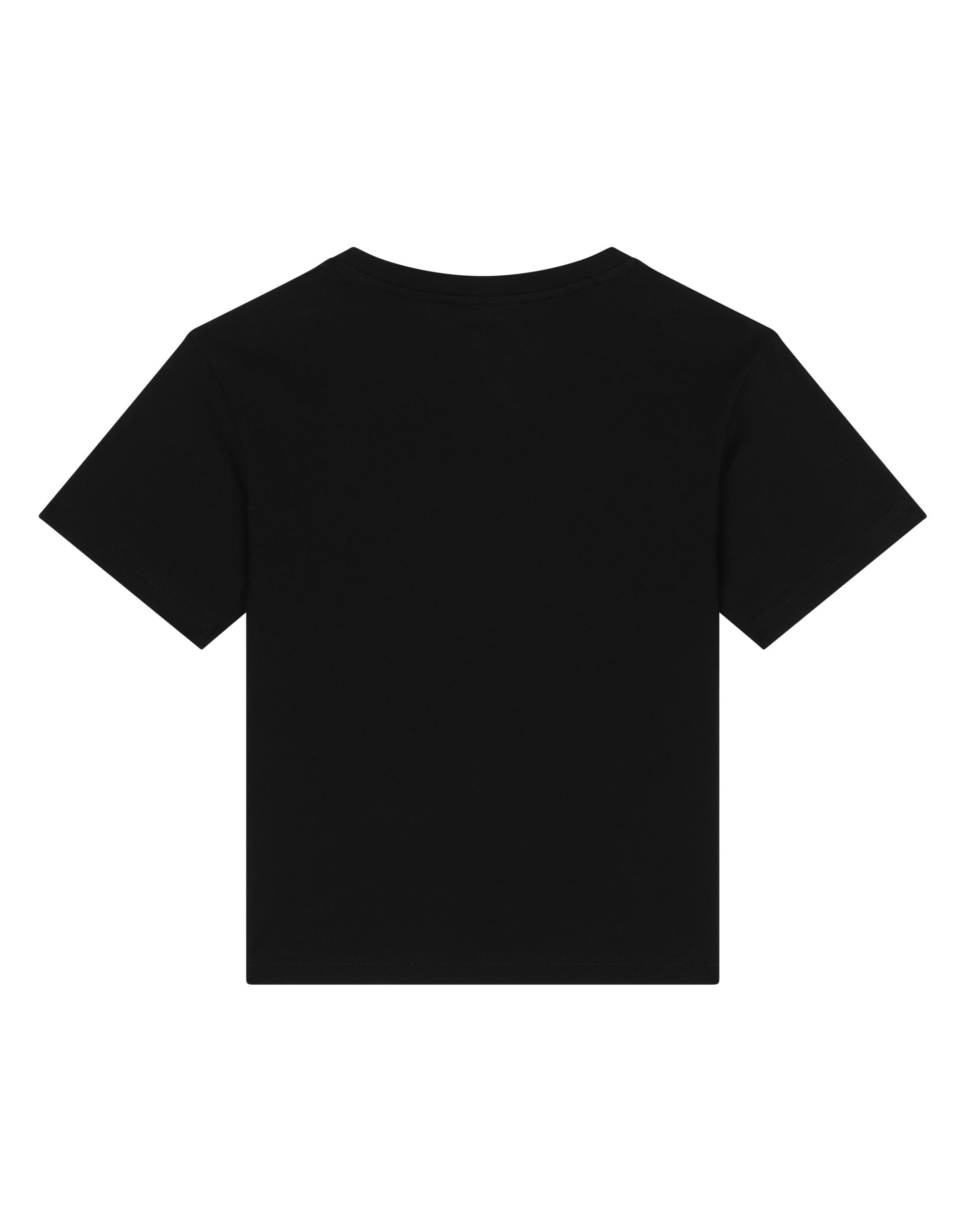 The girl’s Prateria Collection is inspired by the women’s 2001 New Hippy Collection, where the desert and meadows become bohemian and glamorous. Vaguely vintage/grunge looks come made up of volume and special pieces flaunt light printed and solid-color fabric details, smock stitching, corduroy, faux fur and a print distinguished by delicate and joyful multi-colored wildflowers for fun and ironic little girls. Jersey T-shirt with screen print: • Black •Regular fit • Round neck • Short sleeves • The item in the size 6 years measures 49.5 cm from the shoulder seam • Made in Italy The difference in the print placement that you may find on this product is a feature of Dolce&Gabbana’s “Handmade” pieces. A detail that makes every garment or accessory unique and exclusive.