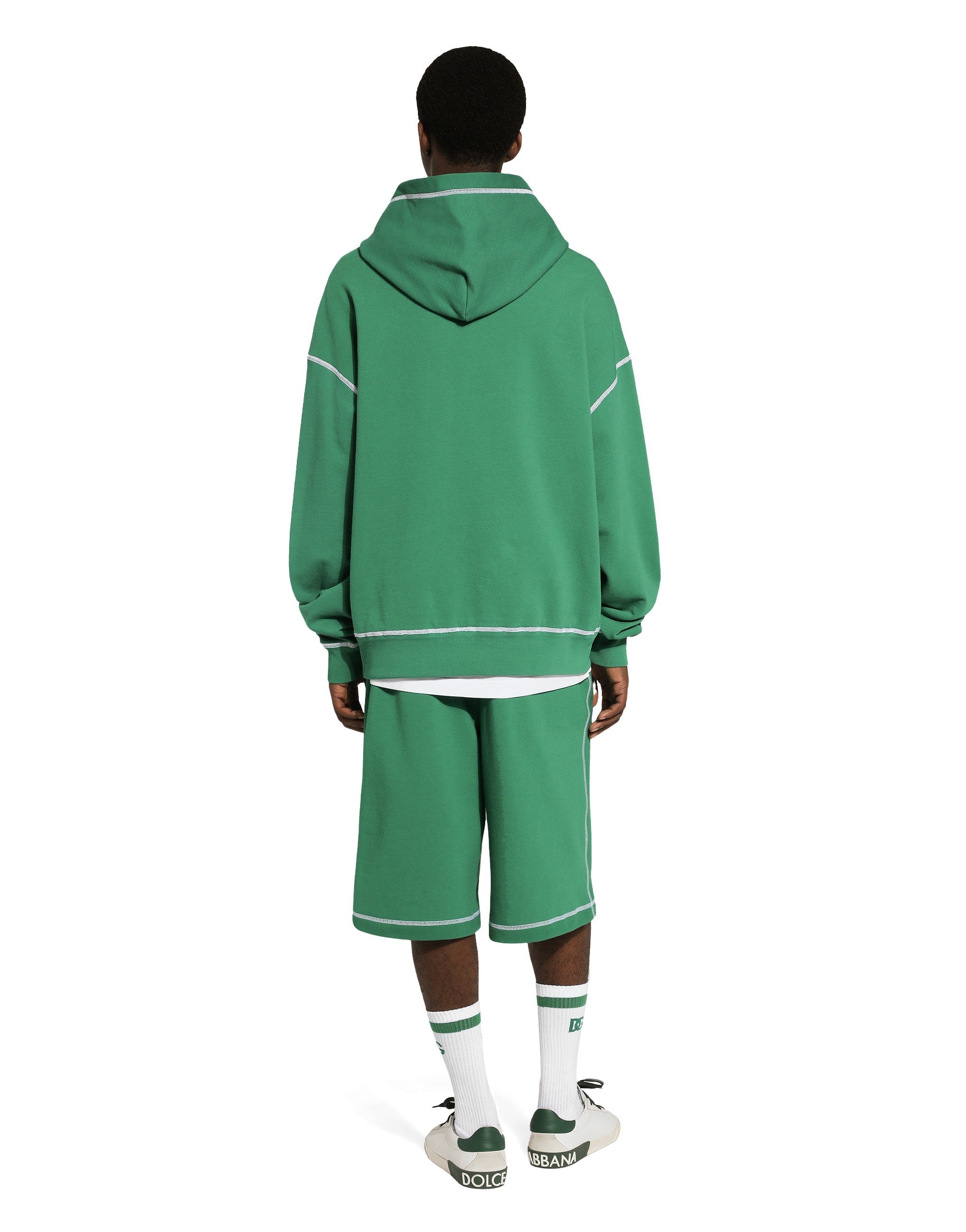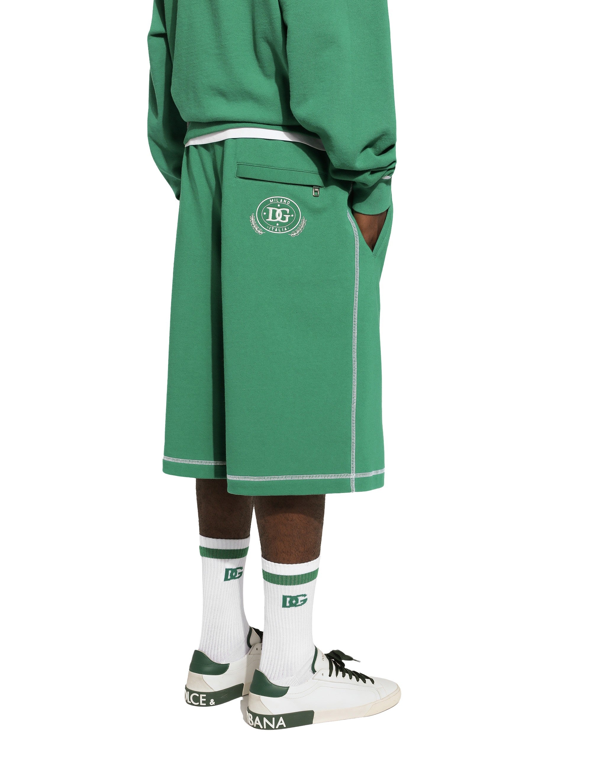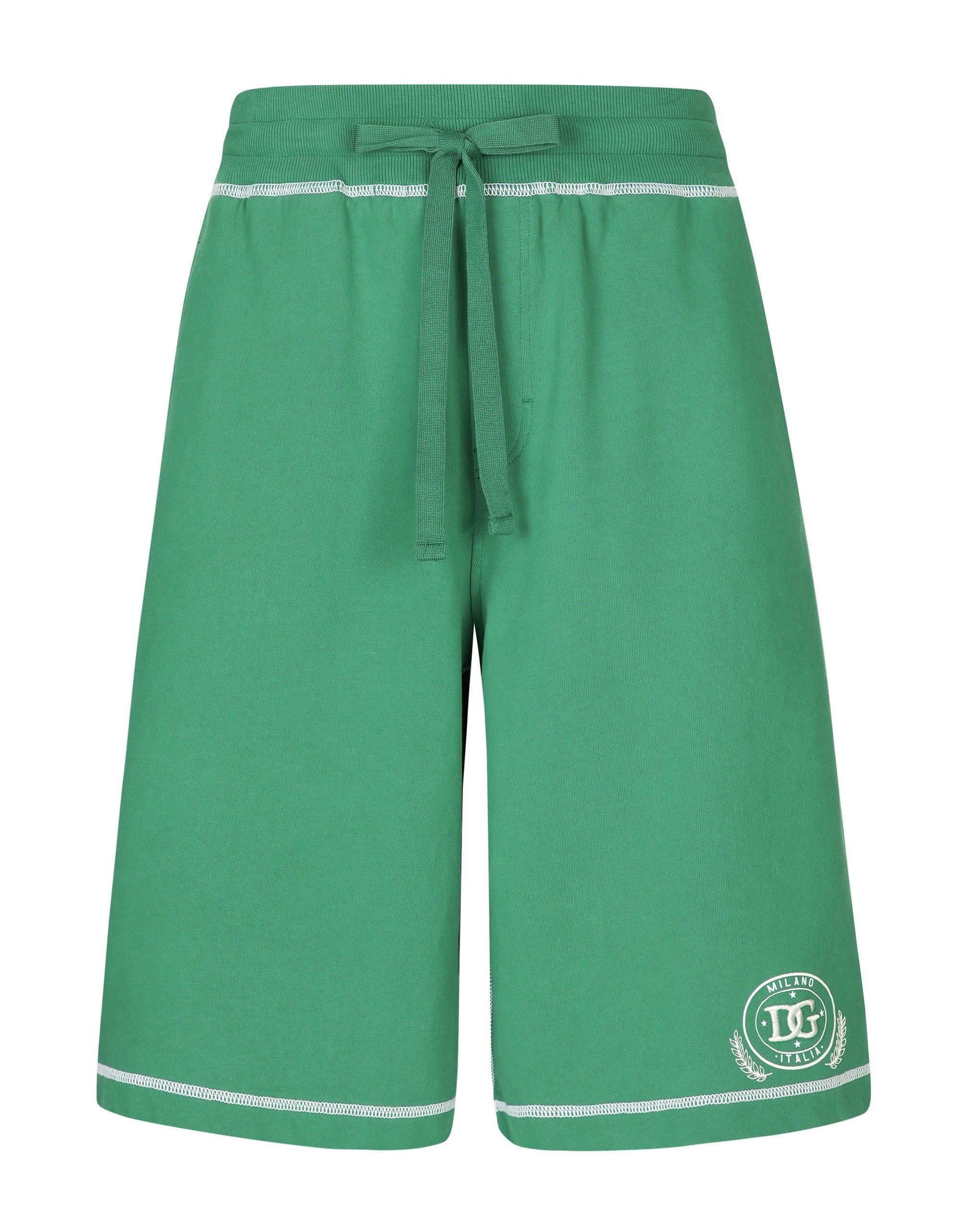 Pictorial, at times volumetric with a textured effect, the decorative “calligraphic-naturalistic” majolica in solid-color green gives life to a collection distinguished by eclectic silhouettes, some stolen from the world of sports, with a cool and light vibe. The vibrant two-tone accenting – green and white – is designed to enhance a series of details, such as the pockets, the green piping paired with the white silk pajamas, the stripes on the polo-shirts, the cuffs on the shirts or the jersey inserts on the T-shirts. Cotton jersey jogging shorts: • Green • Regular fit • Stretch waistband with drawstring • Dolce&Gabbana logo embroidery • Front welt pockets and back welt pocket with zipper • The item measures 63 cm on the outer leg and the hem is 37 cm wide on a size IT 48 • Made in Italy