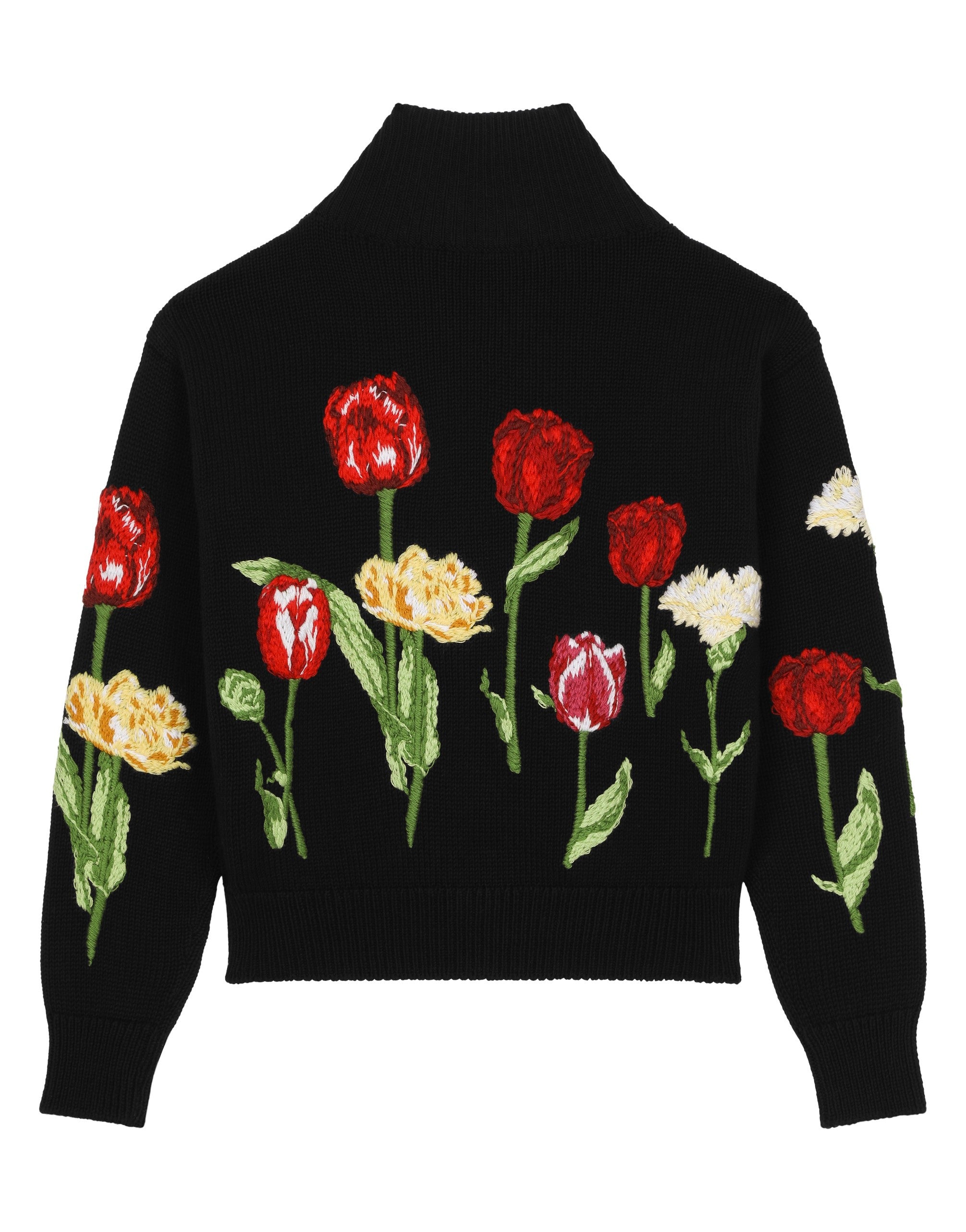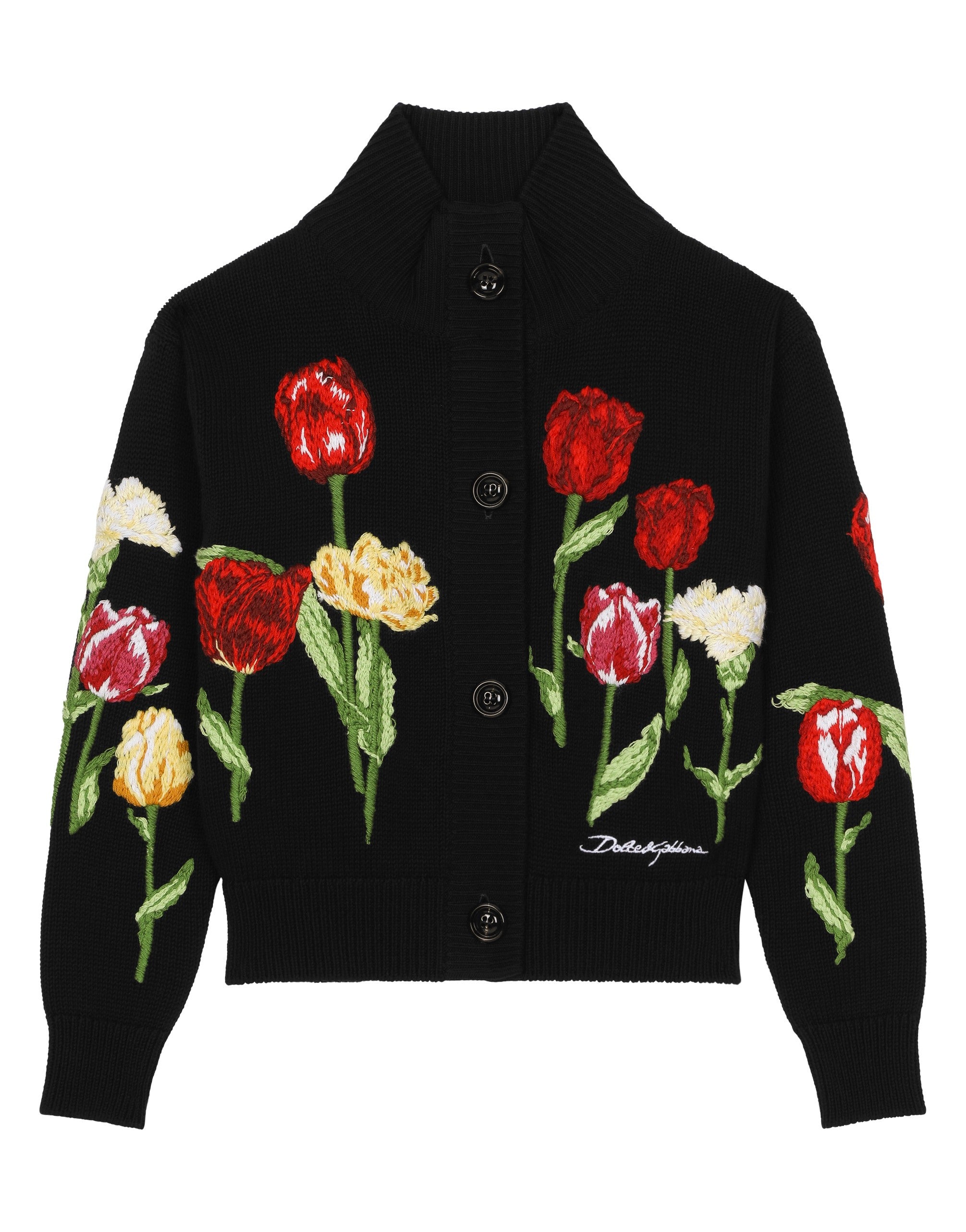 The 2024 Boy’s and Girl’s Back to School collection is reworking the Anglo-Saxon imagery of British boarding schools in full Dolce&Gabbana style. From floral prints to bright hues, like ruby red, as well as more subdued tones of navy blue, white and stone gray, the collection delivers a mix of pairings, embroidered details and pop prints that will add some verve to closets that merge functionality with fun. A tribute to freedom of movement that invites children to be bold and carefree when mixing and matching the pieces. Plain-knit wool cardigan with embroidered tulip details and Dolce&Gabbana logo: • Blue • Regular fit • Turtle-neck • Lined sleeves with stretch knit cuffs • Branded button fastenings on the front and a stretch knit trim • The item in the size 6 years measures 42 cm from the shoulder seam • Made in Italy