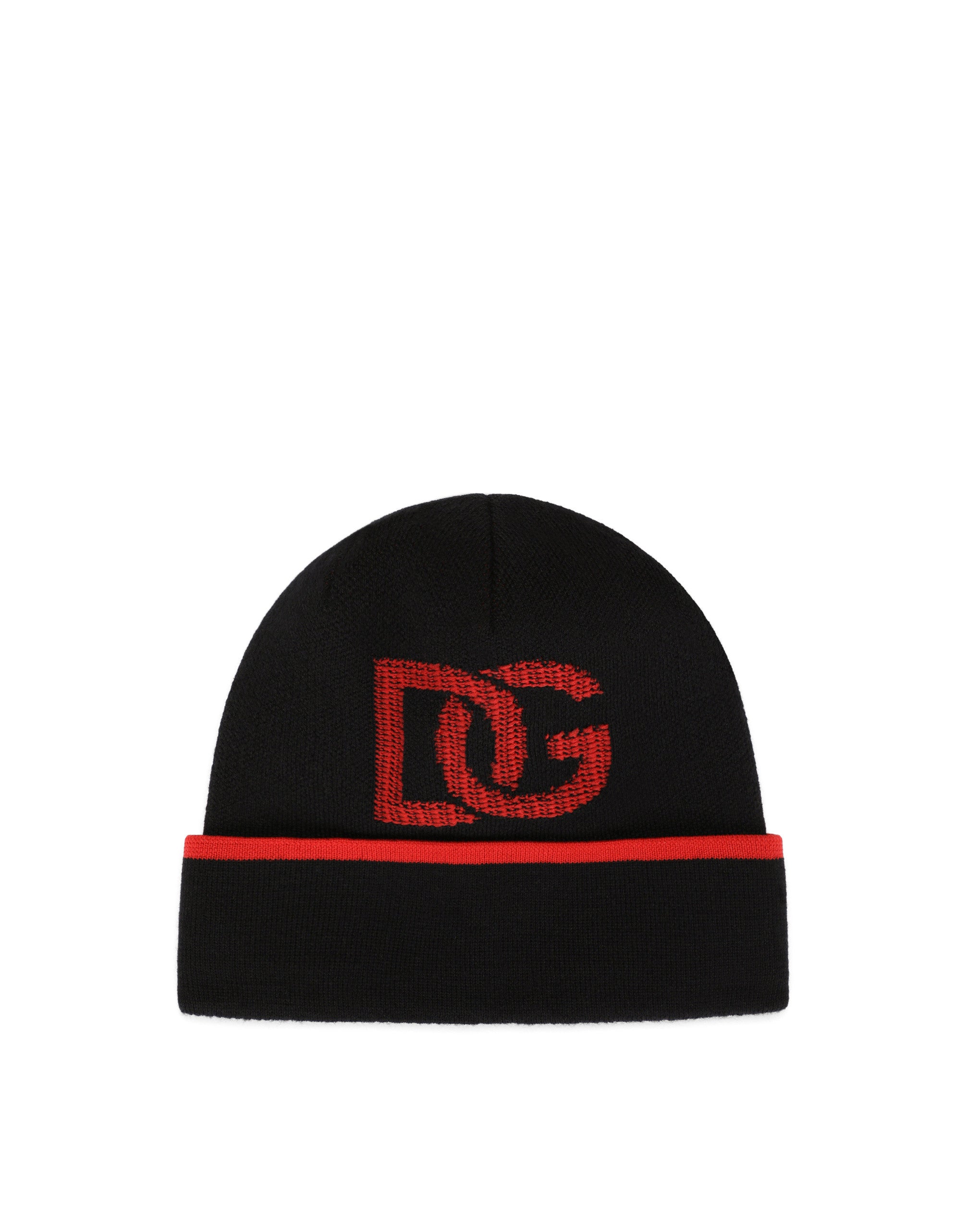 Dolce&Gabbana is presenting the Animalier theme, in which the iconic leopard print has evolved into an original and unusual version. Red is the absolute star together with the brand’s iconic details, combined in a new vision of streetwear with a whole lot of personality. A movement of energy and style is unleashed through color, giving life to a contemporary, sporty image with boundless uniqueness. This plain knit hat features the jacquard DG logo. • 12-gauge knit • Made in Italy