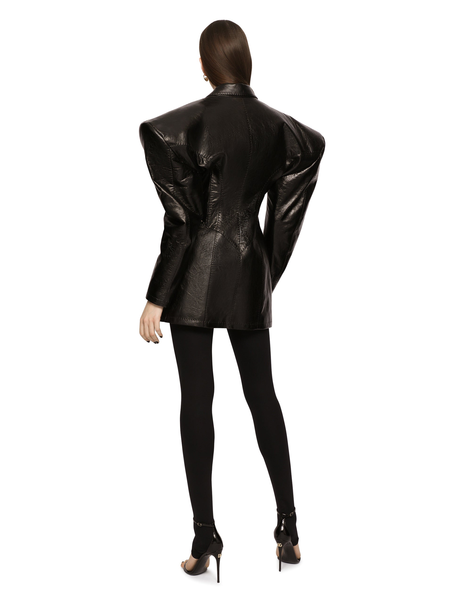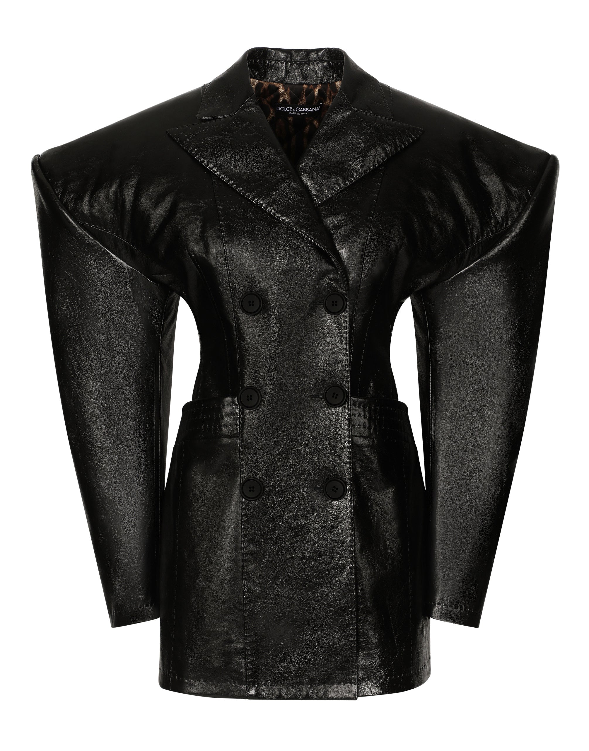 Dolce&Gabbana is presenting a futuristic vision of its signature aesthetic in this collection. Sicily and our iconic Nero Sicilia are being reworked and catapulted into the digital world of the metaverse. Women transform into heroines of a video game by wearing pieces, such as this leather jacket with geometric volume and shoulder pads, that reinforce their style and uniqueness. • Peak lapels • Long sleeves • Oversize shoulders • Pockets with top-stitched welt • Leopard-print quilted stretch satin lining with light wad padding • Branded Galalith button fastenings • The piece measures 78 cm from the rear collar seam on a size IT 40 • The model is 175 cm tall and wears a size IT 40 • Made in Italy