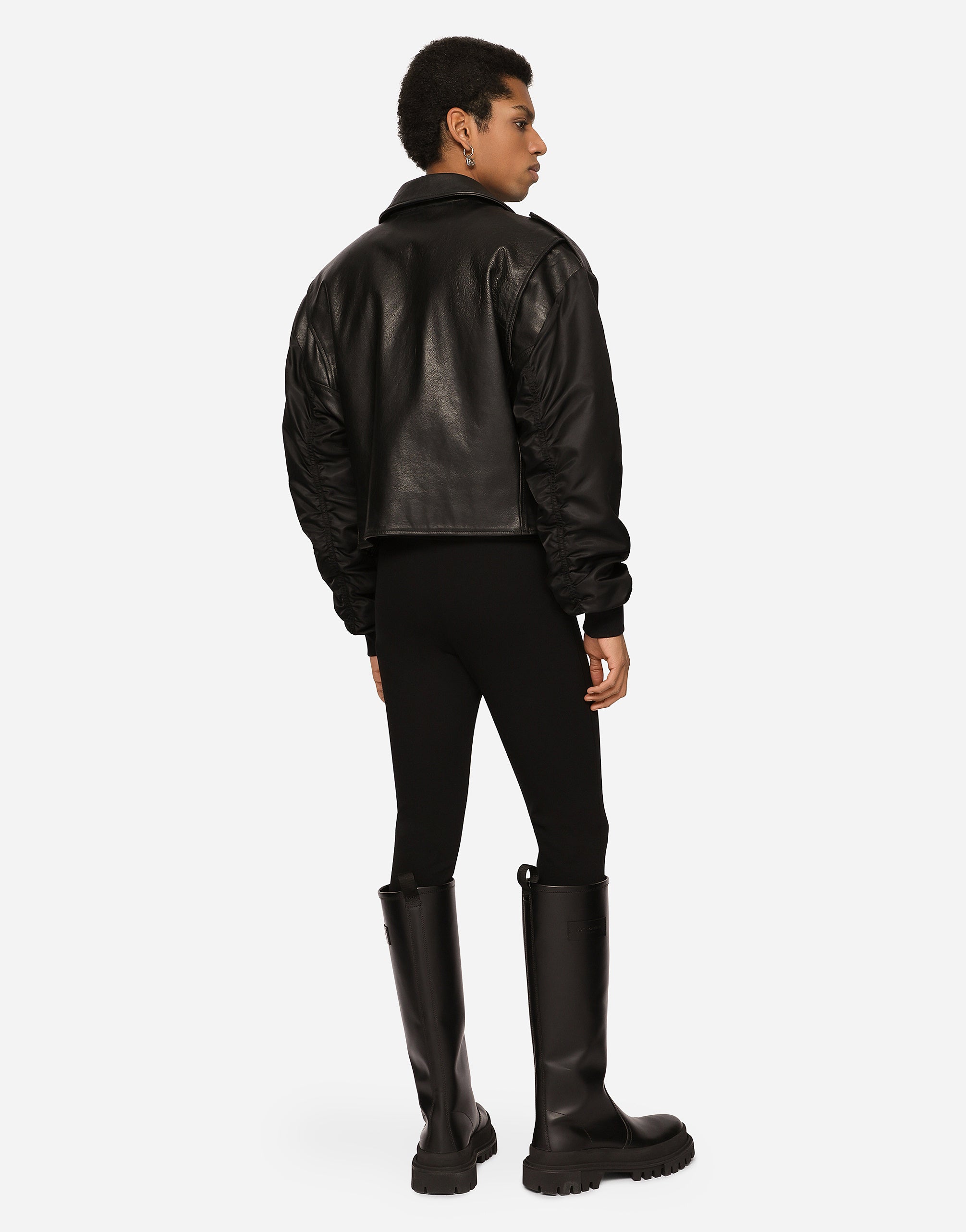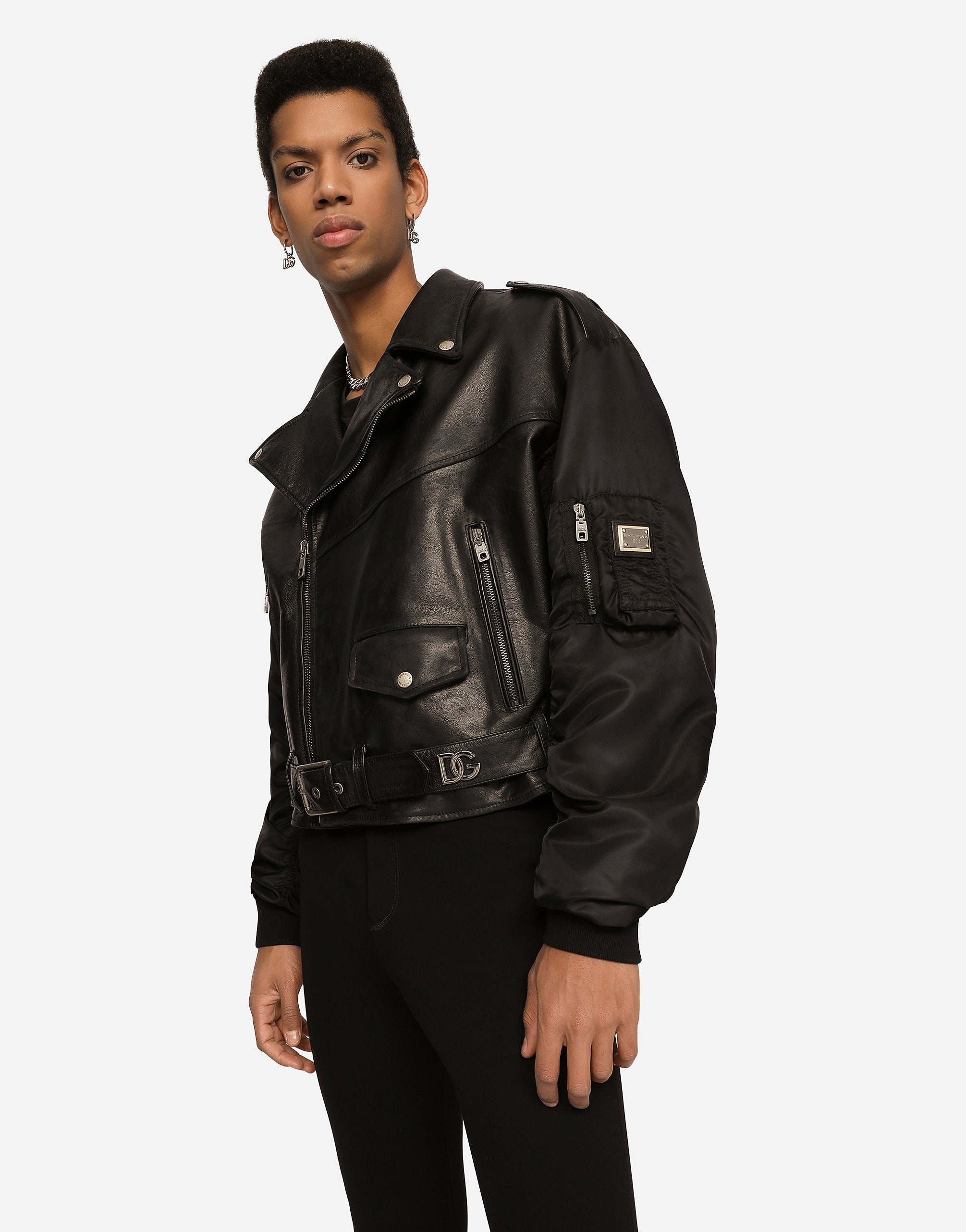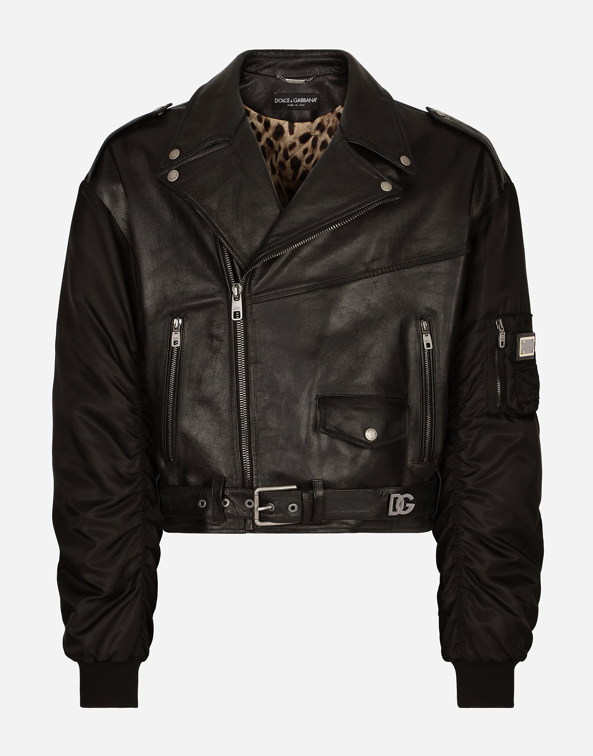 The “Dark Side” Collection is inspired by the Punk Rock movement that was on the rise in England and the United States in the mid-70s. Looking at Punk, Dolce&Gabbana is paying tribute to the legends of entire generations, celebrating uniqueness, individuality and provocation by making men free to express themselves with the language of today. Bullskin jacket with nylon sleeves and the metal DG logo. • Regular fit • Front zipper fastening • Zipped outer welt pockets and breast pocket with flap and button, inner welt pockets with zipper • Stretch knit cuffs • Leopard-print lining • The piece measures 54 cm from the rear collar seam on a size IT 48 • The model is 185 cm tall and wears a size IT 48 • Made in Italy