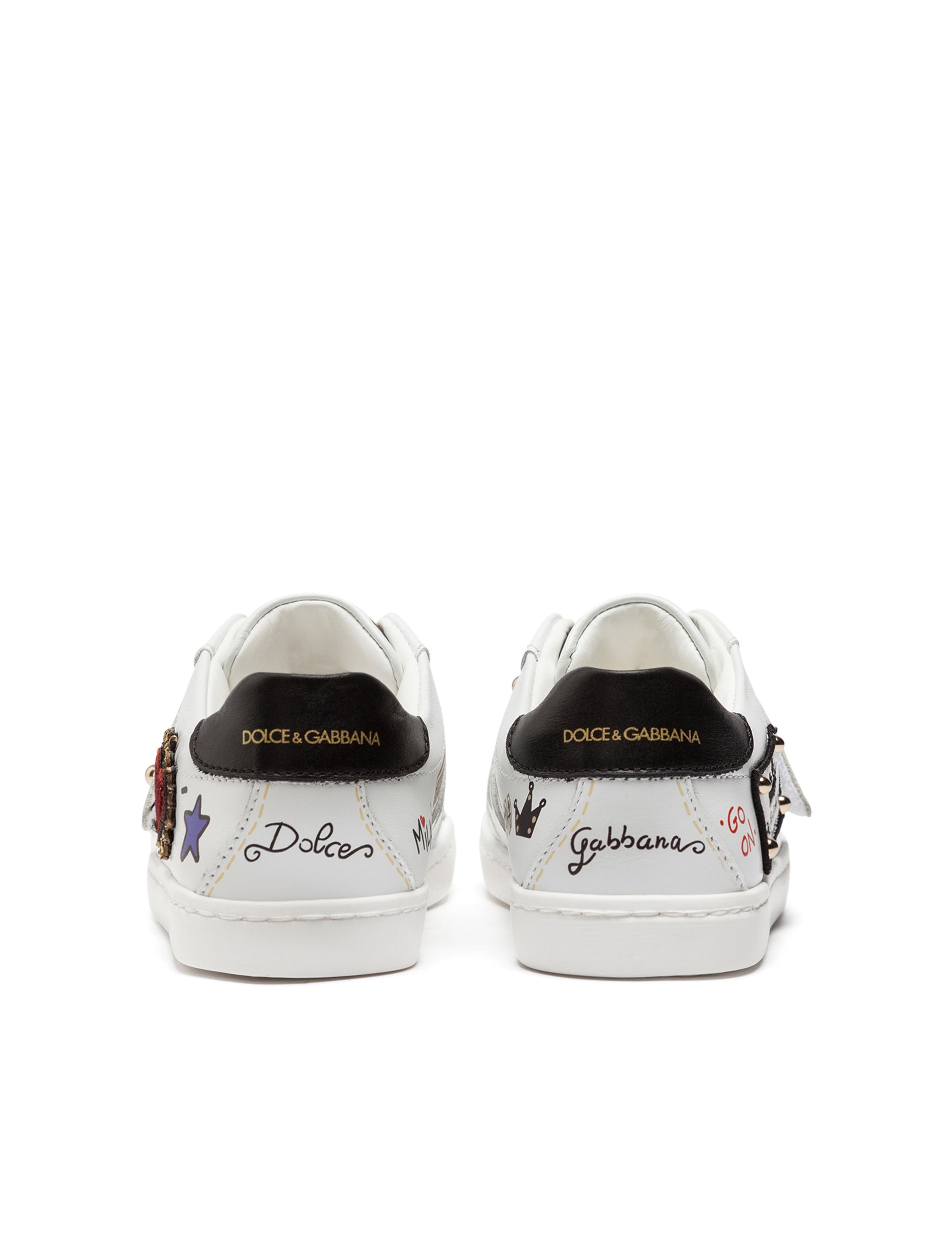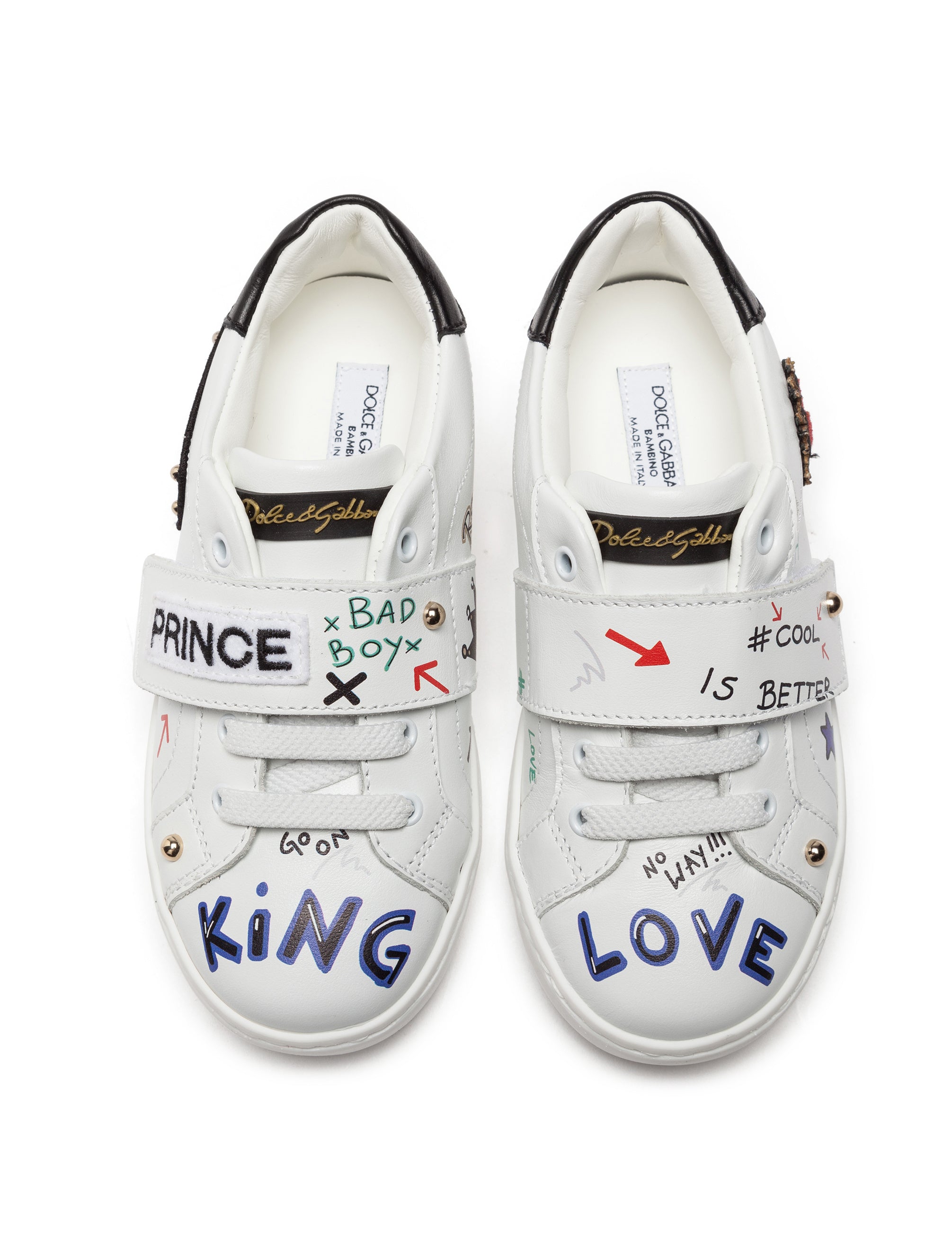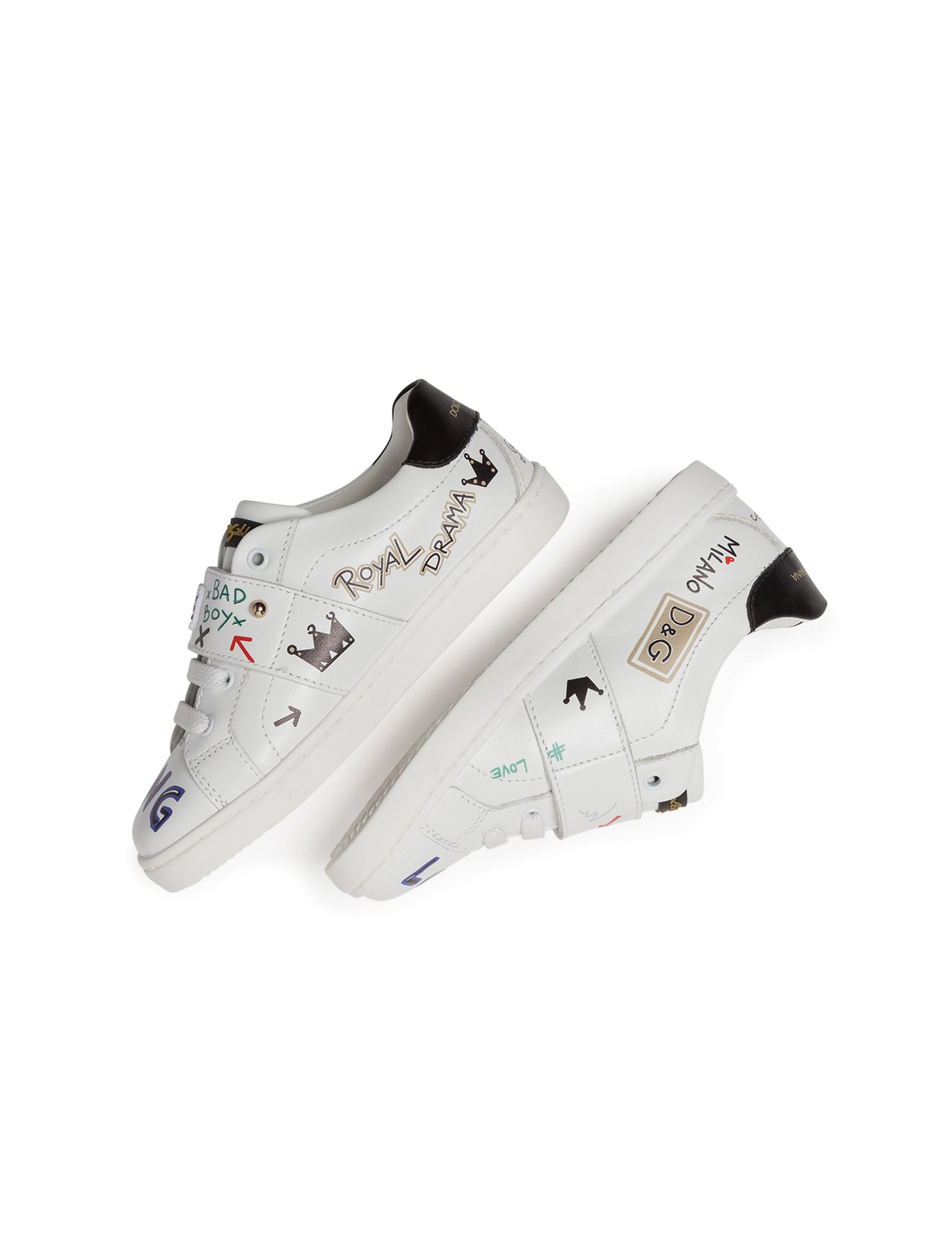 The Dolce&Gabbana men’s collection is reinterpreted in miniature size for little gentlemen. Leather sneakers with print: • Leather upper • Flat laces • Insole with logo on label • Rubber sole with logo on back • Made in Italy External composition: 100% Calfskin leather Internal composition: 100% Calfskin leather