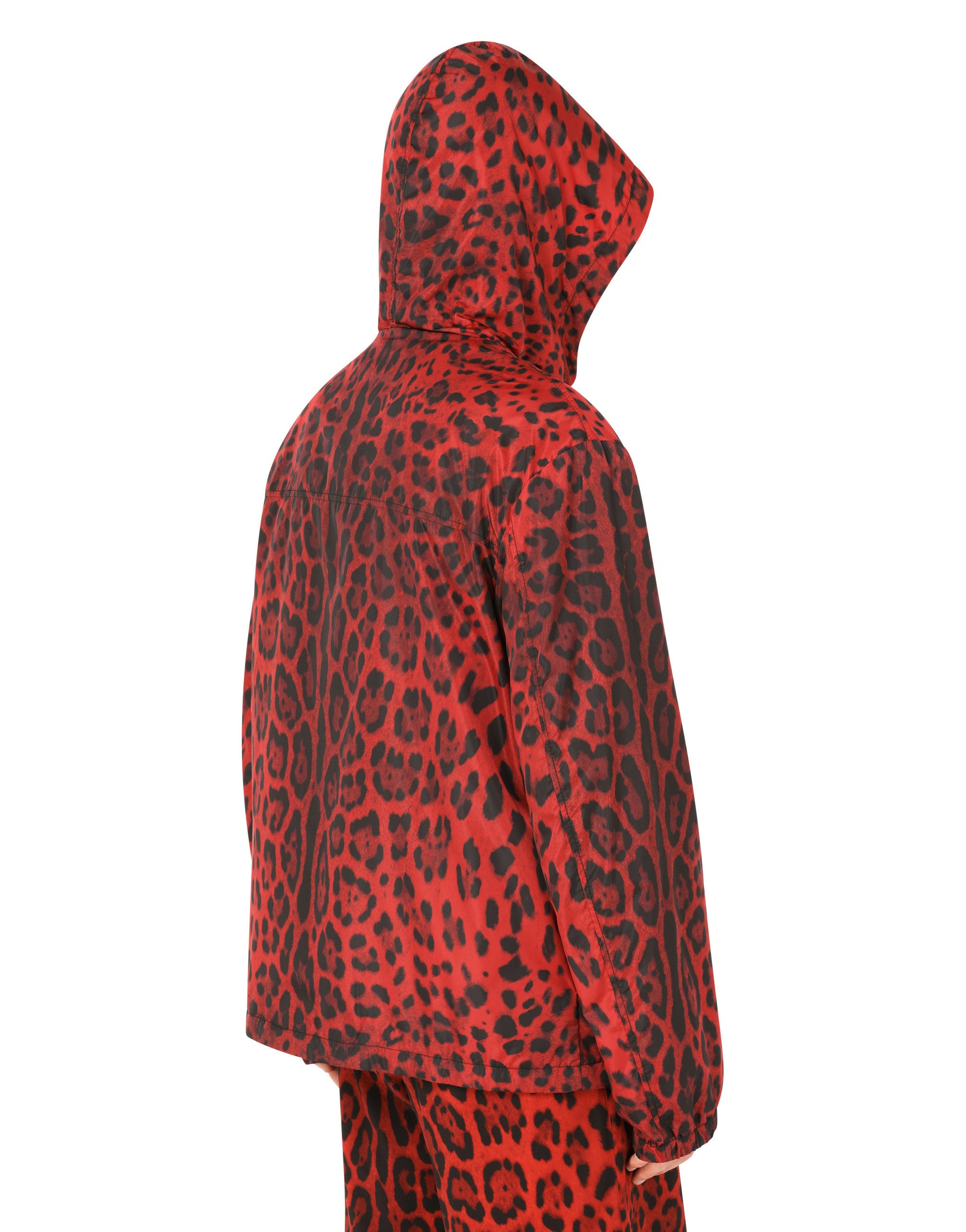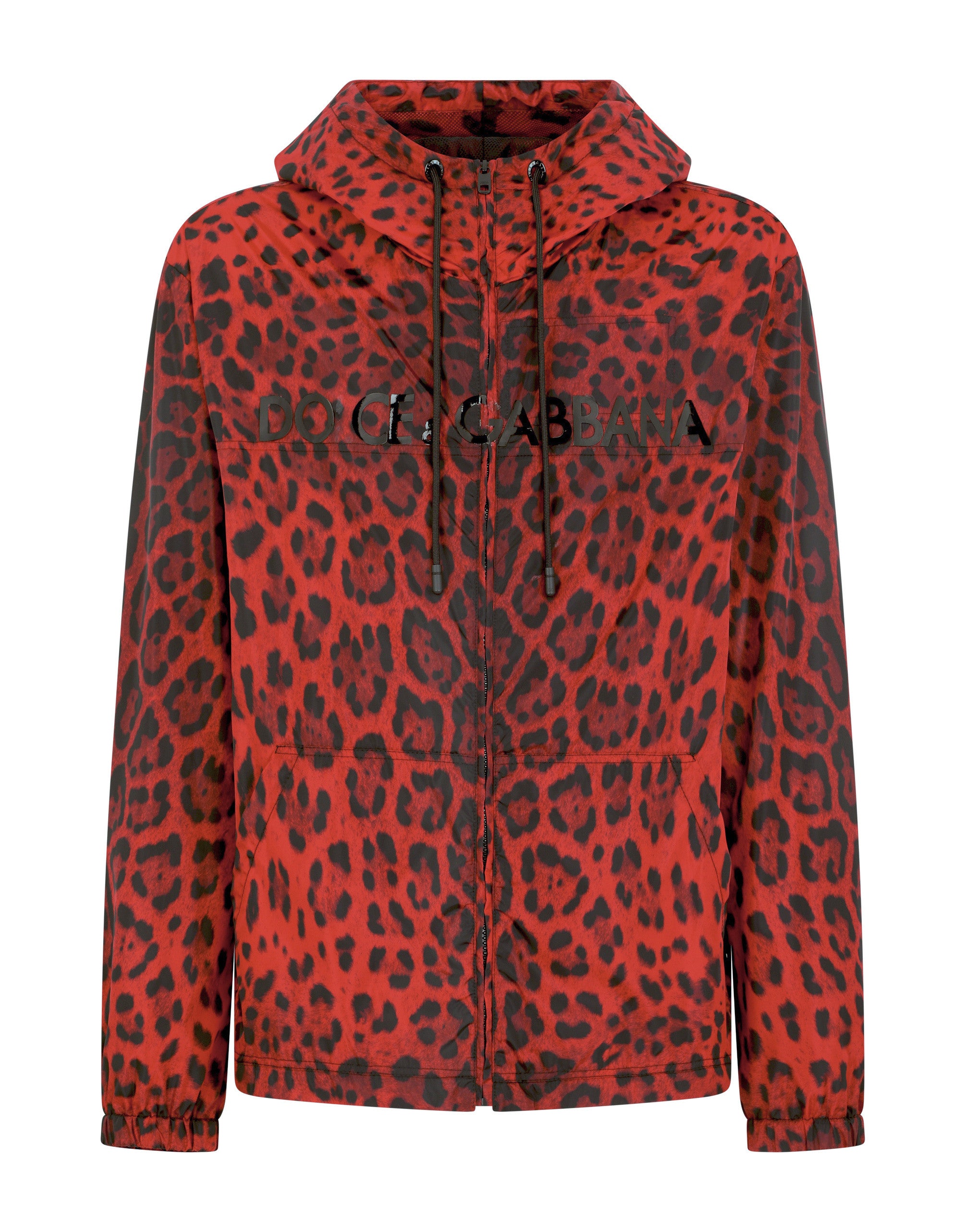 Leopard-print nylon jacket with hood and Dolce&Gabbana logo. • Regular fit • Drawstring hood with branded metal aglets • Covered zipper fastening on the front • Front pouch pockets and zipped welt pockets on the interior • Stretch cuffs • Mesh lining • The piece measures 71 cm - 28 inches from the rear collar seam on a size IT 48 • The model is 185 cm - 72.8 inches tall and wears a size IT 48 • Made in Italy