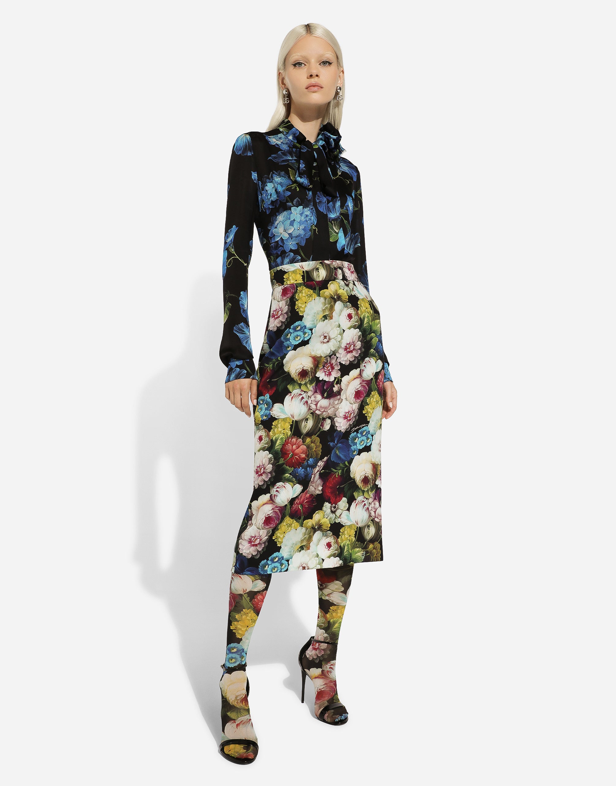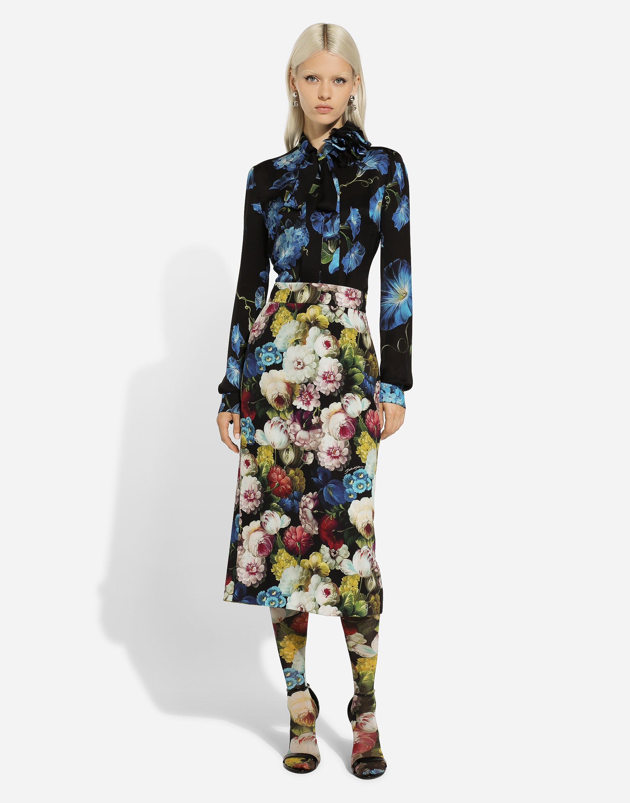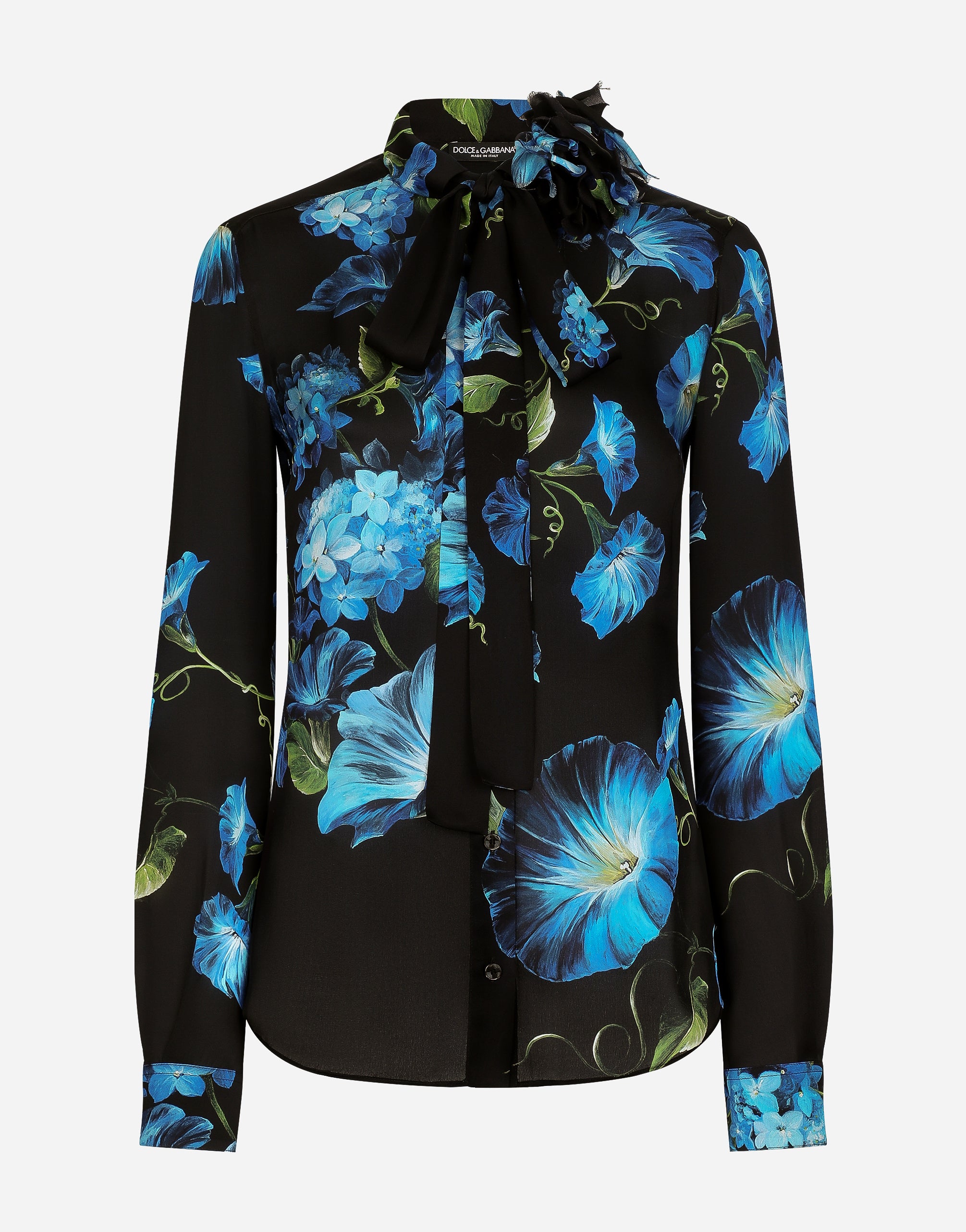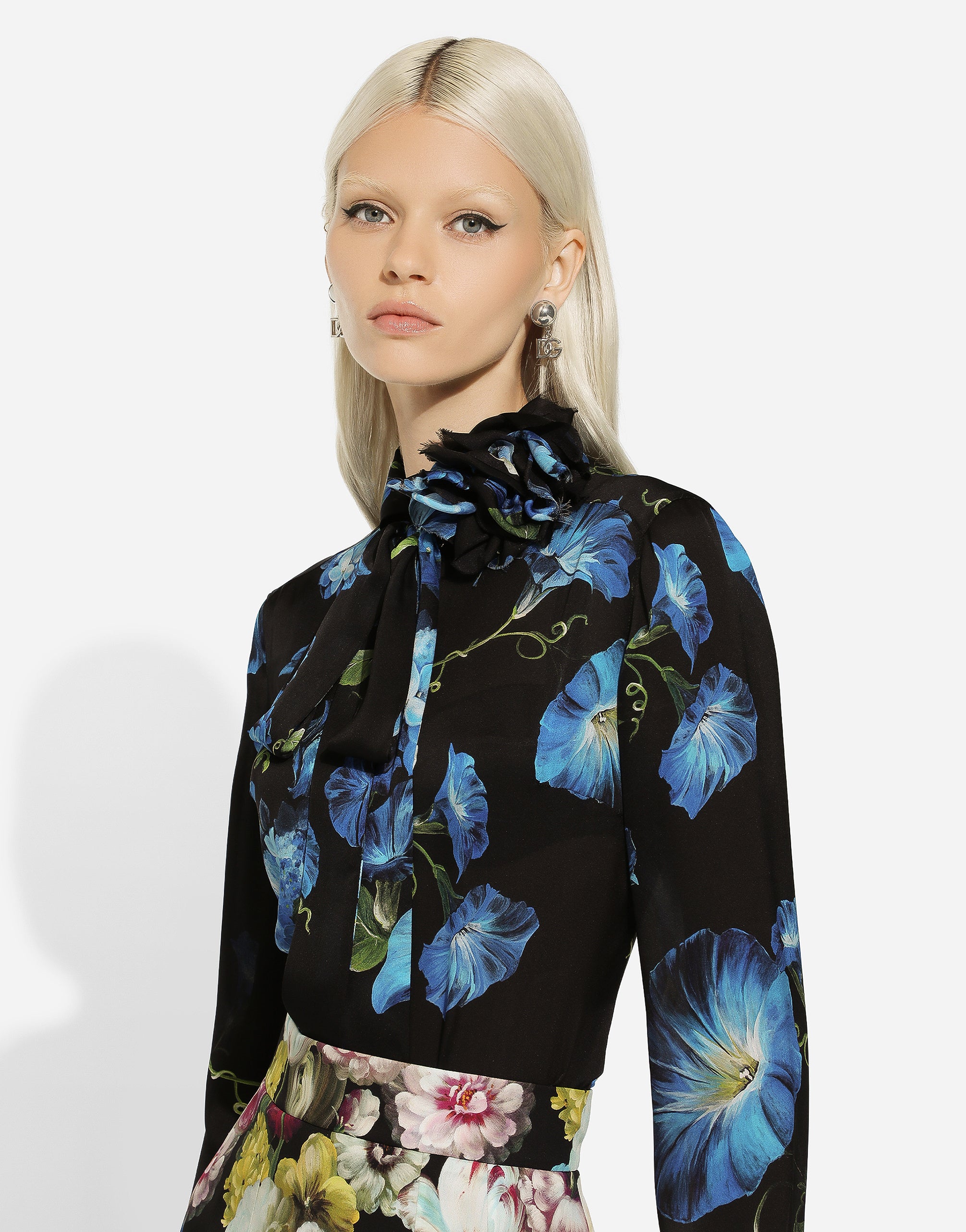 The spirit of the 1960s is taking over the new Flower Power collection. The focus is a head-to-toe floral look built around pairing and layering rose, anemone and floral bouquet maxi-prints. A cosmopolite poised between playful and sexy, this women interprets the austerity and elegance of the 1960s, harking back to boldly opulent imagery that here at Dolce&Gabbana is condensed and reinterpreted through silhouettes, ample proportions and airy shapes, bringing femininity and sensuality to the forefront. Light satin shirt with bluebell print and flower appliqué: • Multi-colored • Pussy-bow and detachable flower detail • Long sleeves • Regular fit • Button fastenings with branded bottom edge • The piece measures 66 cm from the center back on a size IT 40 • The model is 175 cm tall and wears a size IT 40 • Made in Italy The difference in the print placement that you may find on this product is a feature of Dolce&Gabbana’s “Handmade” pieces. A detail that makes every garment or accessory unique and exclusive.