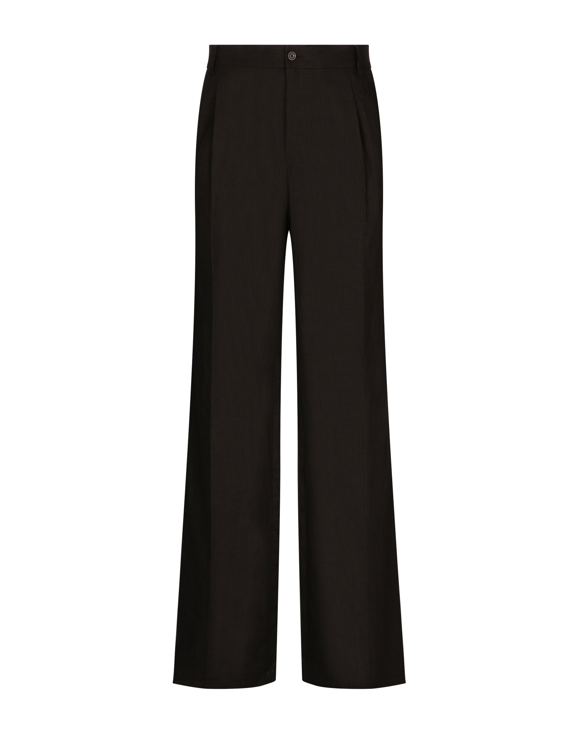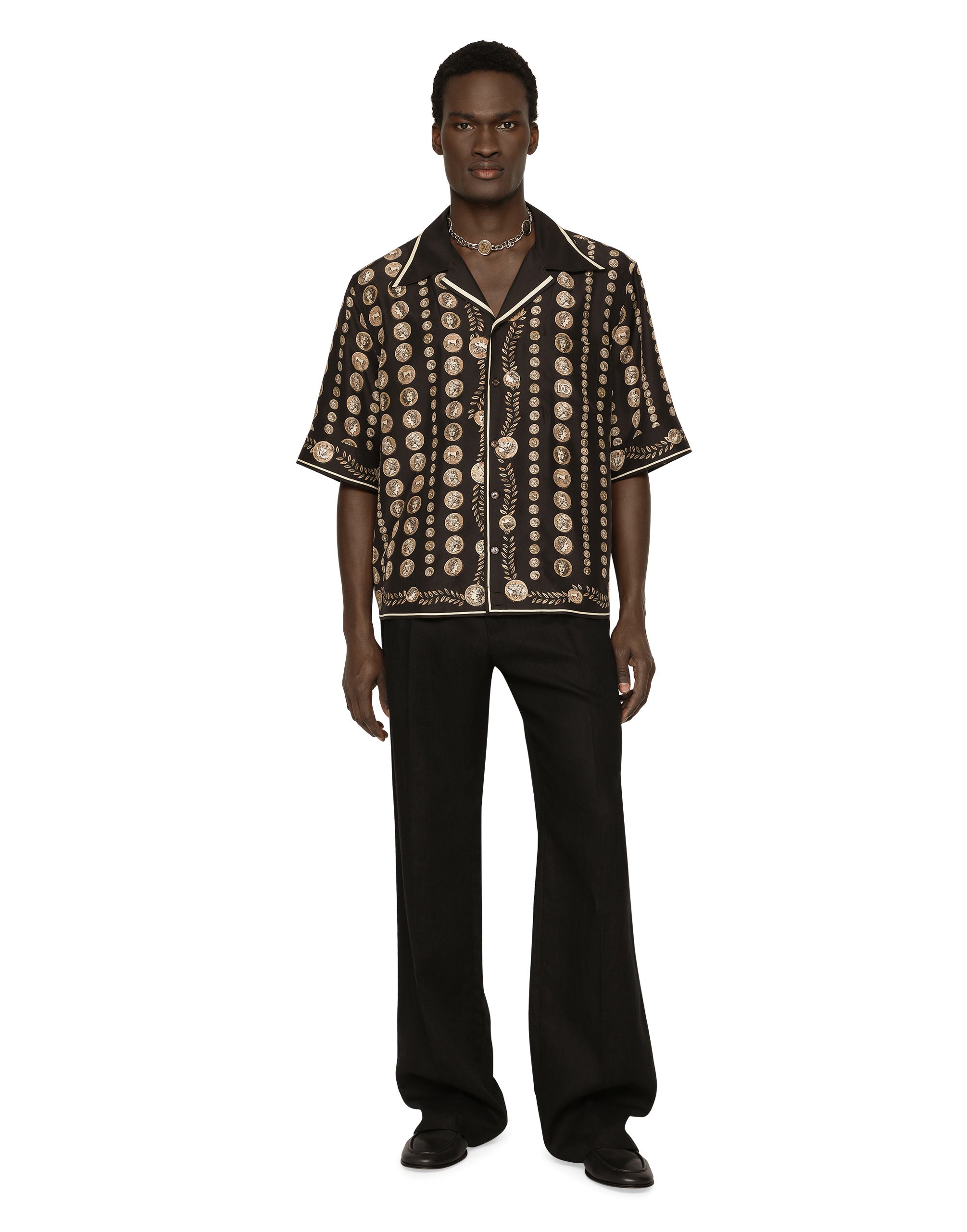 In all its beauty and modernity, the Roma collection presents an interpretation of the grandeur of Rome, whose cultural roots have made us unique in the world. The designers pay homage to masculine beauty and hedonism, reinventing and creating special pieces that make up a single total look, composed of monochrome silhouettes with Roman coin-print accents, where engraved images of great emperors stand out against the unified background, for a visual result that is streetwise, young and confident. Linen pants: • Black • Regular fit • The model is 185 cm tall and wears a size IT 48 • Made in Italy