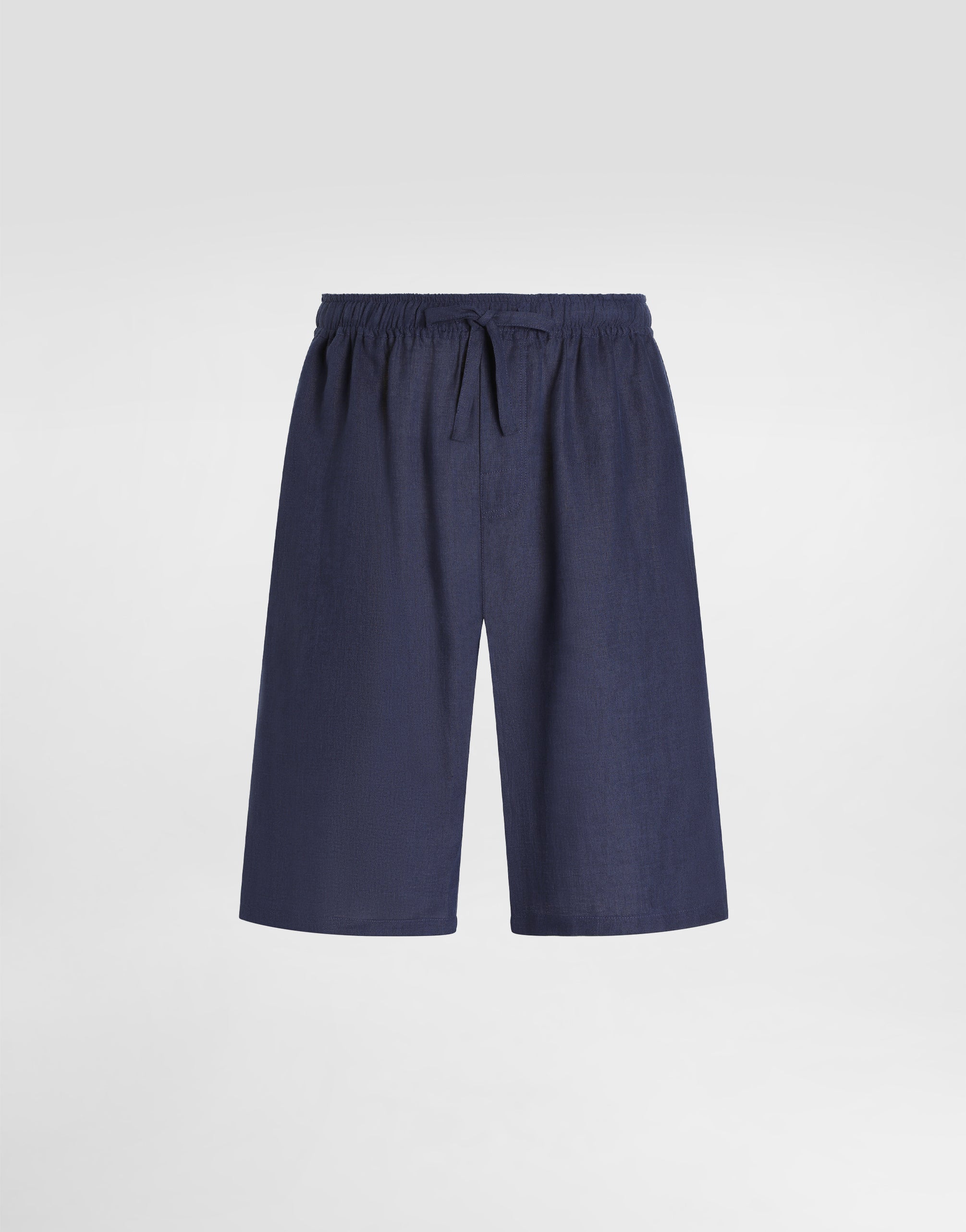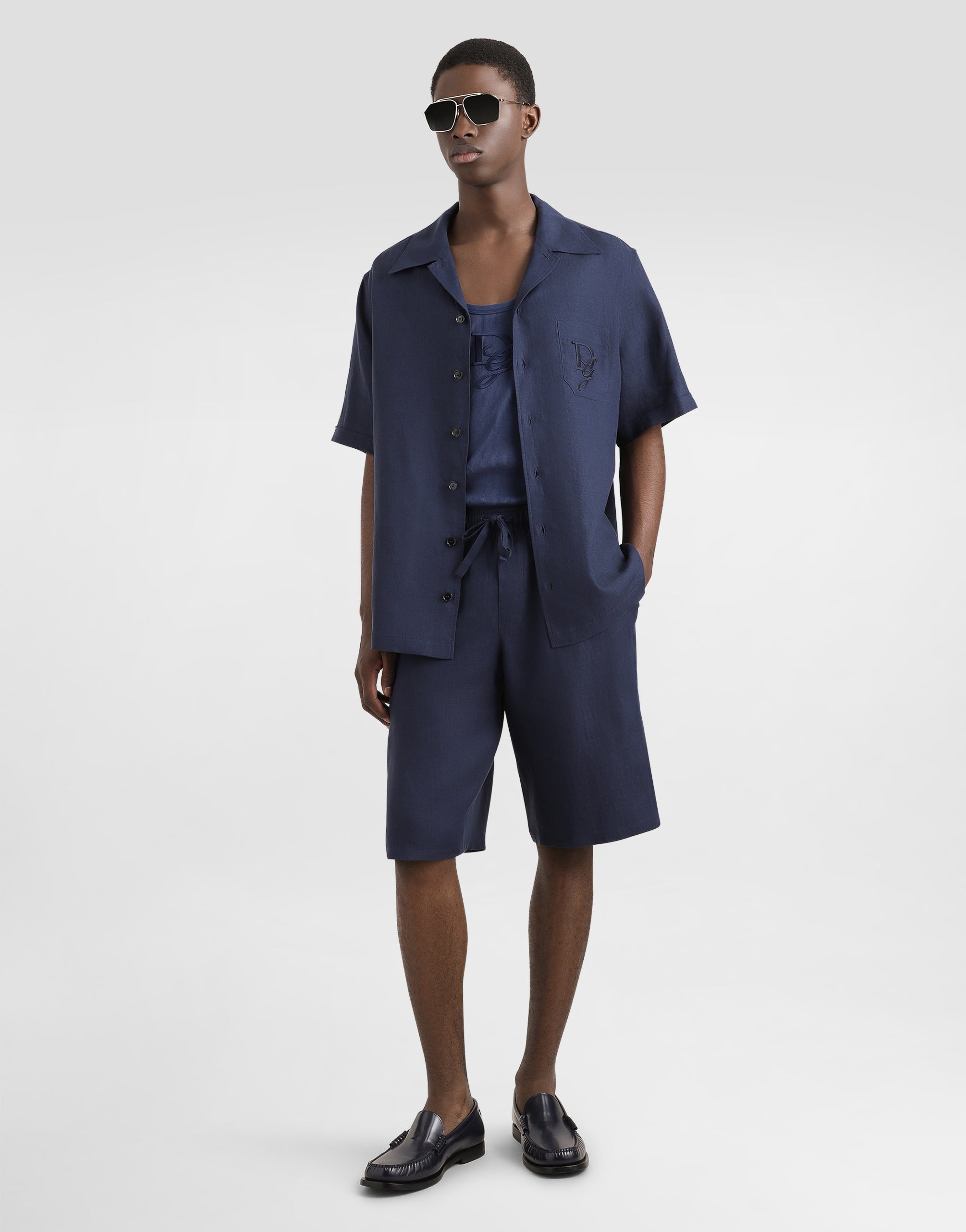 The Italian Holiday Men's Collection revisits 1950s style with a blend of relaxed fits and modern flair. Classic white shirts and tailored suits in refined fabrics contrast with casual denim and playful T-shirts featuring retro graphics with a futuristic twist. Bold prints—chessboards, cats, elegant lighters, and Mediterranean blue ribbons—alongside logo jacquard inspired by ties, infuse a contemporary edge into the essence of Italian holidays. Linen shorts with tonal DG logo embroidery: • Blue • Regular fit • Stretch waistband with drawstring • Front slant pockets and back pocket • The item measures 58 cm on the outer leg and the hem is 32 cm wide on a size IT 48 • Made in Italy