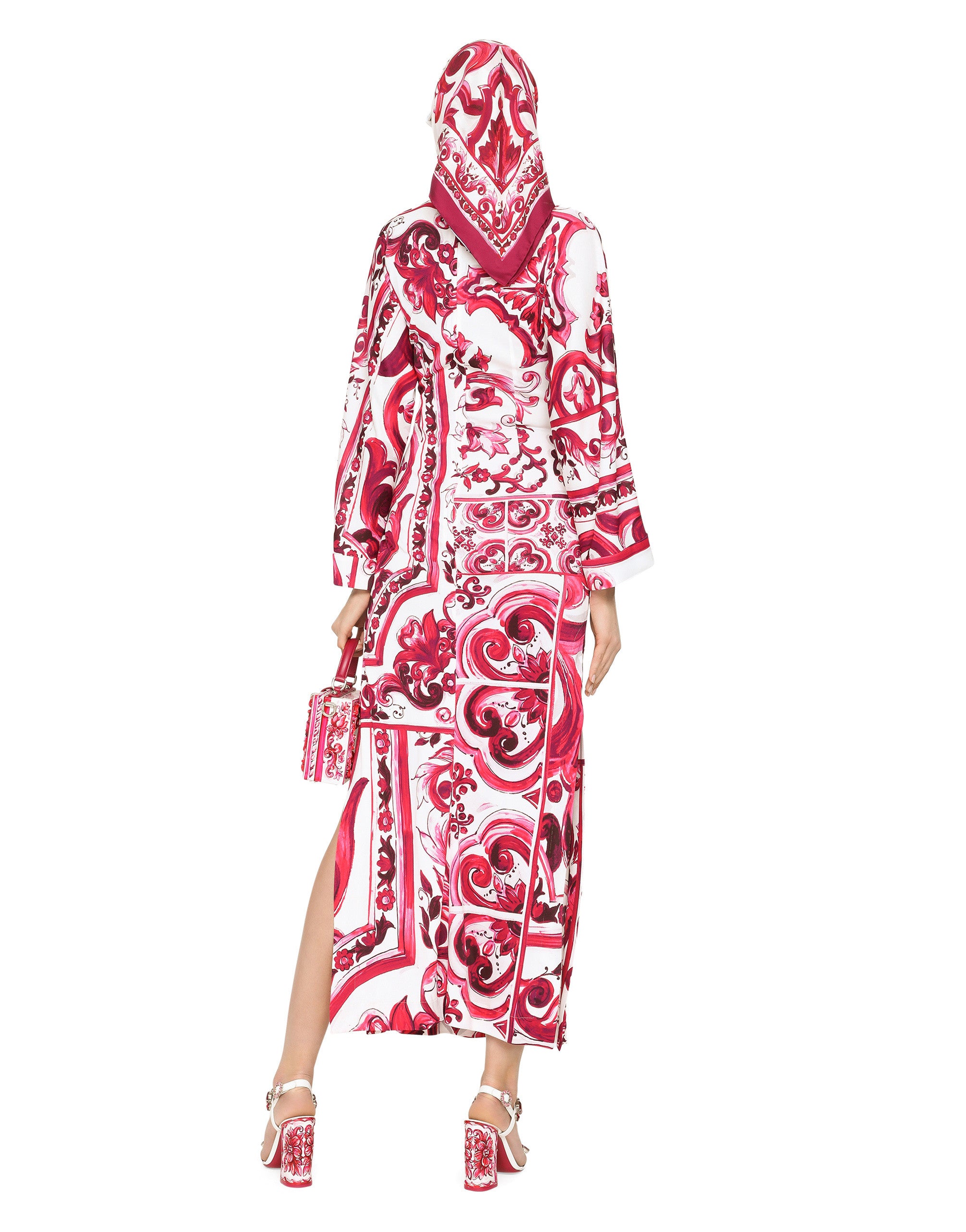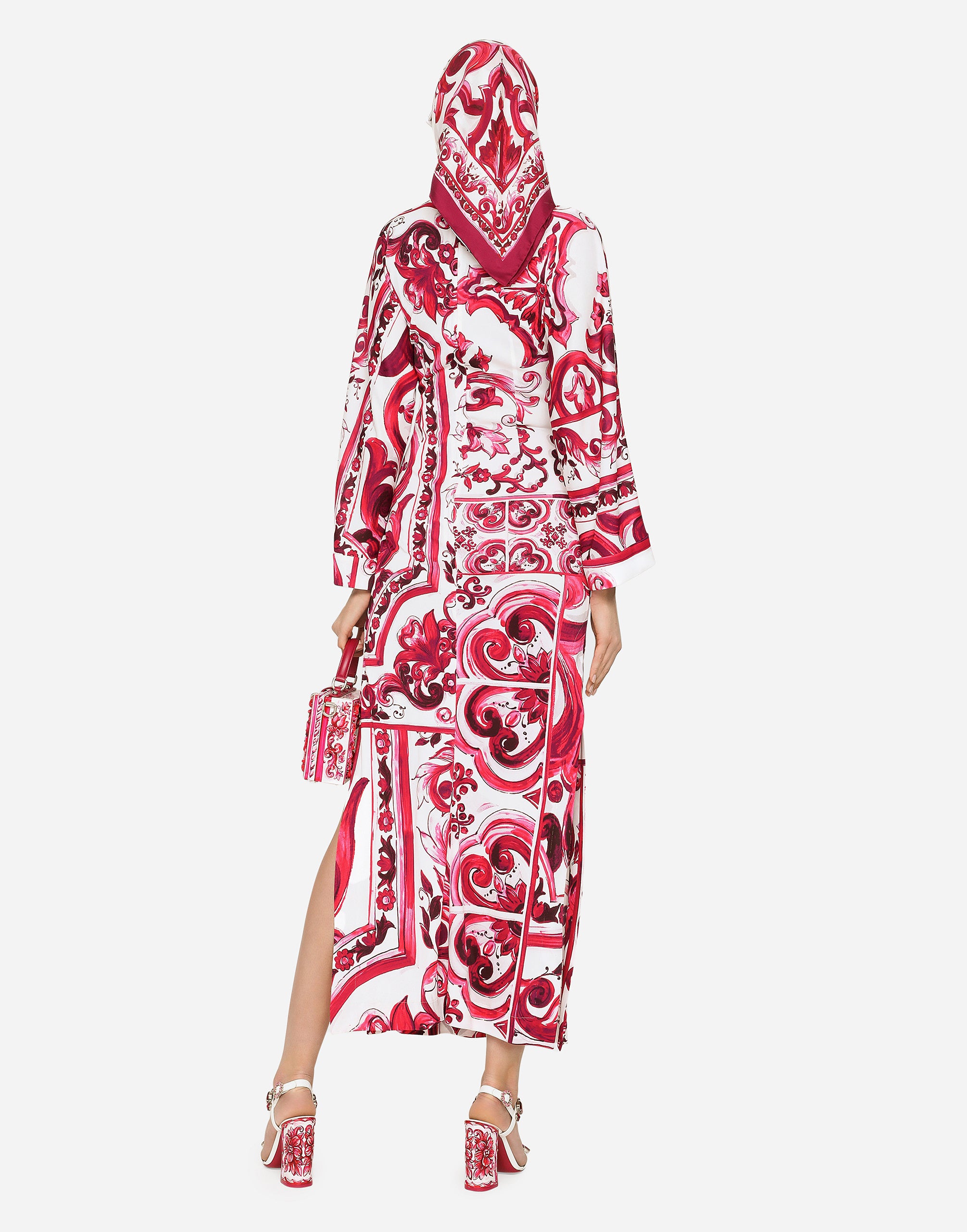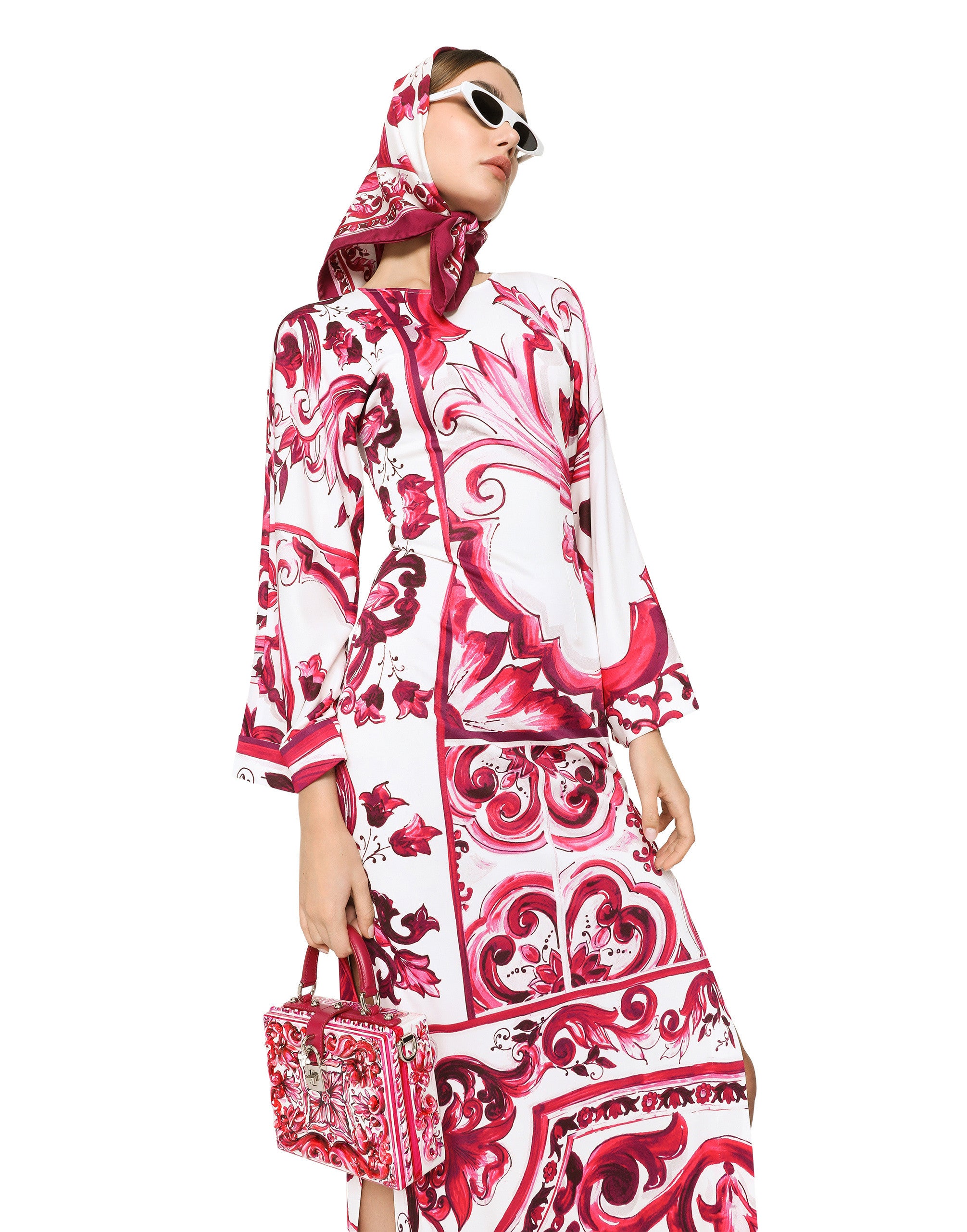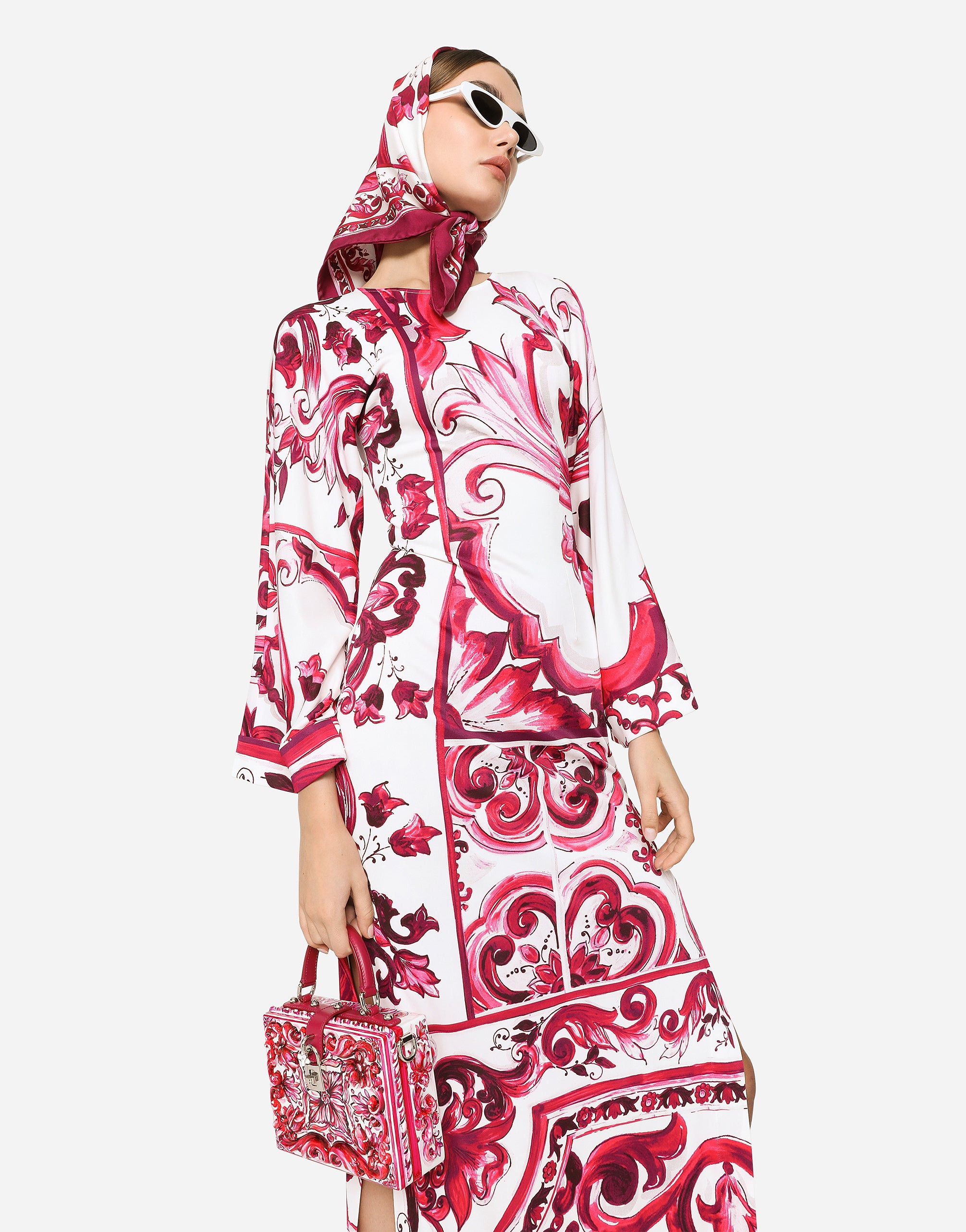 Against a striking white base, evoking the dazzling sunlight shining on houses facing the sea, the ‘calligraphic-naturalistic’ decoration – here in deep fuchsia – adorning Majolica pottery from Caltagirone is the inspiration for the FW 23-24 collection. The two-tone effect takes us on a journey of discovery into iconic and authentic shapes and styles made all the more special by unique, non-repeating placed patterns that celebrate original craftsmanship, lightness and femininity. Long Majolica-print organzine kimono dress: • Multi-colored • Round neck • Kimono sleeves • Side slits • Unlined • Rear zipper and hook-and-eye fastening • The piece measures 137 cm from the center back on a size IT 40 • The model is 175 cm tall and wears a size IT 40 • Made in Italy The difference in the print placement that you may find on this product is a feature of Dolce&Gabbana’s “Handmade” pieces. A detail that makes every garment or accessory unique and exclusive.