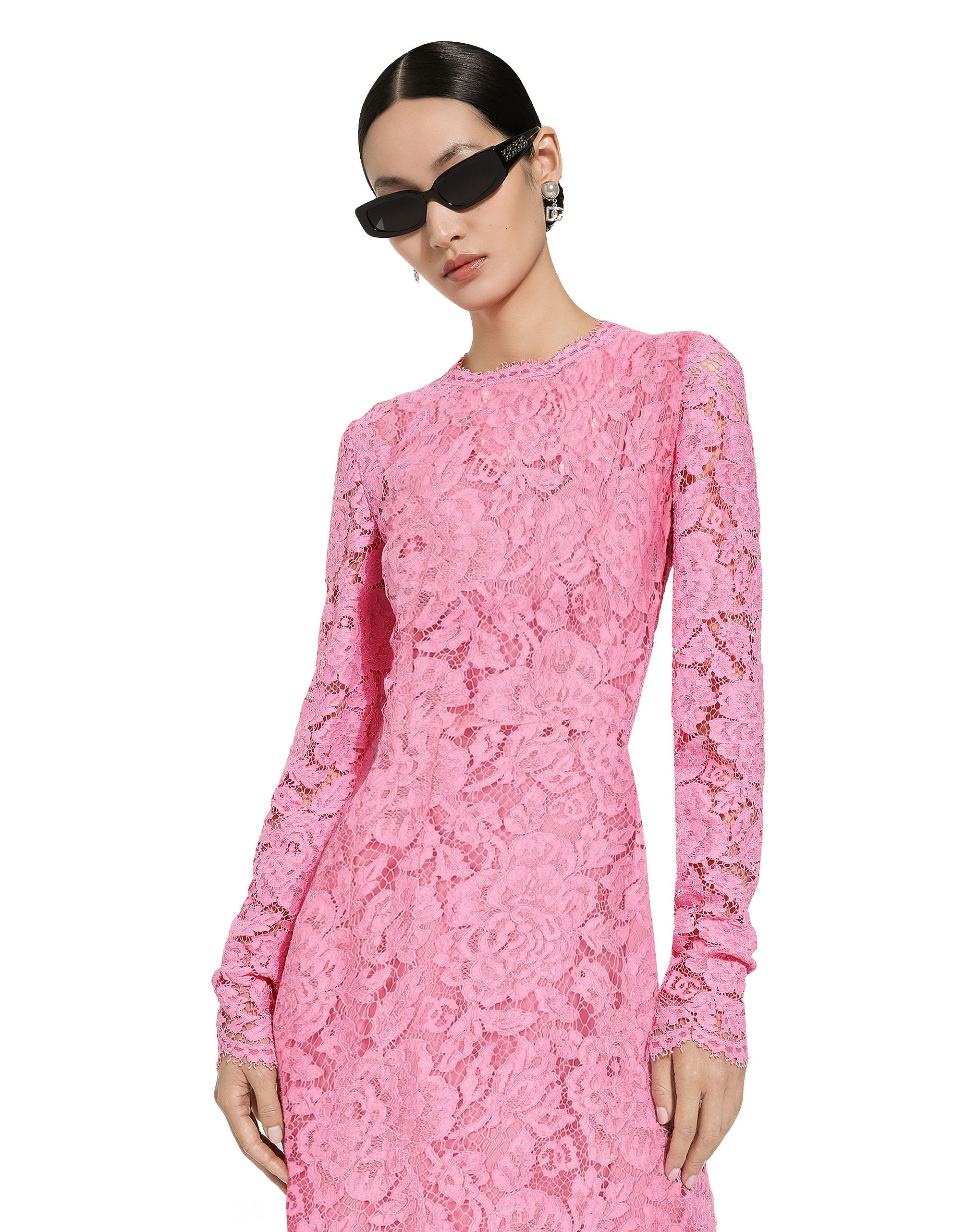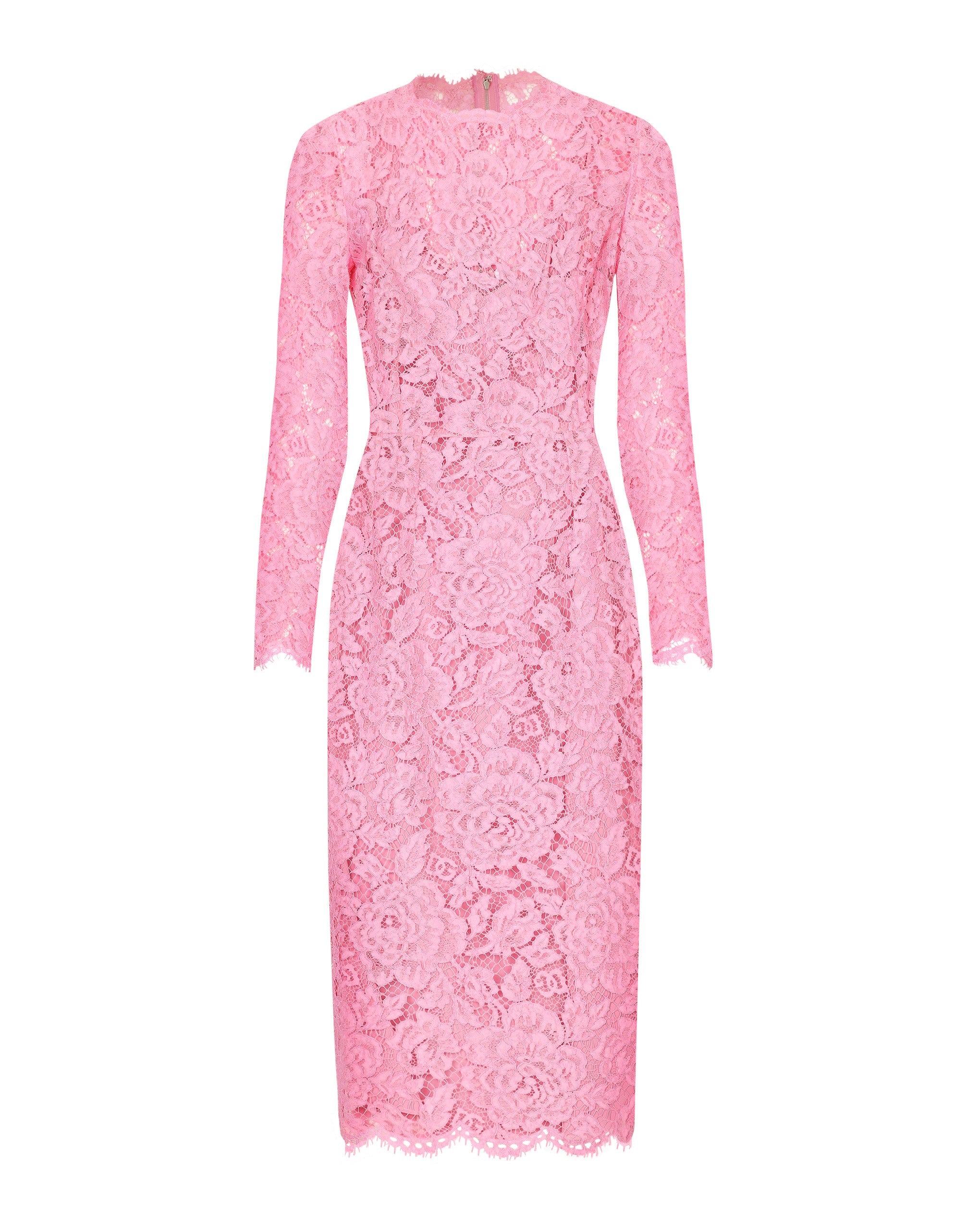 This sheath dress in Cordonetto lace represents everyday elegance with its refined design and sartorial details. Perfect for daytime occasions, it stands out for its fitted silhouette and lace details that enhance femininity. Cordonetto lace sheath dress: • Violet • Crew neck • Long sleeves with scalloped hem • Fitted skirt with funnel slit in the center back • Opening at the center back with covered zip • Full-length crêpe de chine slip with elastic neckline • The model is 175 cm tall and wears size 40 IT • Made in Italy