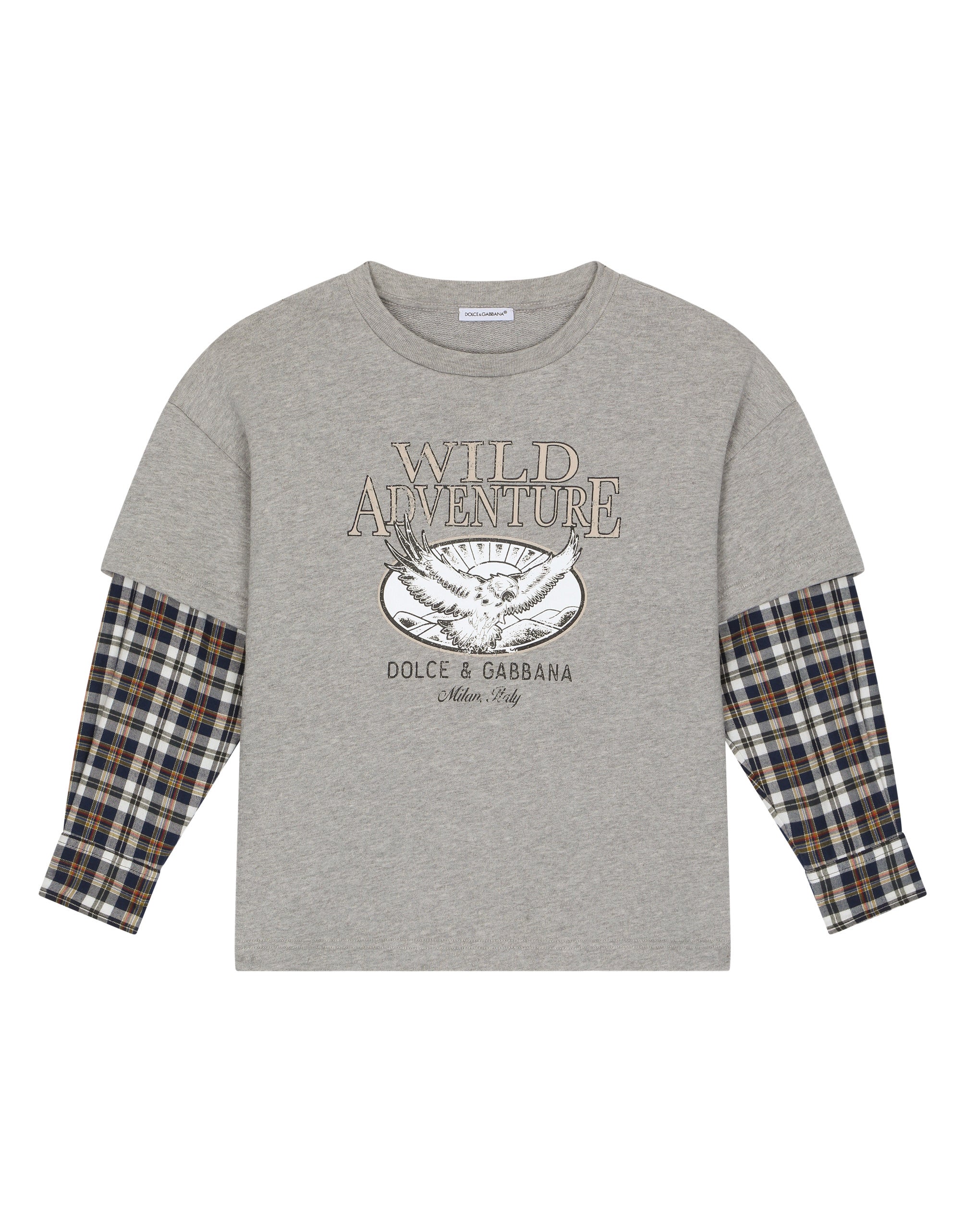 The girl’s Prateria Collection is inspired by the women’s 2001 New Hippy Collection, where the desert and meadows become bohemian and glamorous. Vaguely vintage/grunge looks come made up of volume and special pieces flaunt light printed and solid-color fabric details, smock stitching, corduroy, faux fur and a print distinguished by delicate and joyful multi-colored wildflowers for fun and ironic little girls. Long-sleeved jersey T-shirt with screen print and double sleeves: • Gray • Oversize fit • Round neck • Double shirt-style sleeves in contrasting fabric • Vintage screen print • The item in the size 6 years measures 49.5 cm from the shoulder seam • Made in Italy The difference in the print placement that you may find on this product is a feature of Dolce&Gabbana’s “Handmade” pieces. A detail that makes every garment or accessory unique and exclusive.