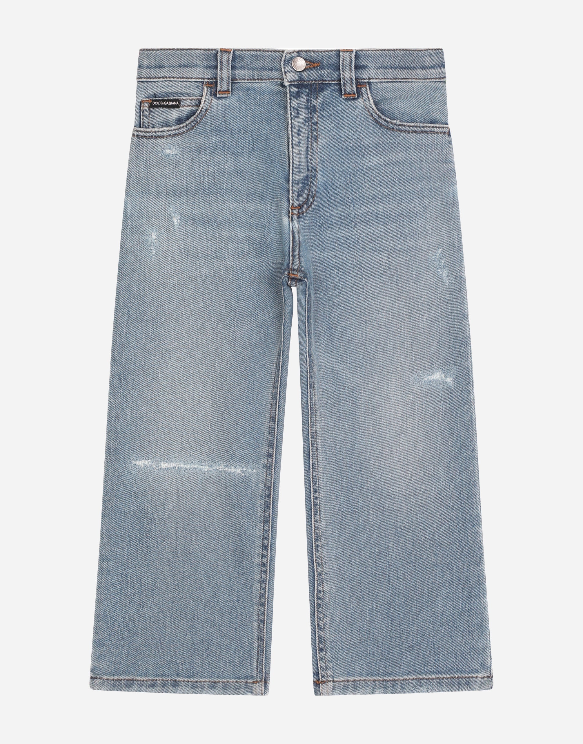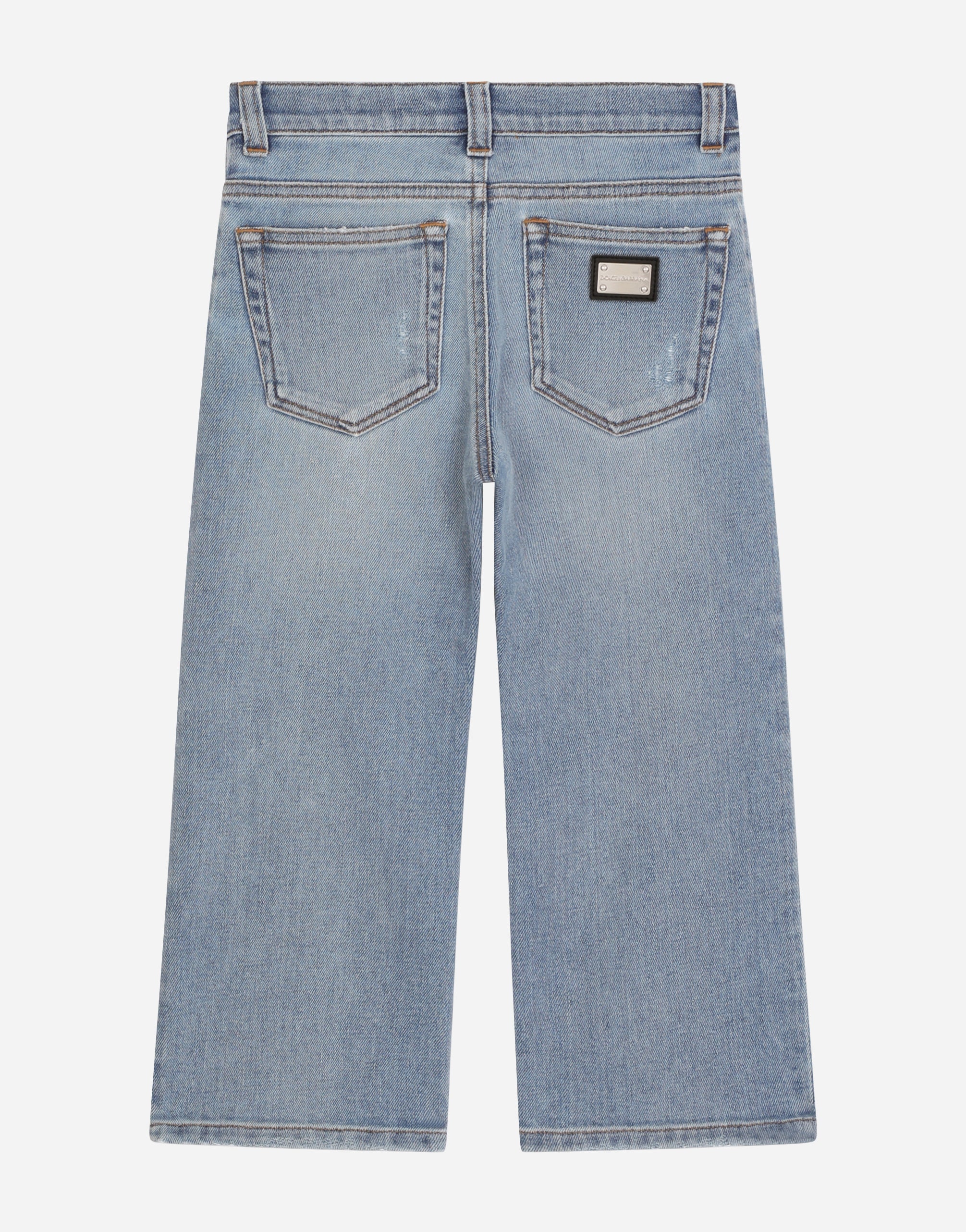 DG Eden is a mash-up of floral prints, denim and pastel tones. Inspired by sports, music and the 2000s, Dolce&Gabbana is creating a unique and eccentric world. poppies against an ocelot background and tie-dye prints come together to give life to create an ultra-colorful look with a chill feel. The wide leg gives these five-pocket stretch denim jeans with small abrasions a new look. • Loose fit • Inner waistband with adjustable elastic • Branded label on the coin pocket • Logo tag on the back pocket • Unlined • Concealed front zipper and button fastening • The item in the size 3 years measures 62 cm in length • Made in Italy