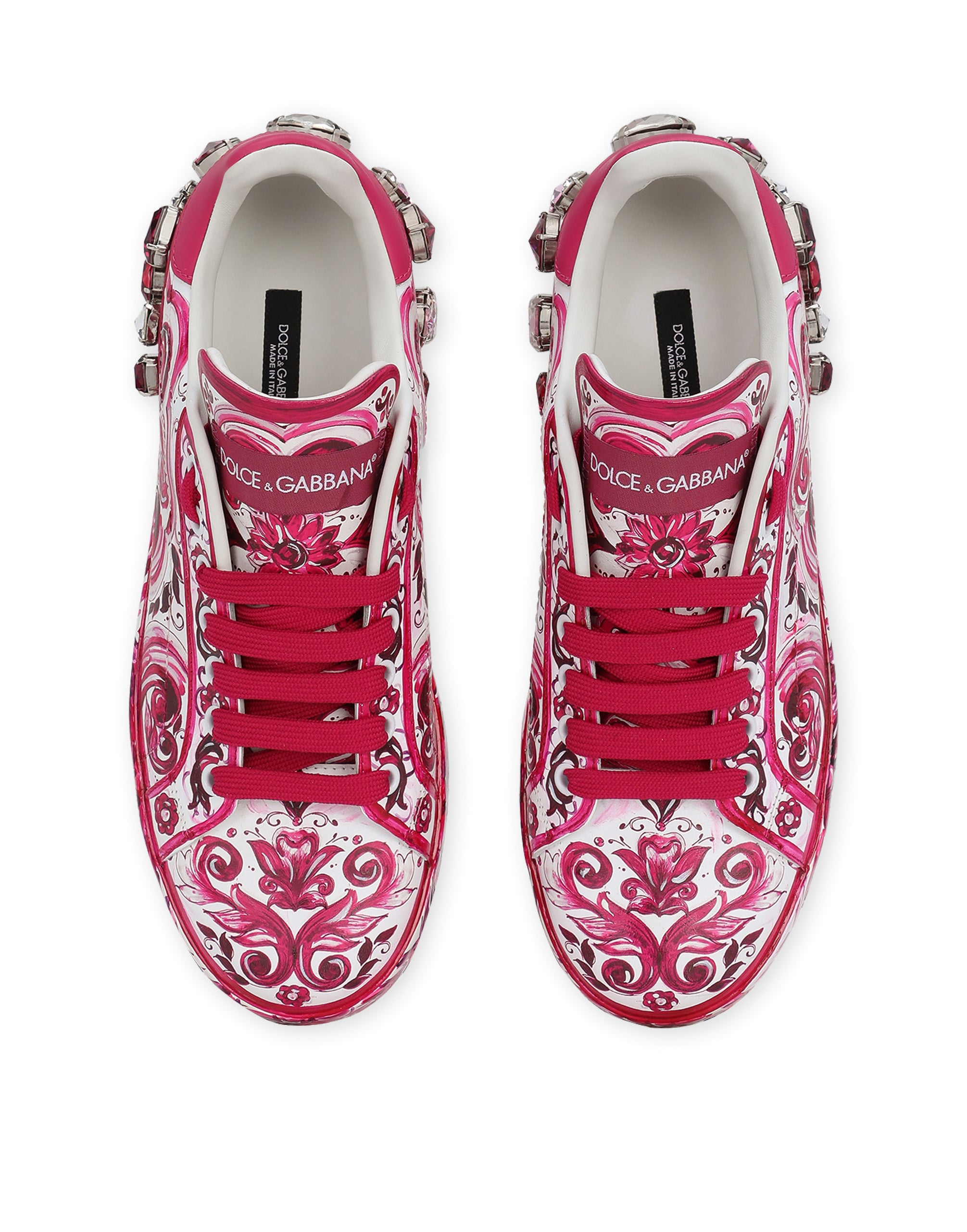 The new collection is inspired by the ancient ceramics of Caltagirone, where tones of white and fuchsia merge in a tribute to Sicilian craftsmanship and majolica tiles, reinterpreted in a contemporary way. Majolica-print calfskin Portofino sneakers: • Fuchsia • Calfskin heel cup • Flat laces • Calfskin insole with branded label • Rubber bottom assembly with embellished spoiler • Branded rubber sole • Item comes with a branded dust bag • Made in Italy