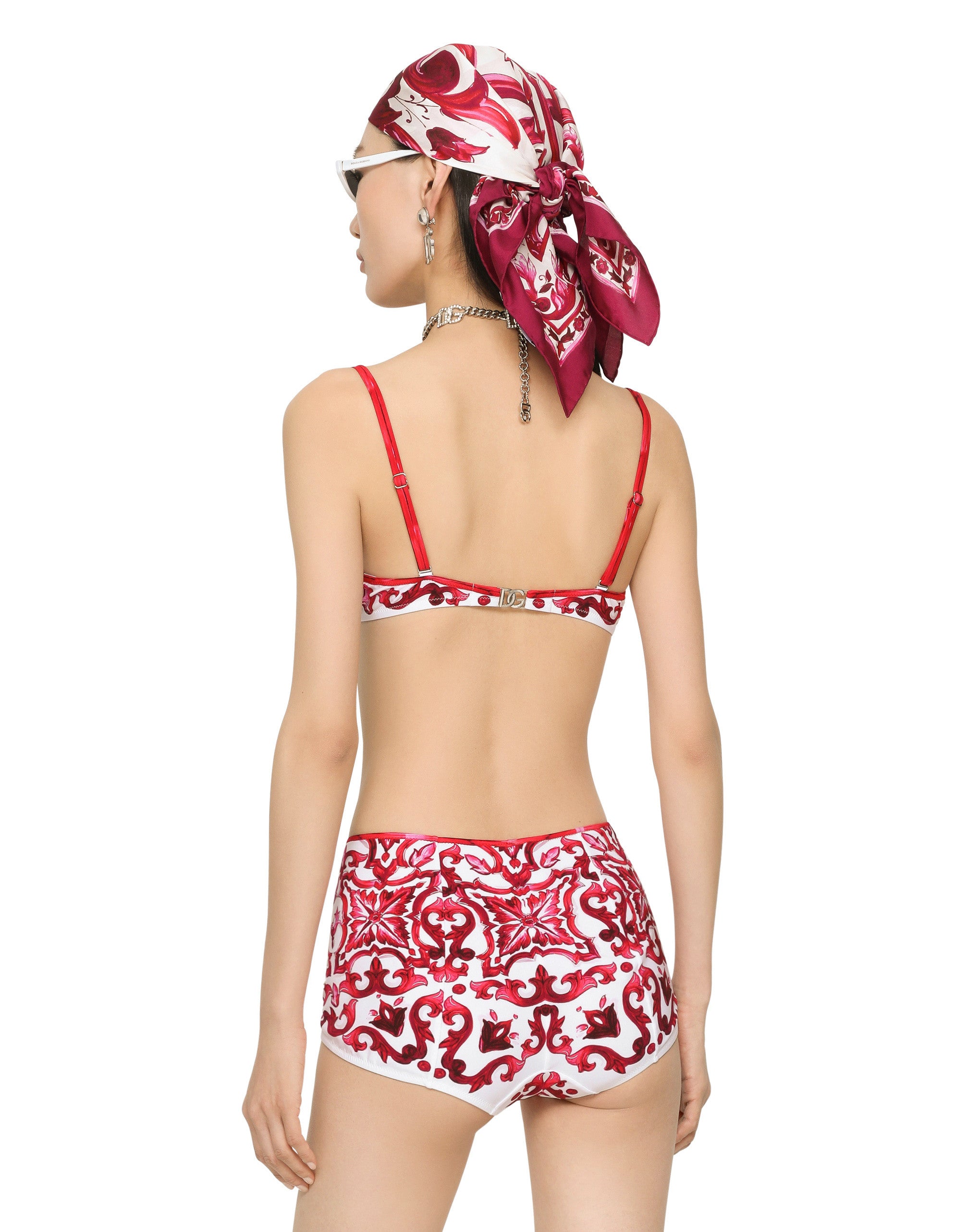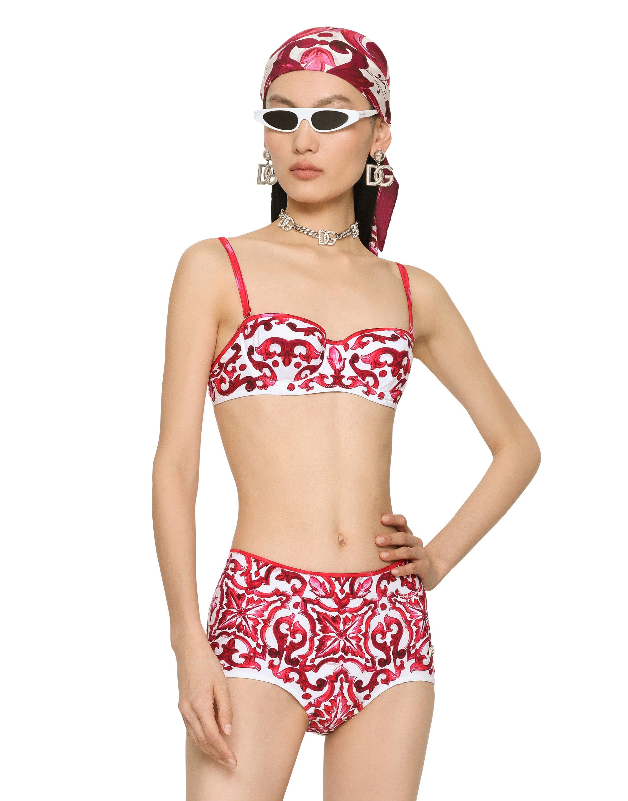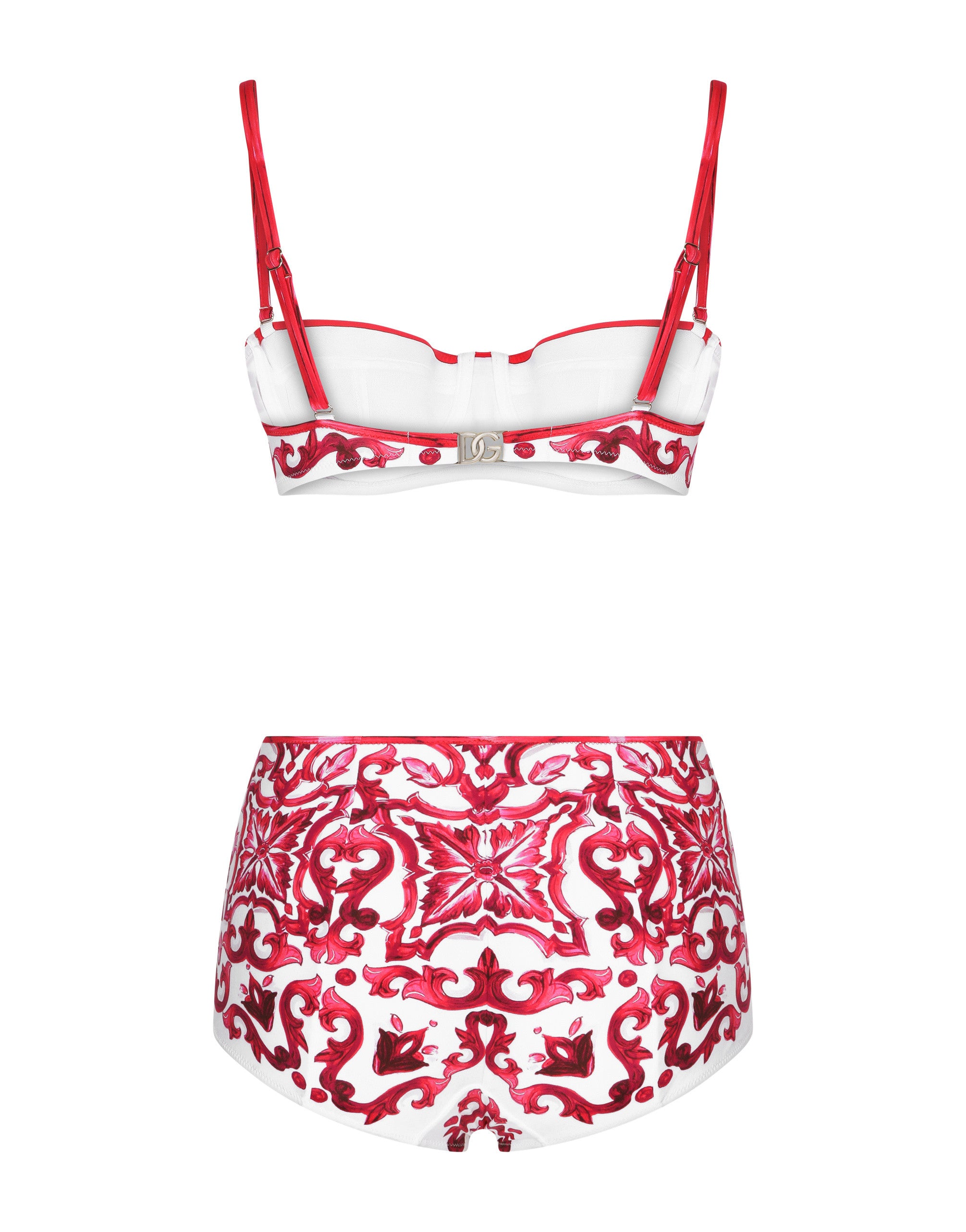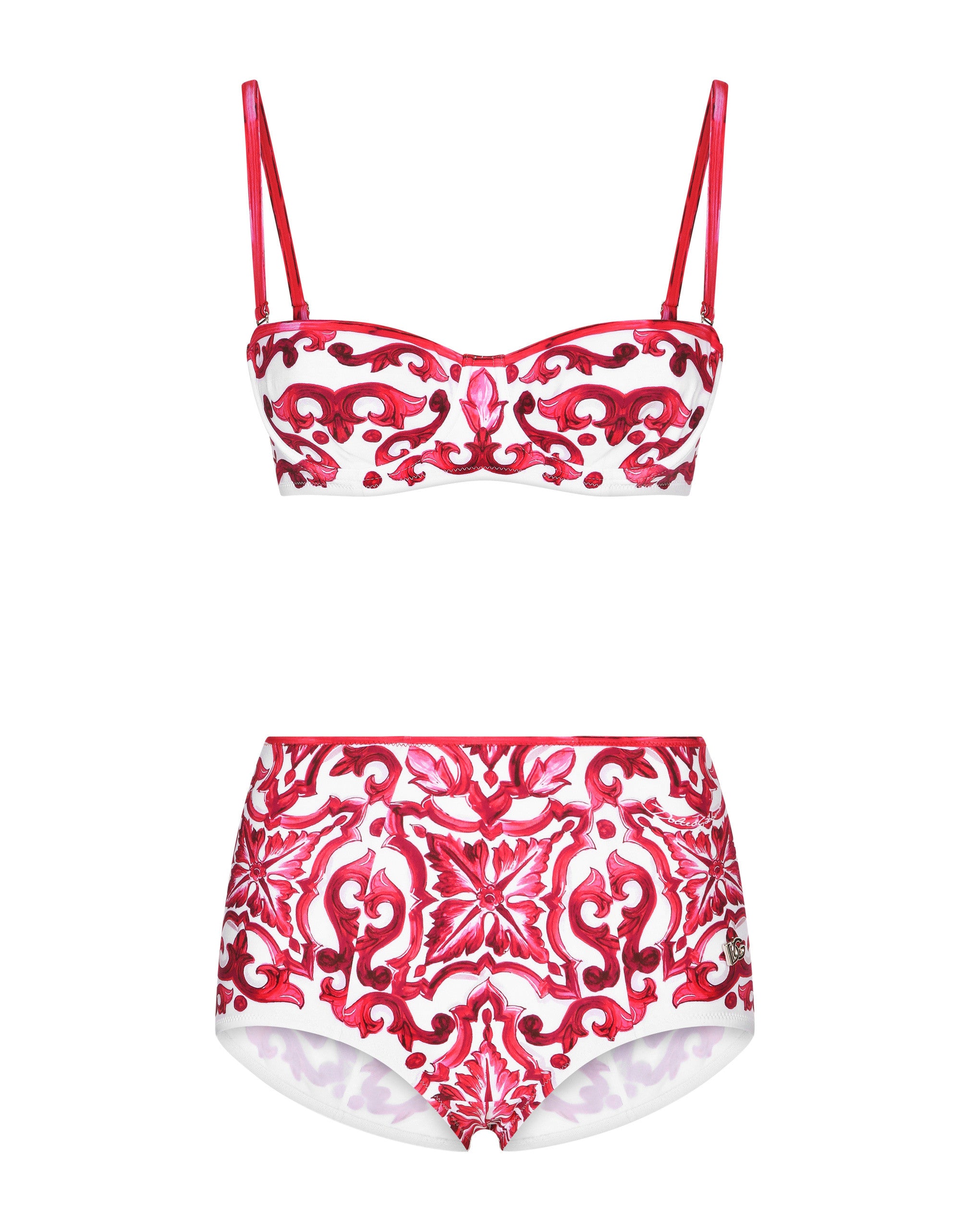 This bikini combines a sophisticated design with unique details, perfect for those who like to stand out in style. Padded bikini with Majolica print: • Multi-coloured • Padded balconette • With detachable straps • High-waisted bottoms • DG metal logo on the hip • Made in Italy The difference in the print placement that you may find on this product is a feature of Dolce&Gabbana’s “Handmade” pieces. A detail that makes every garment or accessory unique and exclusive.