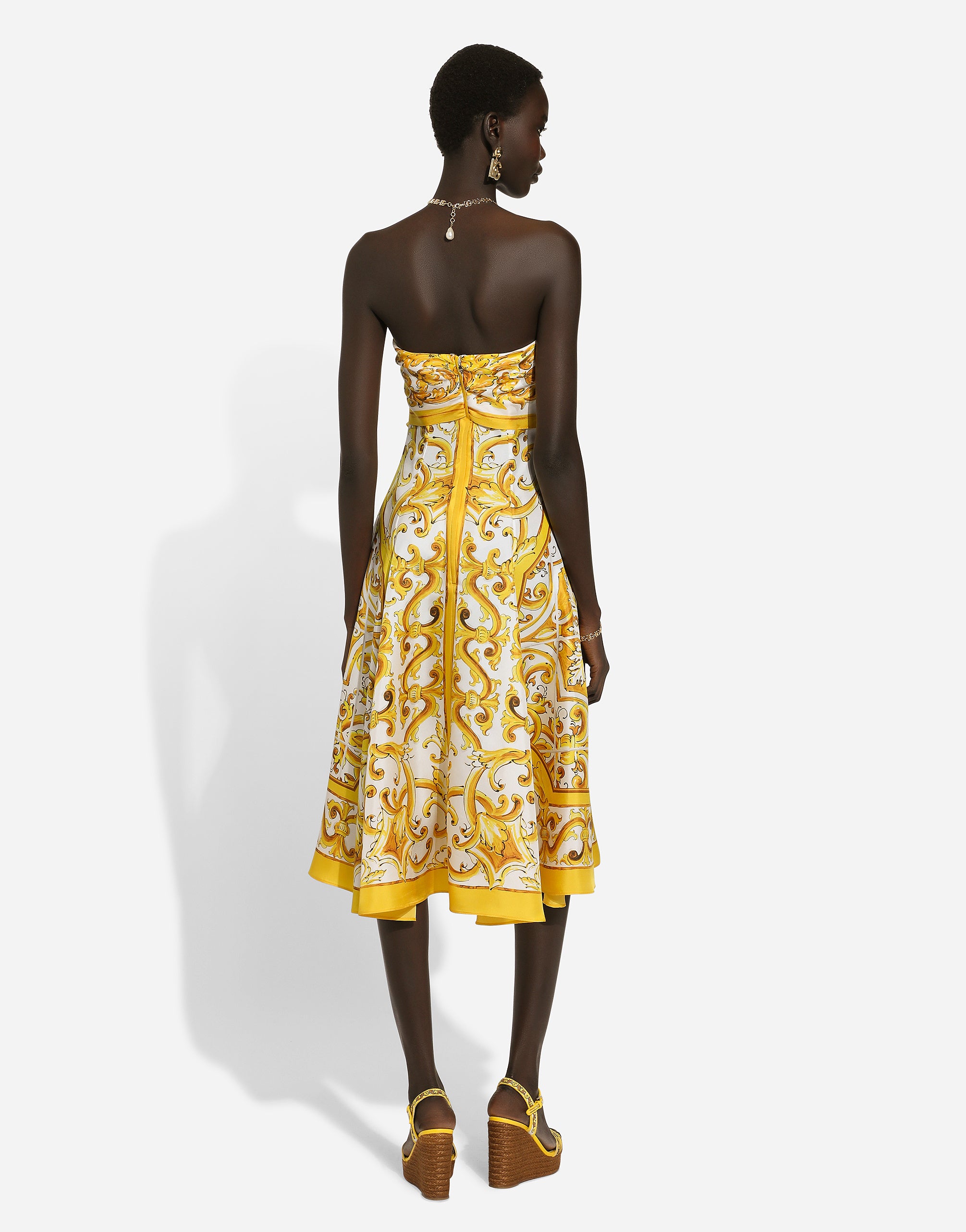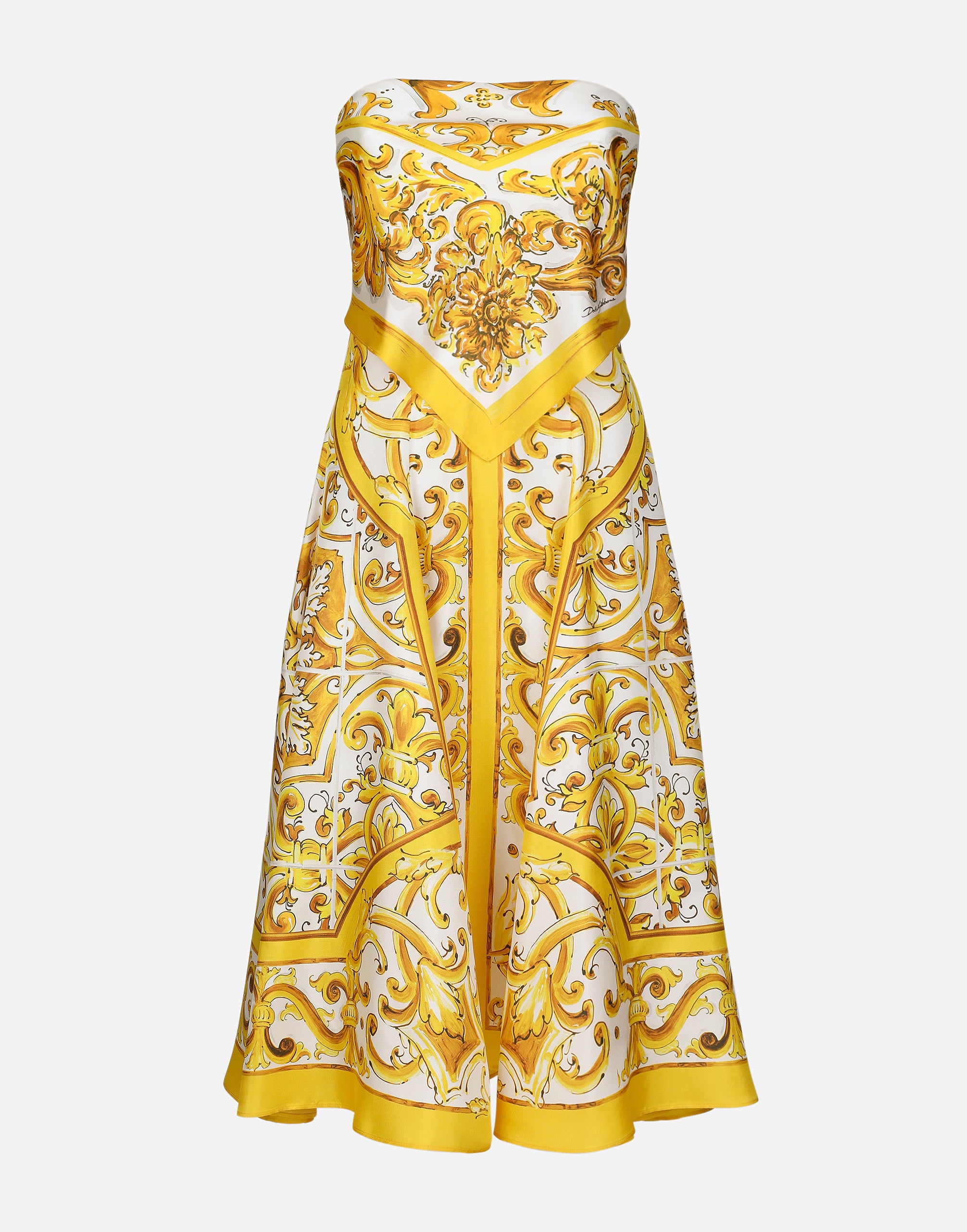 The Majolica, a symbol of Italian craftsmanship, comes in lemon yellow for the FW24/25 Girl’s Collection. This vibrant hue, brightened up by pure white, evokes summer light dancing on the quintessential Sicilian homes that look out to the sea. Evocative color detailing that adds a bold edge to iconic accessories and pieces that are extraordinarily feminine and vibrant. A tribute to the majolica art that, once again, enhances Dolce&Gabbana aesthetic rules. Strapless midi dress with foulard effect in majolica-print silk charmeuse: • White and Yellow • Straight neckline • Sleeveless • Underwired bra cups • Stretch silk crepe de chine lining • Rear zipper and hook-and-eye fastening • The piece measures 91 cm from the center back on a size IT 40 • The model is 175 cm tall and wears a size IT 40 • Made in Italy