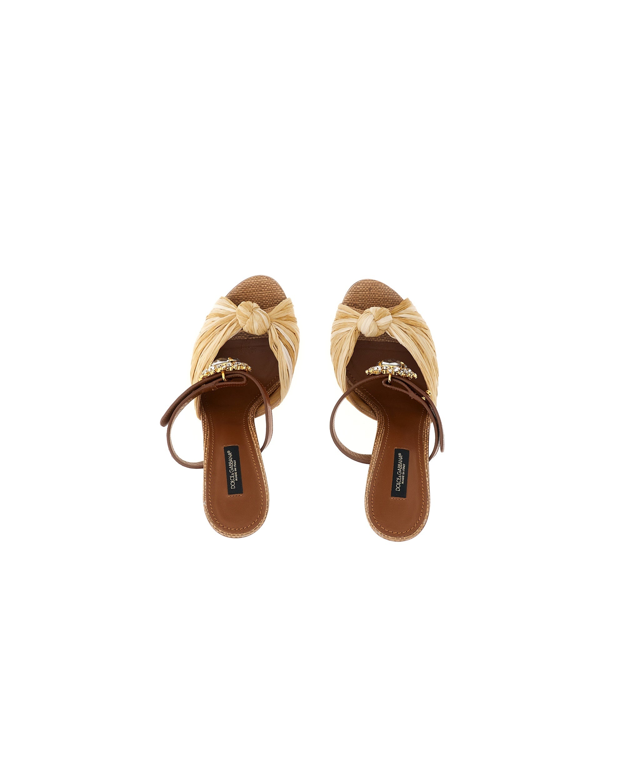 Tropical scenery and jungle portrayals alternate with organic materials such as straw, wicker and rope, reminding us of the Sicilian land. The Lori mules are made of tropea straw, inspired by the seductive pin-ups from the 1950s, they are elegant and feminine. The removable strap is a distinctive element, with a bejeweled buckle that wraps around the instep of the foot: • Heel wrapped in ABS printed wicker: 105mm- 4 inches • Removable calfskin strap with bejeweled buckle • Leather insole with logoed label • Polished leather sole with logo detail • Packaging in theme with the product • Made in Italy External Composition: 20% Calfskin 80% Viscose Internal Composition: 81% Goatskin 19% Polyamide