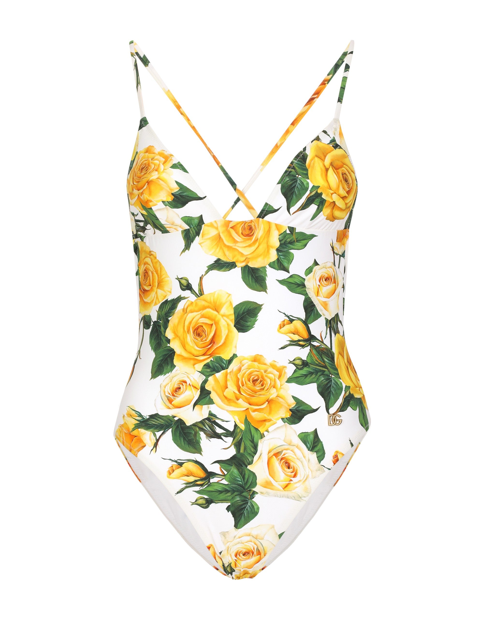 The Flowering Collection has us dreaming of faraway destinations, the most exclusive ones in the world, inviting us through the colors and the yellow rose print to take refuge in warm and unique places. Light White, lemon yellow, polka-dot accents and the various shades of leaf green for vibrant and ultra-feminine pieces where the keyword is tailoring. Every look invites us to savor and dream every moment of our free time, to discover beauty and enhance our femininity. One-piece swimsuit with plunging neckline and yellow rose print: • Multi-colored • Plunging V-neck on the front and a straight back • Triangle cups • Branded DG logo in nickel-free metal • Matching PVC pouch • Made in Italy The difference in the print placement that you may find on this product is a feature of Dolce&Gabbana’s “Handmade” pieces. A detail that makes every garment or accessory unique and exclusive.