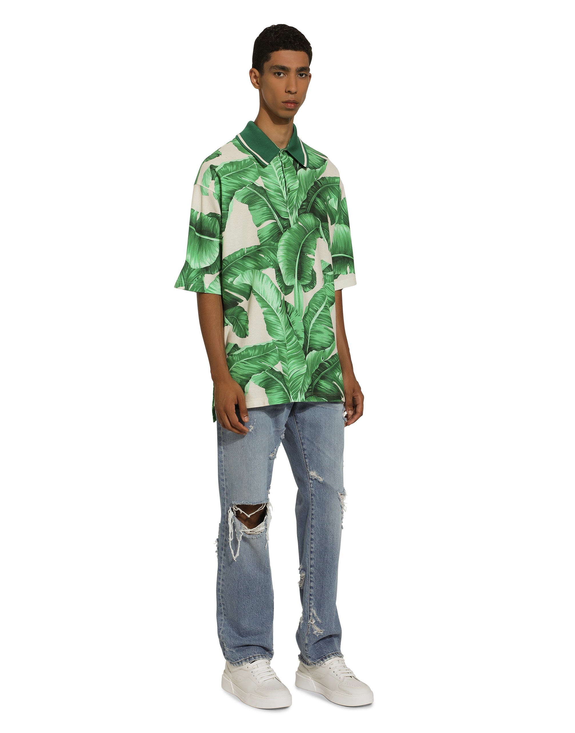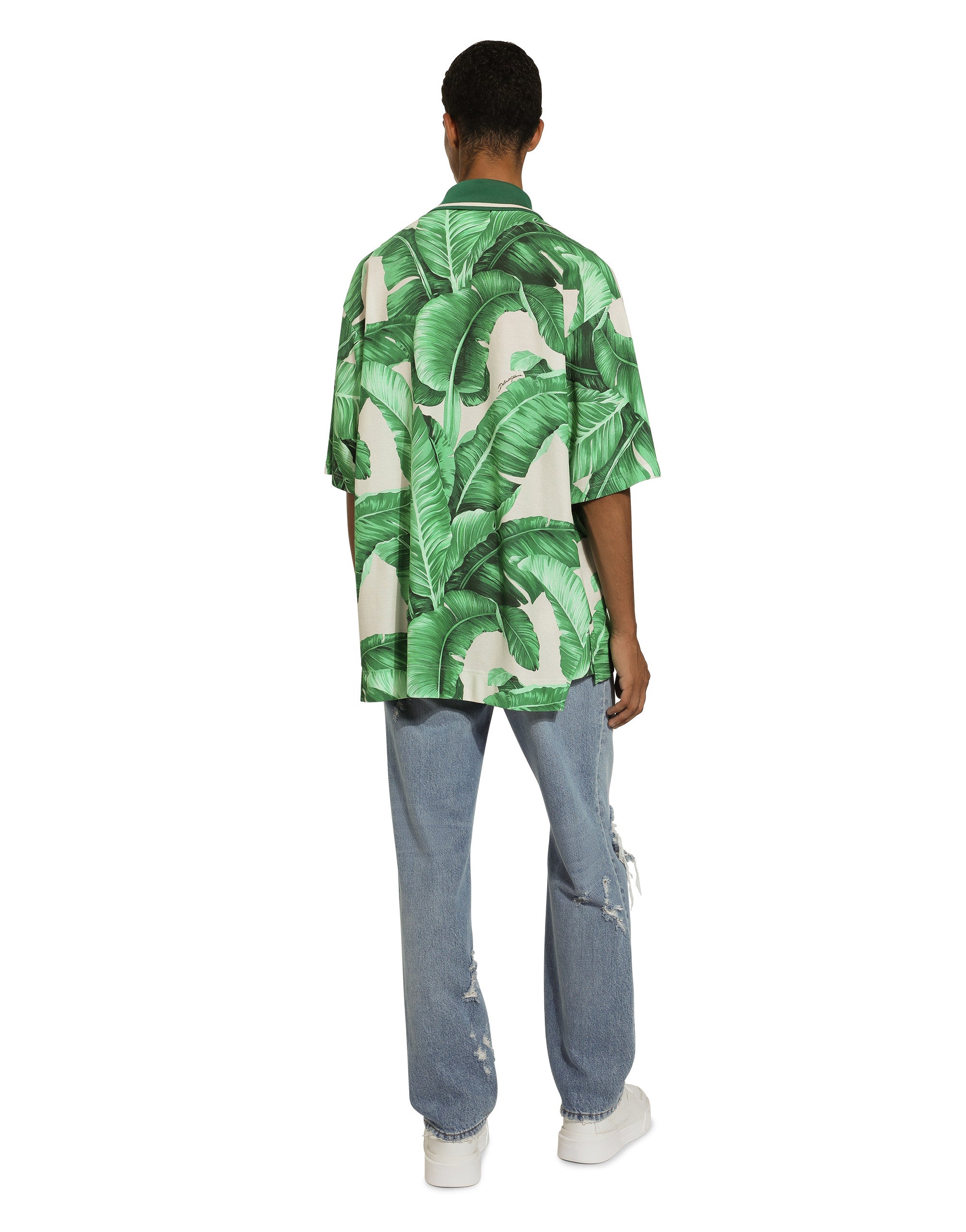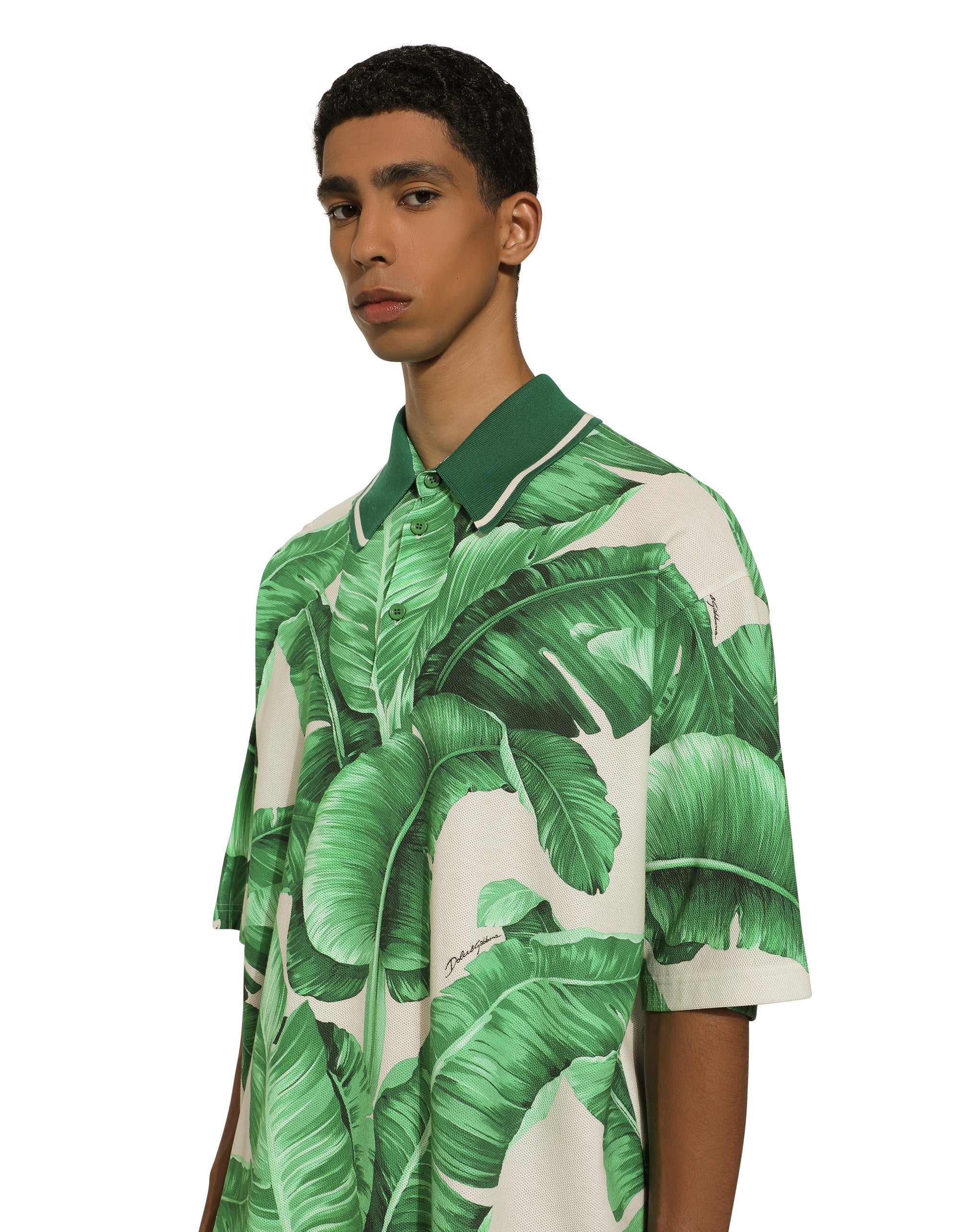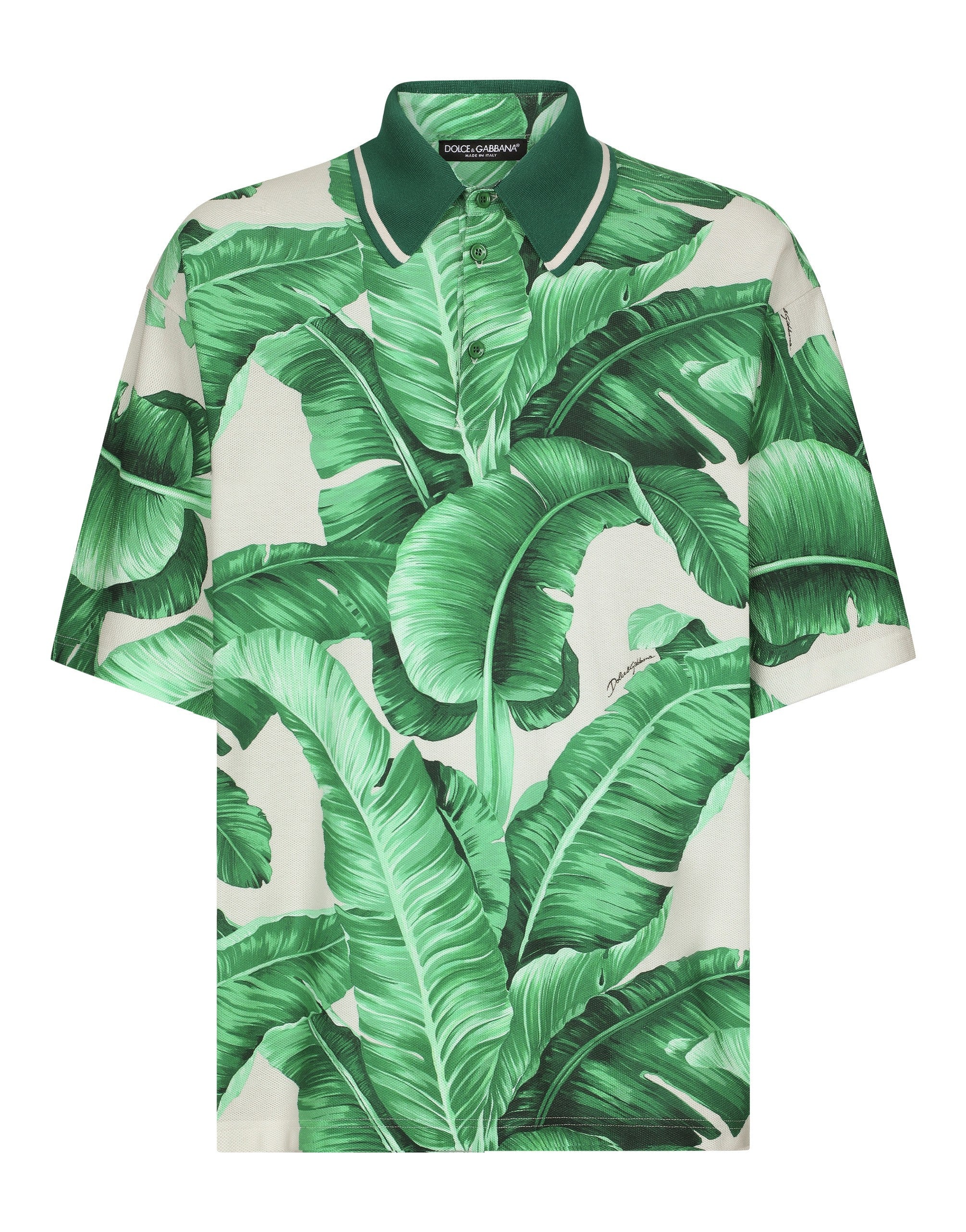 The Banano collection immerses us in the beauty of nature and, thanks to its vibrant colors, transports us to tropical cities, distinguished by Art Deco villas and lush gardens. Vintage 1940s graphics, fabrics and special volumes for the stylish man who loves to tell his story through the craftsmanship, beauty and originality of his chosen garments. This is how the designers recount a fantastic place, the tropics, a magical locale where you can dream, where nature spoils us with its unique colors. Cotton polo-shirt with piqué banana tree print: • Multi-colored • Oversize fit • Button fastenings • Long sleeves • The piece measures 78 cm from the shoulder seam on a size IT 48 • Made in Italy The difference in the print placement that you may find on this product is a feature of Dolce&Gabbana’s “Handmade” pieces. A detail that makes every garment or accessory unique and exclusive.