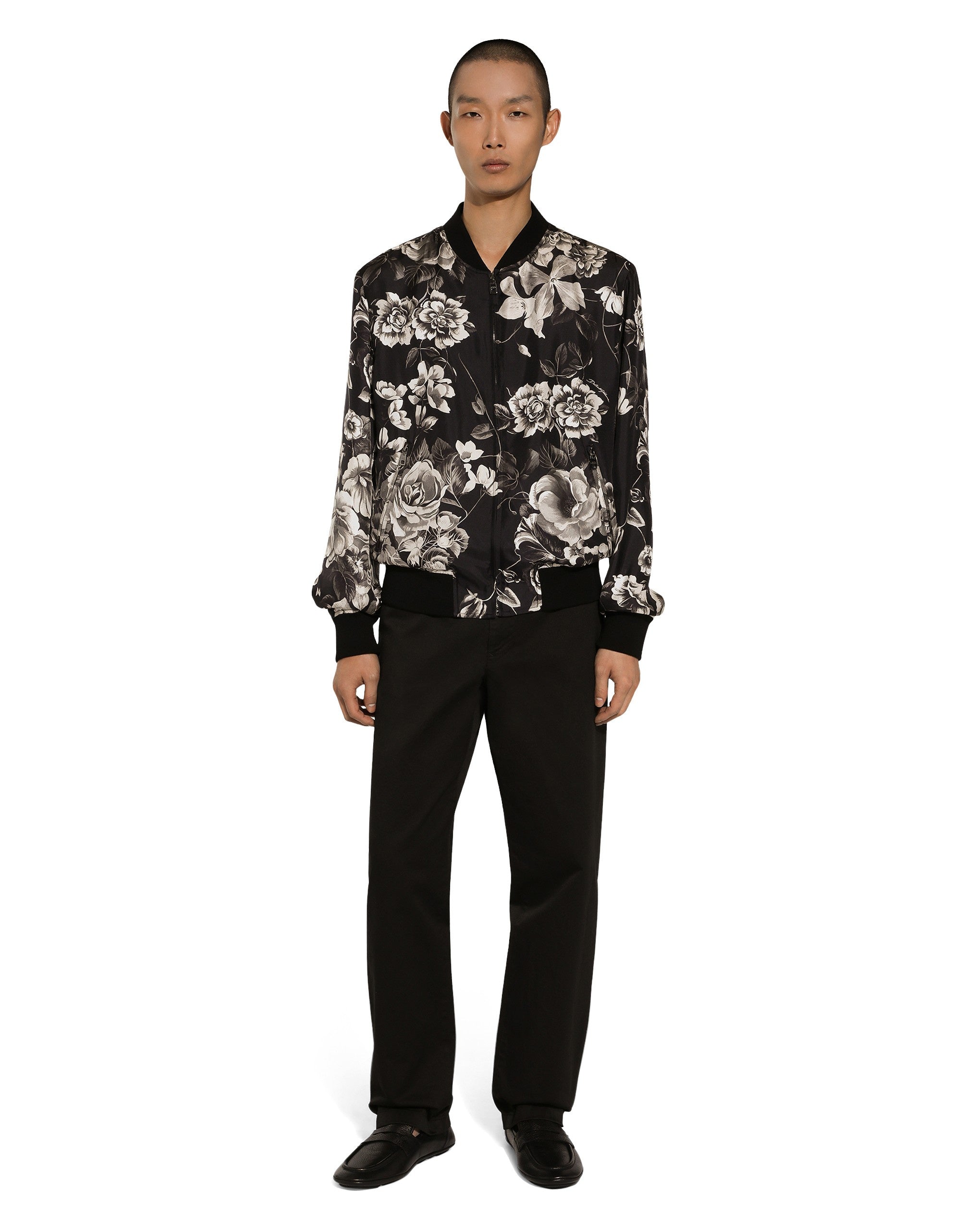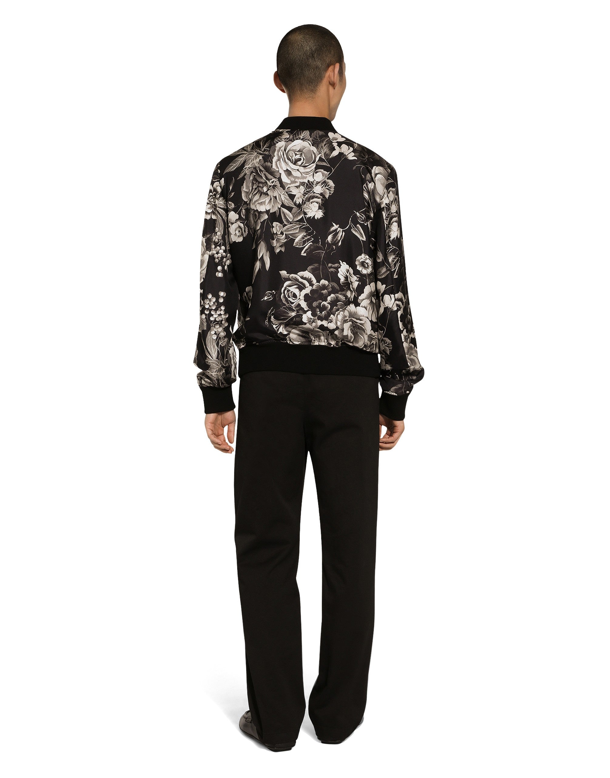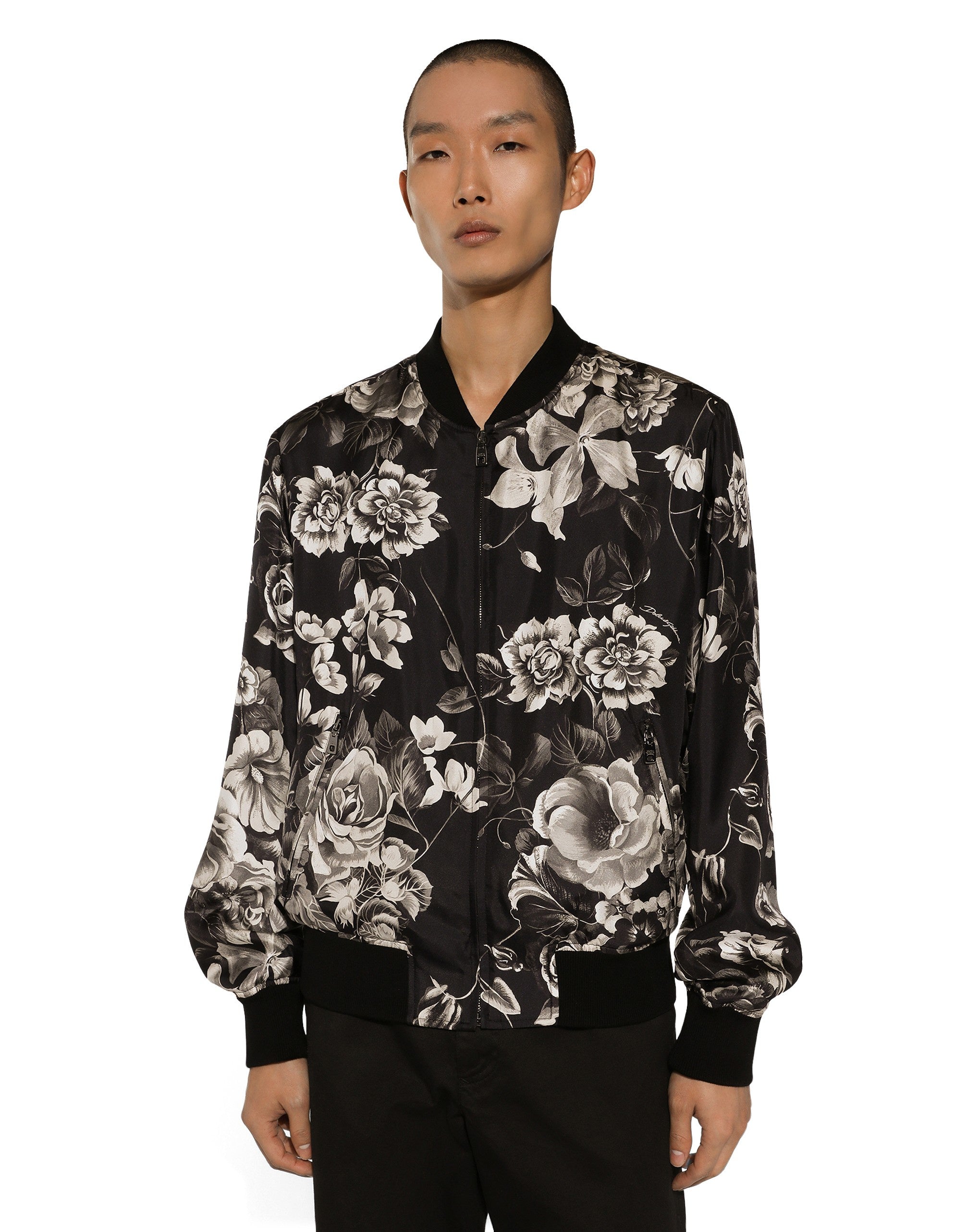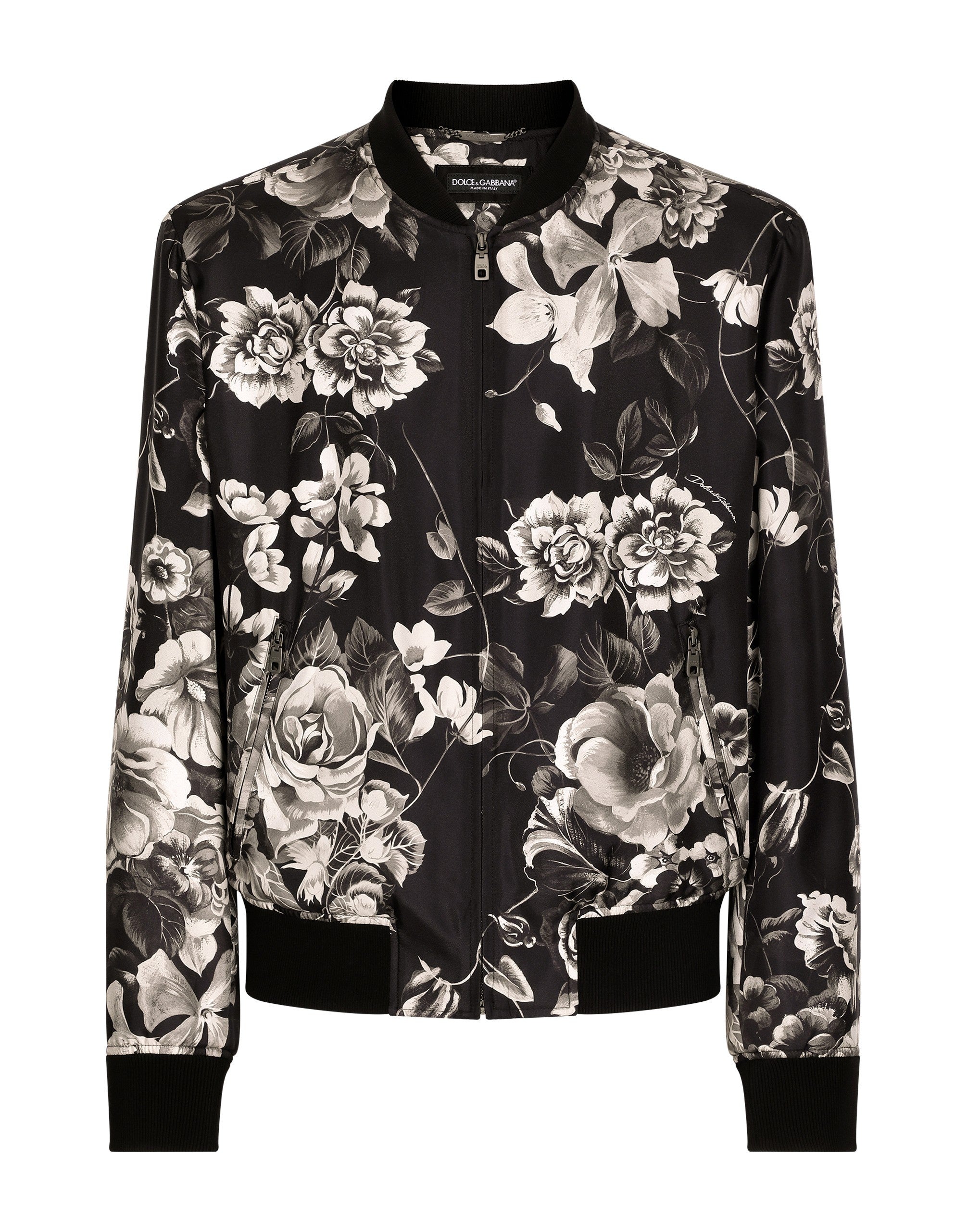 The Palermo collection represents the link between the Sicilian man’s world and the unspoiled nature of the island. A language marked by warm hues - sand, cream, Nero Sicilia black - floral paintings and iconic prints.The Dolce&Gabbana closet must-haves have been reworked in different materials, in pursuit of a new form of harmony. A collection rich in suggestion, such as the stripes inspired by the old mattresses of the 1940s and 1950s, and the timeless aesthetic of the looks. Oversize floral-print silk twill bomber jacket: • Black • Regular fit • Front zipper fastening • Welt pockets on the side • Stretch knit neck, hem and cuffs • Lined • The piece measures 72 cm from the rear collar seam on a size IT 48 • Made in Italy