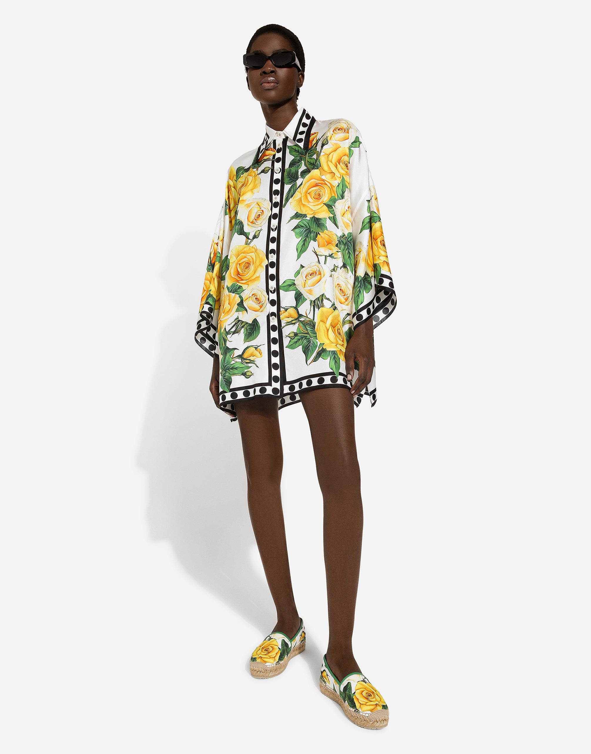 The Flowering Collection has us dreaming of faraway destinations, the most exclusive ones in the world, inviting us through the colors and the yellow rose print to take refuge in warm and unique places. Light White, lemon yellow, polka-dot accents and the various shades of leaf green for vibrant and ultra-feminine pieces where the keyword is tailoring. Every look invites us to savor and dream every moment of our free time, to discover beauty and enhance our femininity. Oversize silk twill shirt with yellow rose print: • Multi-colored • Shirt collar • T sleeves • Oversize fit • Button fastenings with branded bottom edge • The piece measures 80 cm from the center back on a size IT 40 • The model is 175 cm tall and wears a size IT 40 • Made in Italy The difference in the print placement that you may find on this product is a feature of Dolce&Gabbana’s “Handmade” pieces. A detail that makes every garment or accessory unique and exclusive.