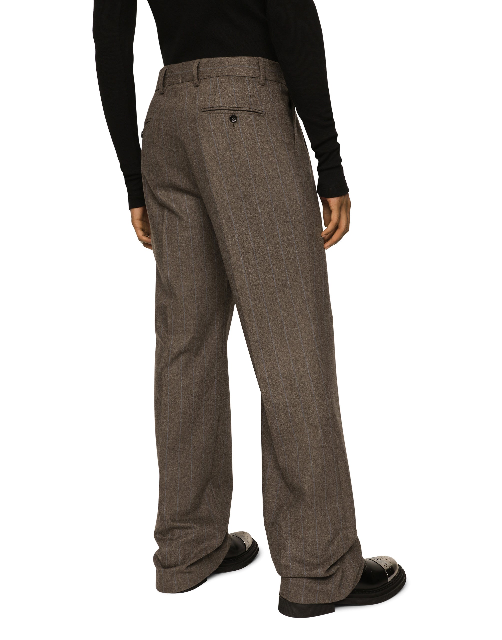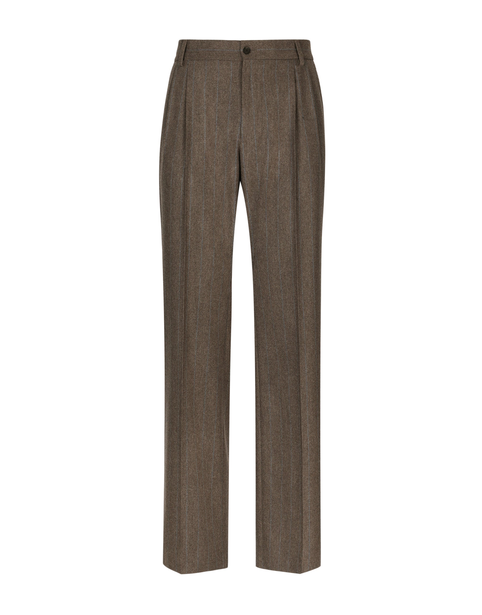 For FW23, Dolce&Gabbana rereads its own historical archive, which is an inexhaustible source of inspiration that is rich in fascination and creativity. The garments accompanied by a “Re-Edition” label report the dates referenced by the collection. Each look enhances in all its sophistication the concept of timeless relevance of a historical archive allowing new generations to discover a past but always current universe that is rich in creative insights and possible personal interpretations. Tailored straight-leg pants in pinstripe stretch cashmere and wool flannel: • Brown • Regular fit • Belt loops on the waist • Fly-covered zipper and button fastening • Single dart • Front slant pockets and buttoned welt pockets at the back • The item measures 120 cm on the outer leg and the hem is 28 cm wide on a size IT 48 • The model is 185 cm tall and wears a size IT 48 • Made in Italy