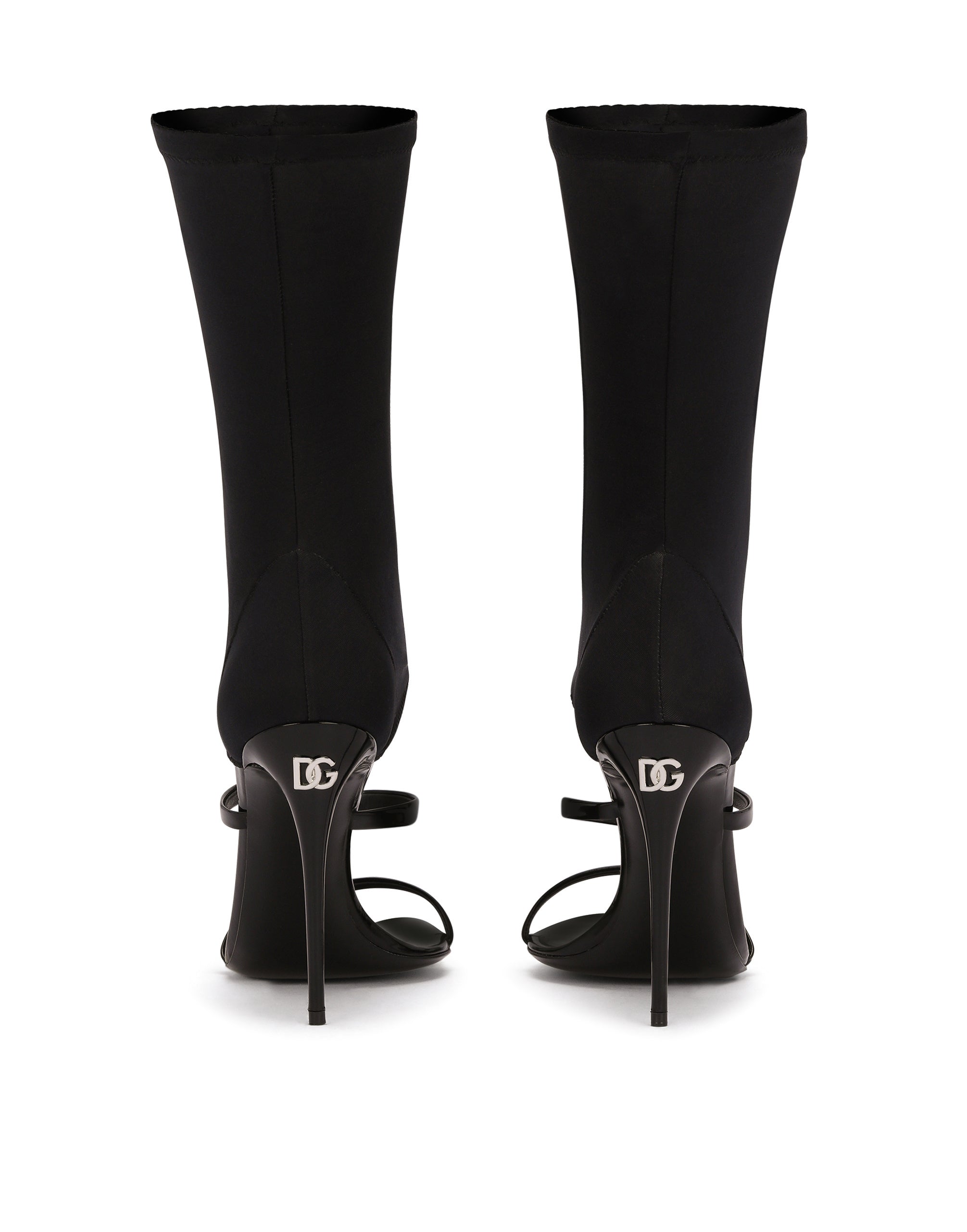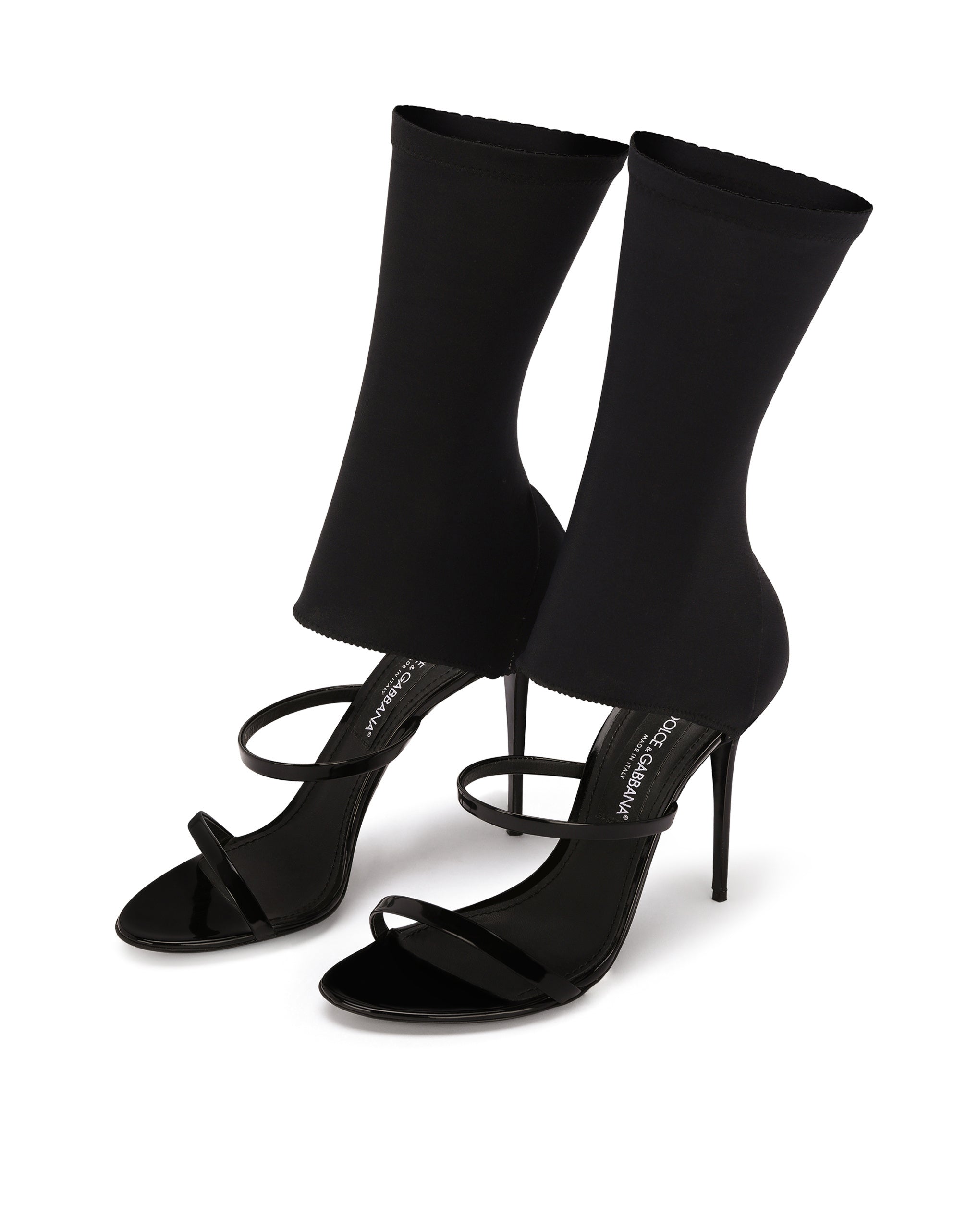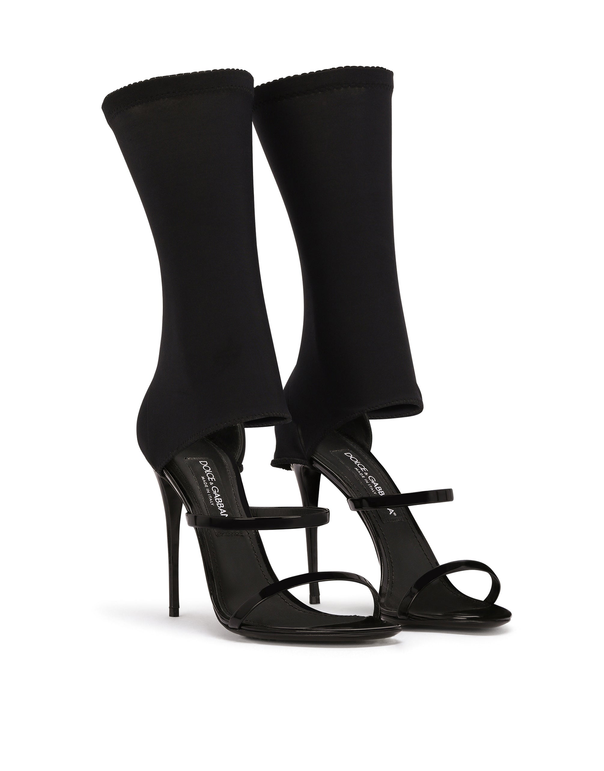 Iconic style is being given some contemporary edge, creating a new vision of the brand’s signature aesthetic. Inspired by women who won't sacrifice their femininity, these Keira sandals come in a new bold version. Featuring a stretch fabric insert that sinuously wraps around the ankles and a DG logo accent. • 105-mm heel with palladium-plated DG logo • Kidskin insole with branded label • Branded leather sole • Item comes with themed packaging • Made in Italy