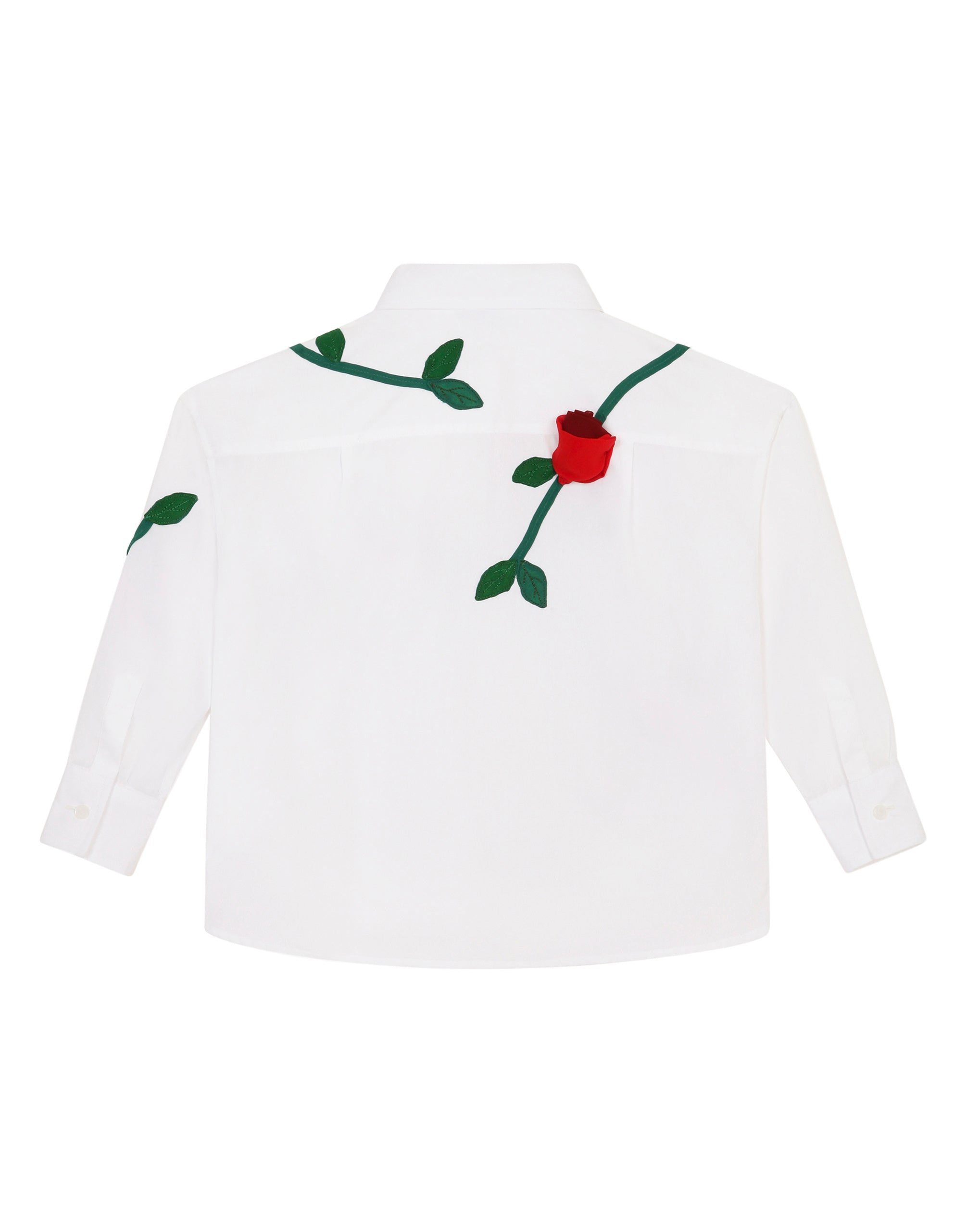 Italian craftsmanship and the “homemade” are the beating heart of the Fatto a mano Collection, the mini-me version of our Women's Collection. The star of the theme is the knitwear, which is imbued with Dolce&Gabbana’s key colors of red and black and conveys Sicilian tradition and love with a modern feel. Red rosebuds, in georgette and tulle, applied to a green stem, give this shirt a 3D effect, making it seem as though a branch of love is blooming on it. • Oversize fit • Shirt collar • Long sleeves • Pleats on the back • Unlined • Branded buttons on the front • The item in the size 3 years measures 46.5 cm - 18.3 inches from the center back • Made in Italy Composition: 100% Cotton