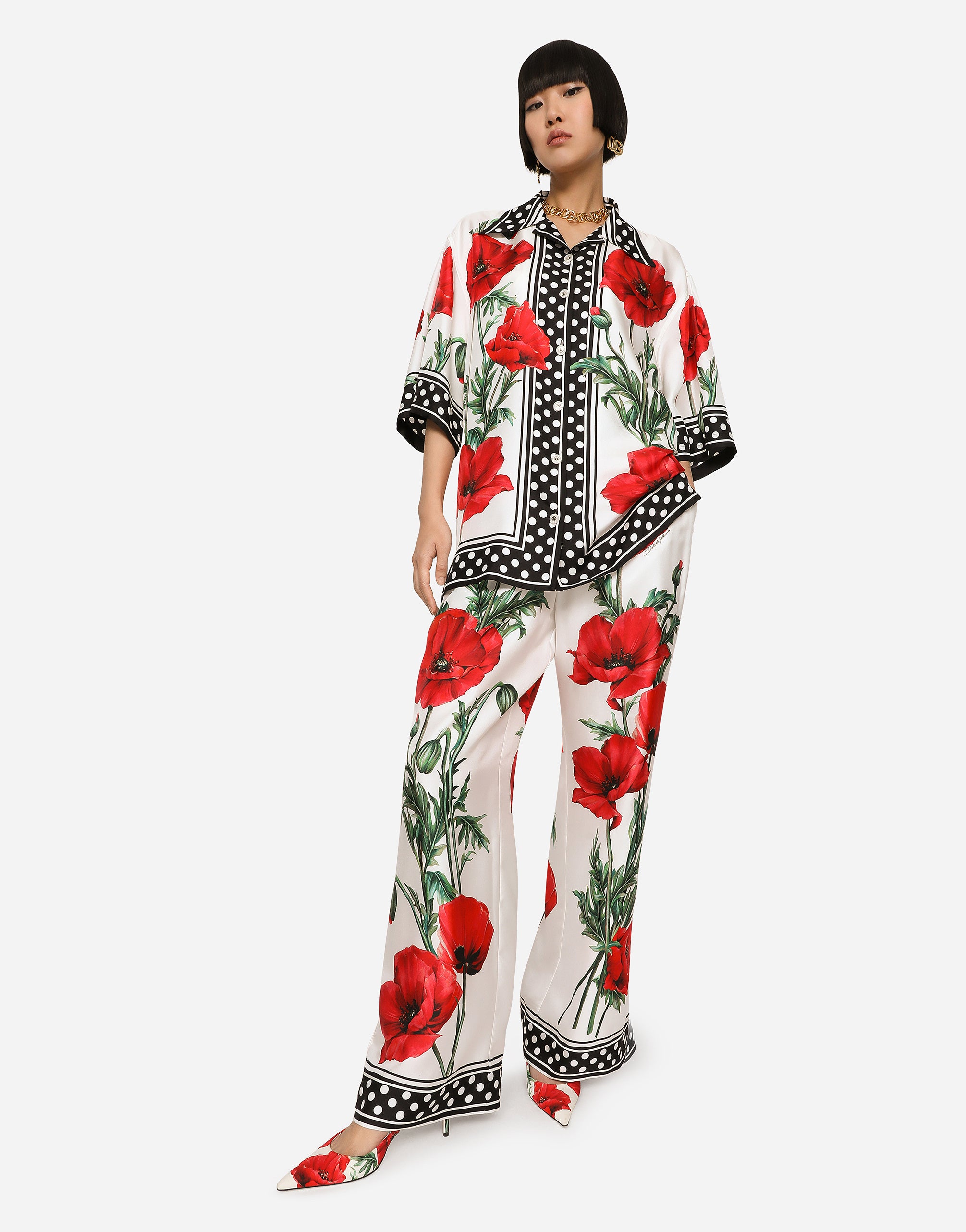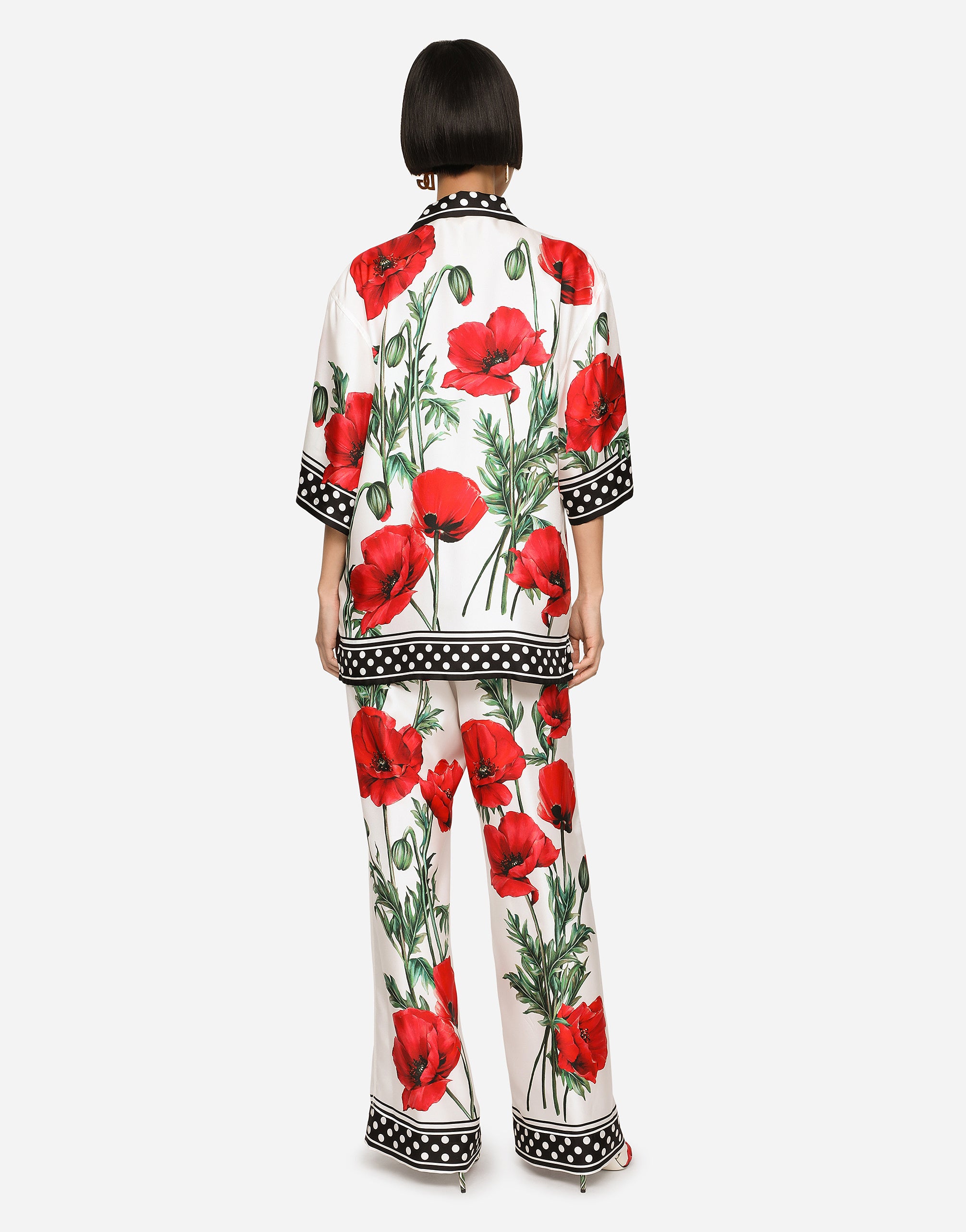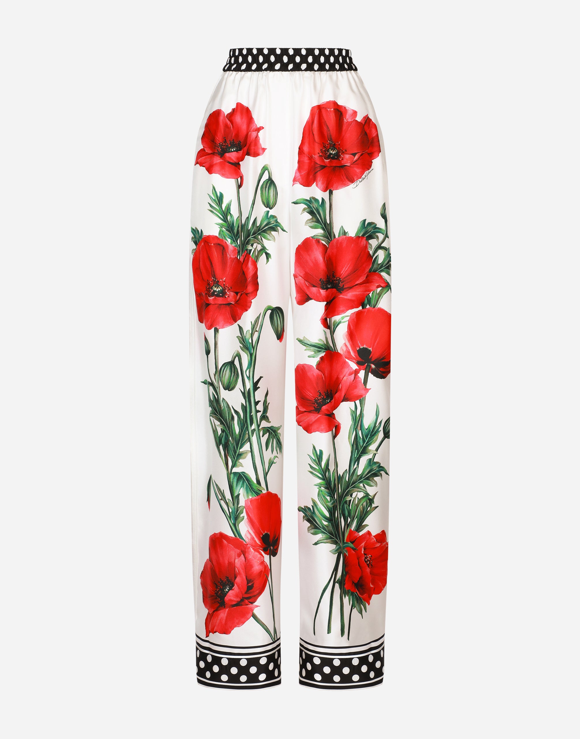 In its Happy Garden collection, Dolce&Gabbana is creating a colorful, floral universe to emphasize a wonderful and sensual portrait of a woman. Light, exquisite fabrics are used to make pieces that will give you elegant and sophisticated allure. Poppy-print twill pajama pants: • High stretch waist • Front slant pockets • Faux fly on the center front • Inner leg: 78 cm • Hem: 30.4 cm • The model is 175 cm tall and wears a size IT 40 • Made in Italy The difference in the print placement that you may find on this product is a feature of Dolce&Gabbana’s “Handmade” pieces. A detail that makes every garment or accessory unique and exclusive.
