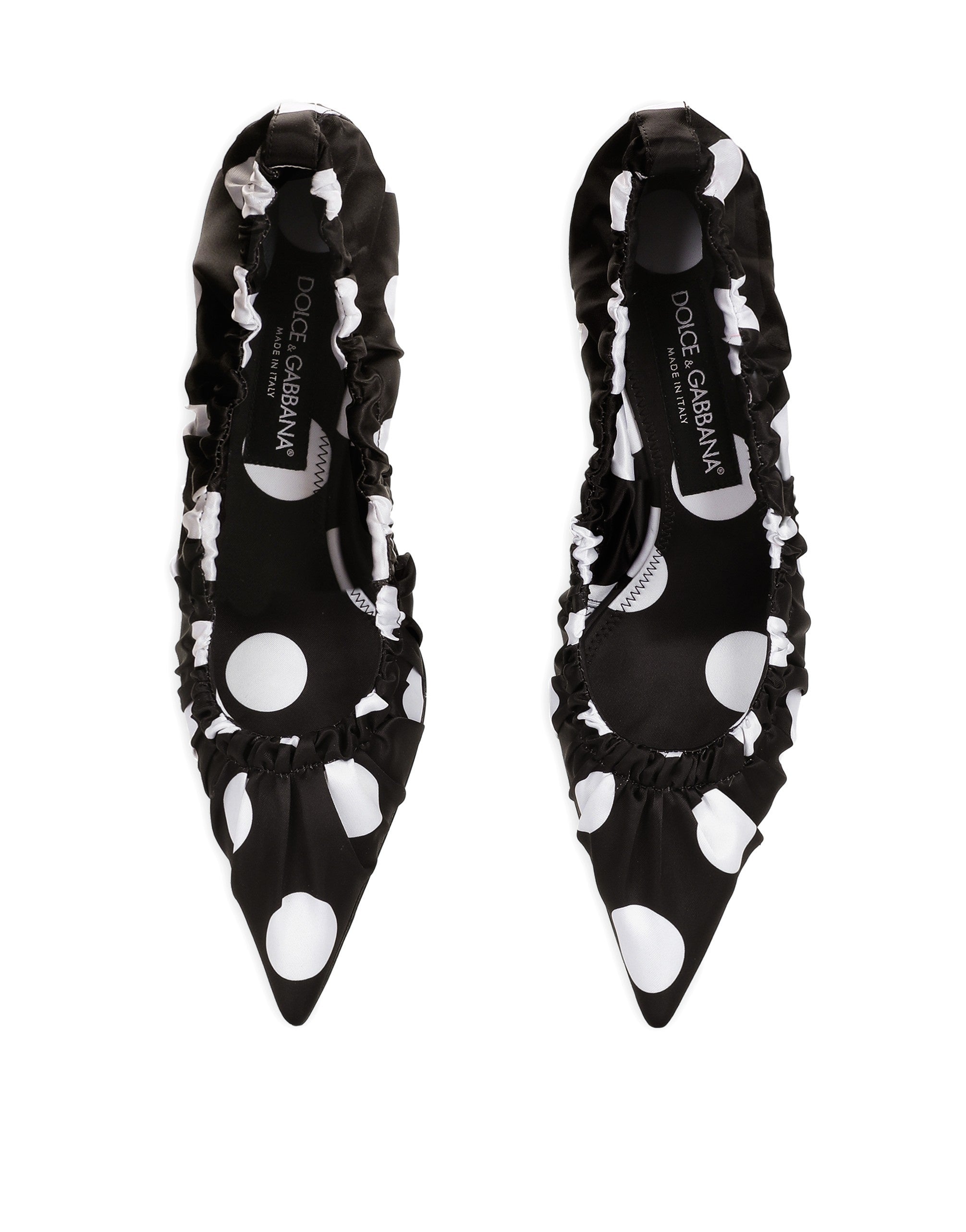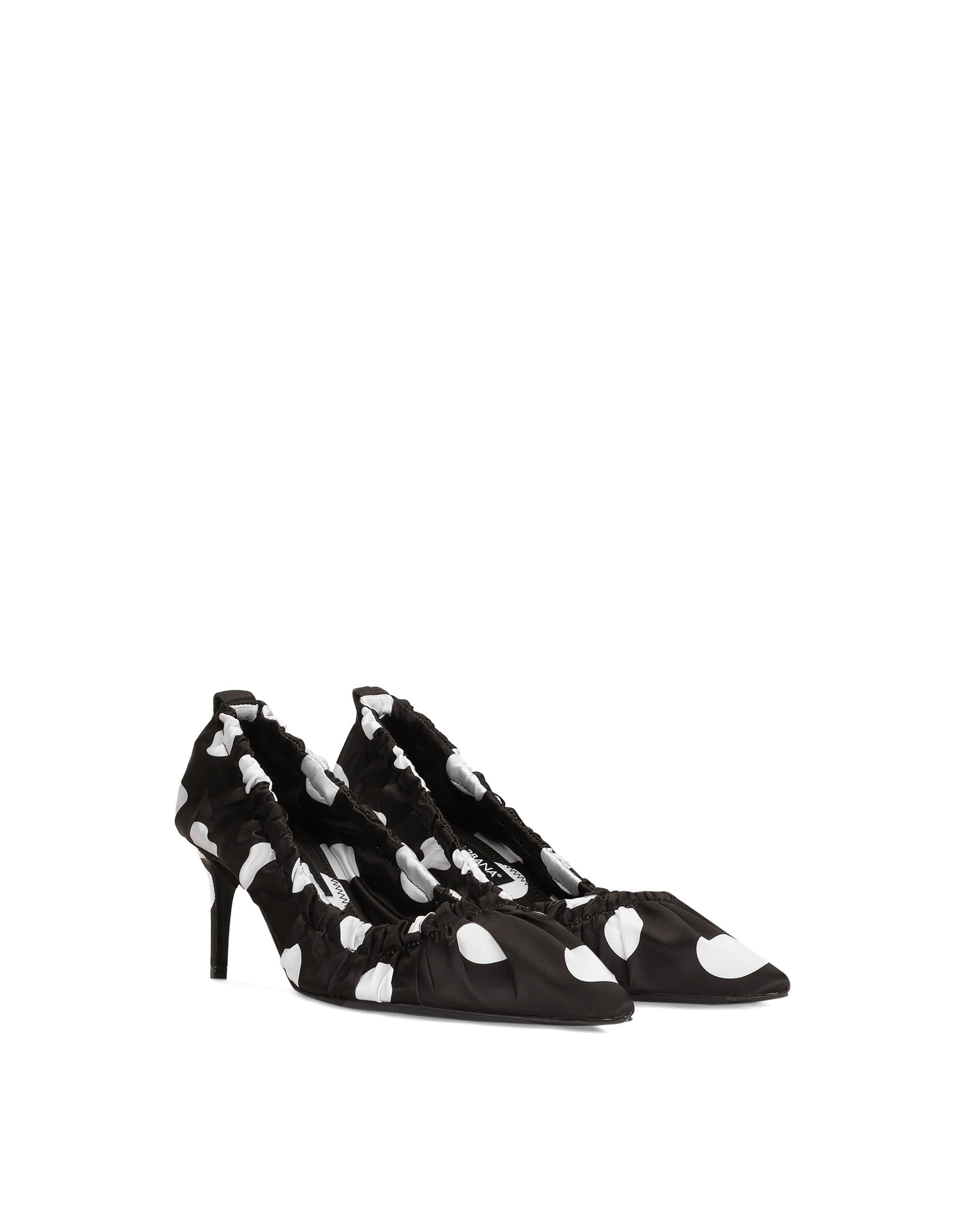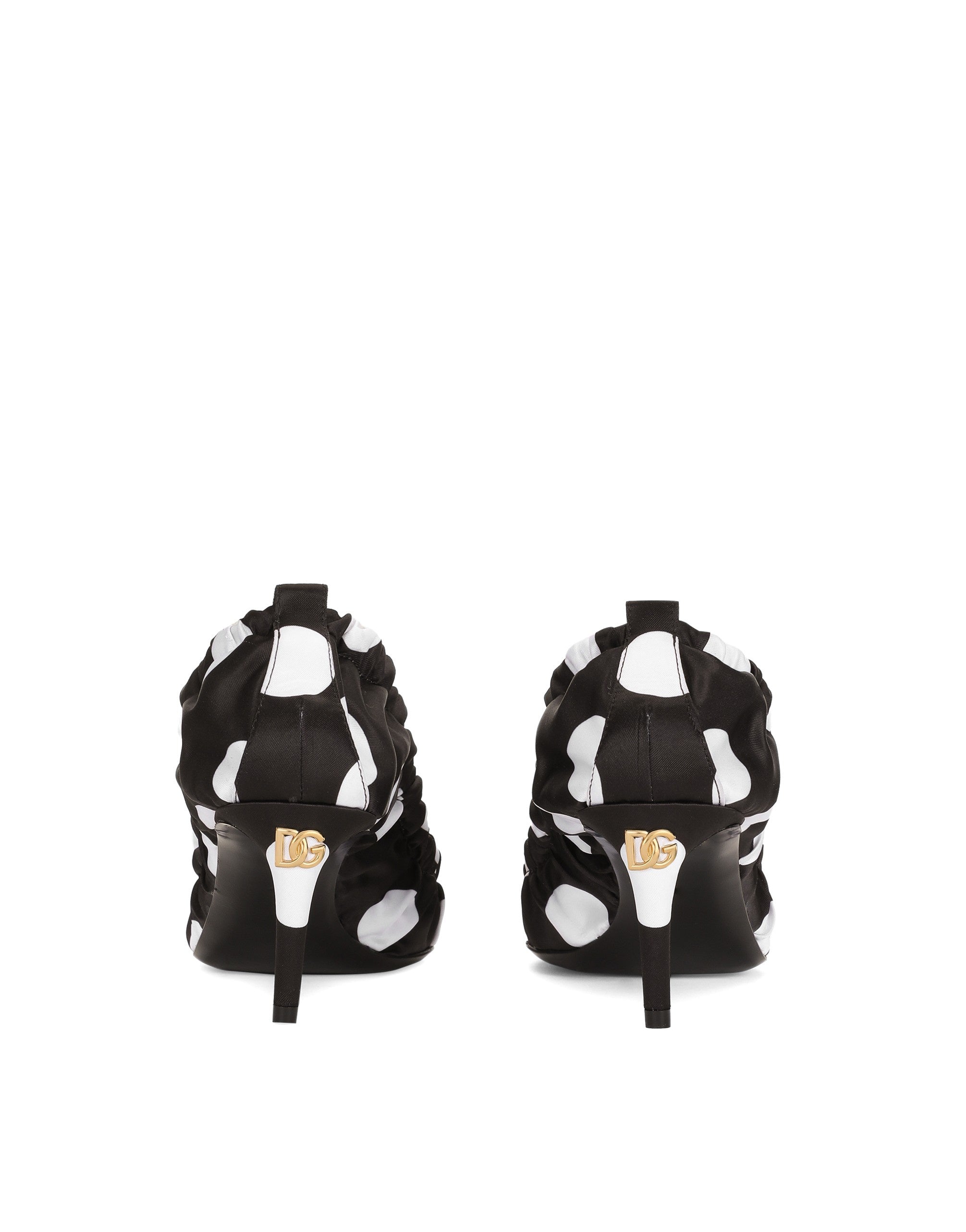 The star details of the Mambo Italiano collection, polka dots have been given a contemporary edge, infusing Dolce&Gabbana’s DNA with new life. Satin Lollo pumps with polka-dot print: • Black and White • 60-mm heel with DG logo • Printed kidskin insole with branded label • Branded leather sole • Item comes with a branded dust bag • Made in Italy The difference in the print placement that you may find on this product is a feature of Dolce&Gabbana’s “Handmade” pieces. A detail that makes every garment or accessory unique and exclusive.