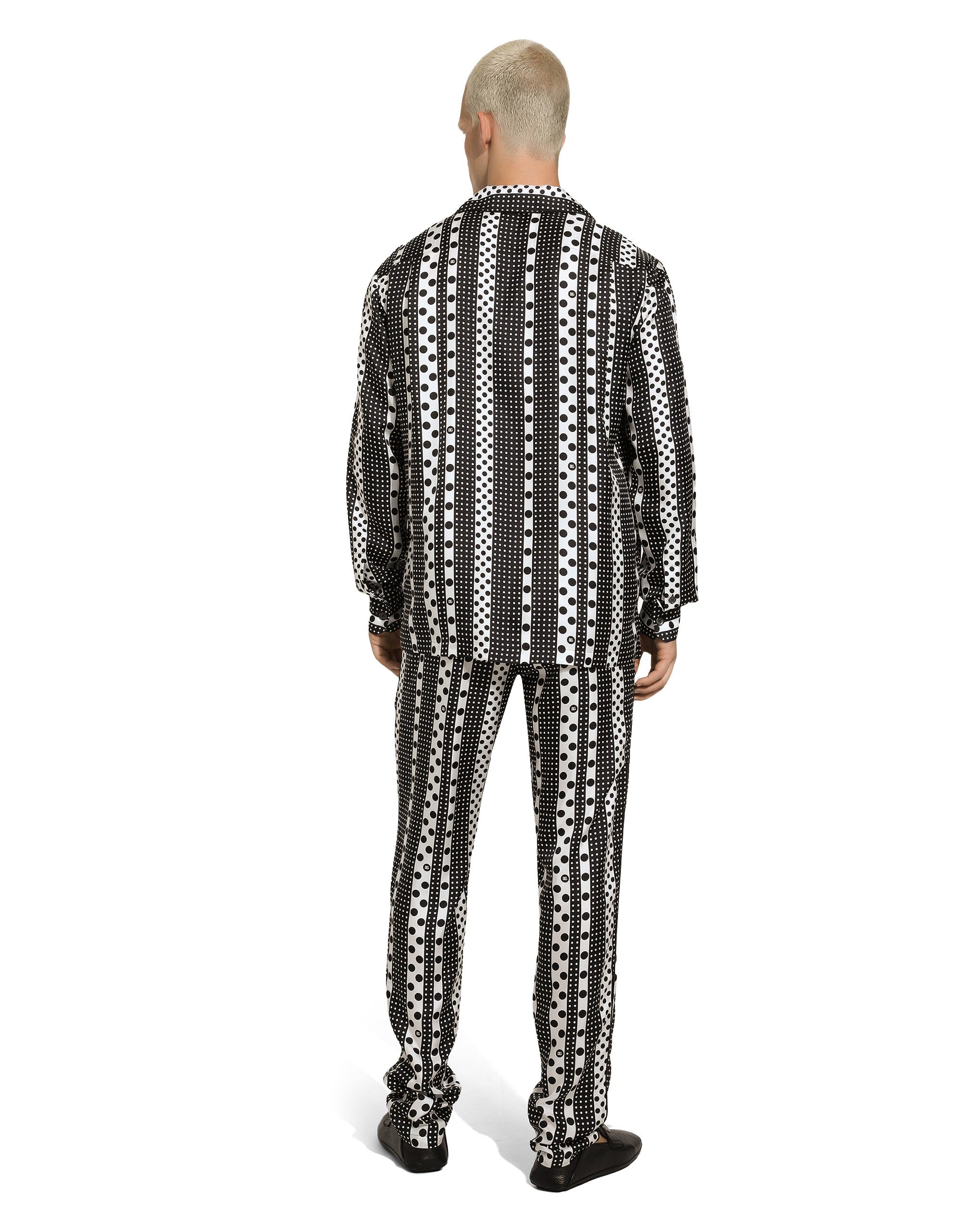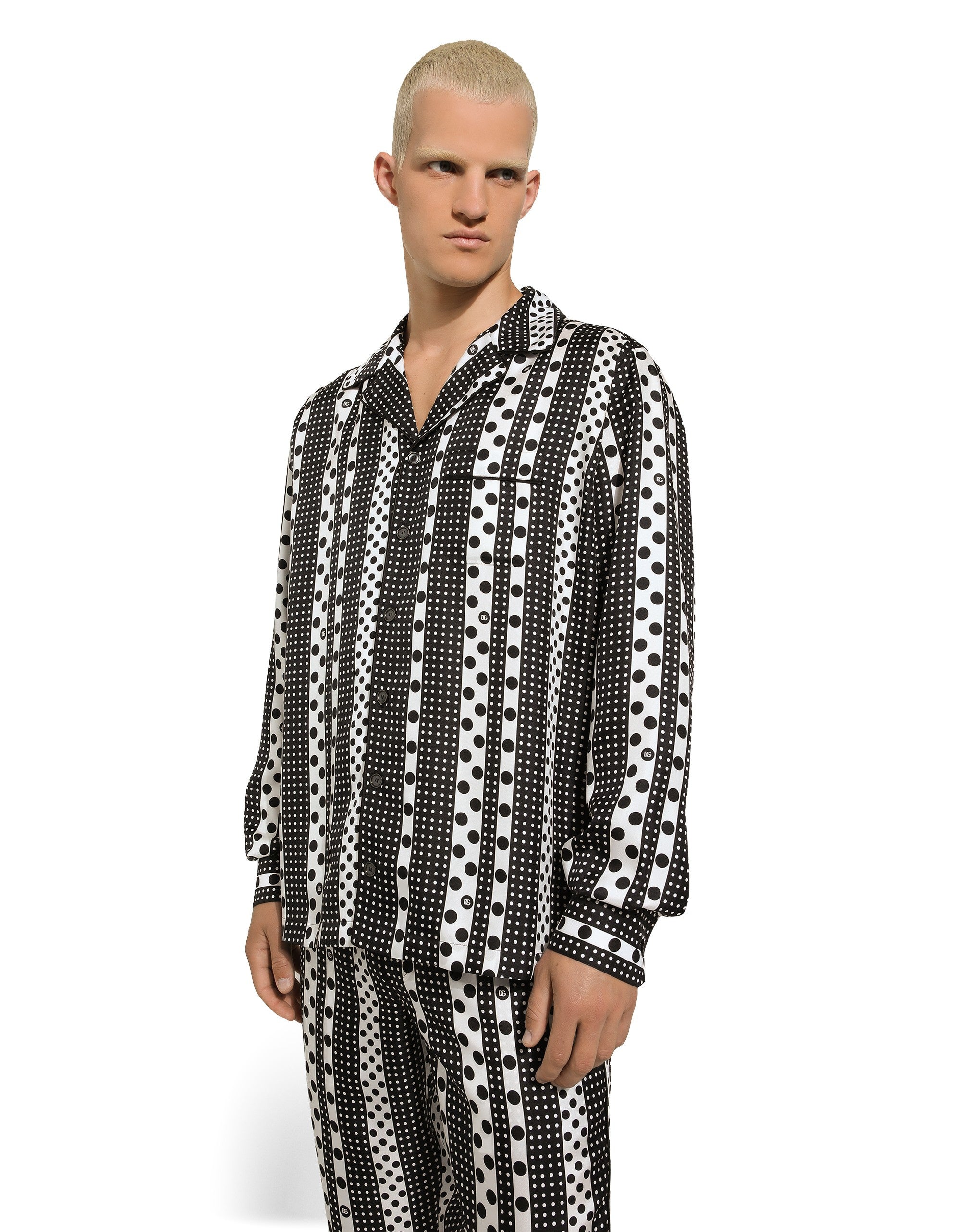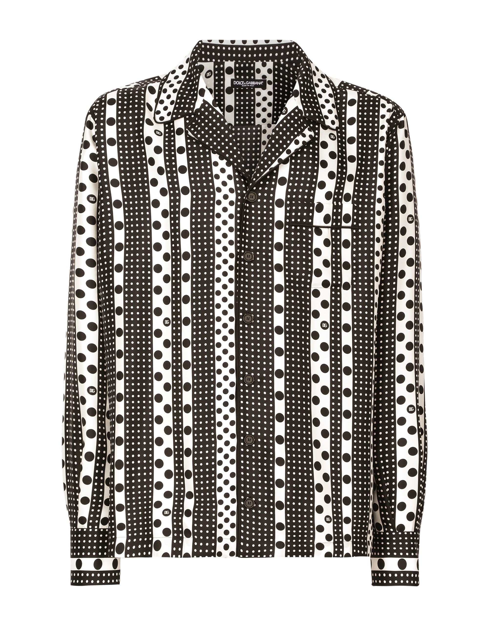 In the “Sartoriale” collection, iconic Italian sartorial heritage is presented from a new perspective, made up of lines, silhouettes and details, concealed buttoning, geometric lapels, and jackets that have seen their proportions completely overhauled. The tale is a journey embarked upon to discover a new kind of tailoring that is perfect in terms of fit, with meticulous attention to detail, that strives to speak and represent the style of the wearer, through small - yet significant - details that will make every piece unique. Silk twill shirt with striped and polka-dot print: • White and Black • Loose fit • Vanity collar • Button fastenings • Long sleeves • Breast pocket • The piece measures 78 cm from the rear collar seam on a size IT 40 • Made in Italy The difference in the print placement that you may find on this product is a feature of Dolce&Gabbana’s “Handmade” pieces. A detail that makes every garment or accessory unique and exclusive.
