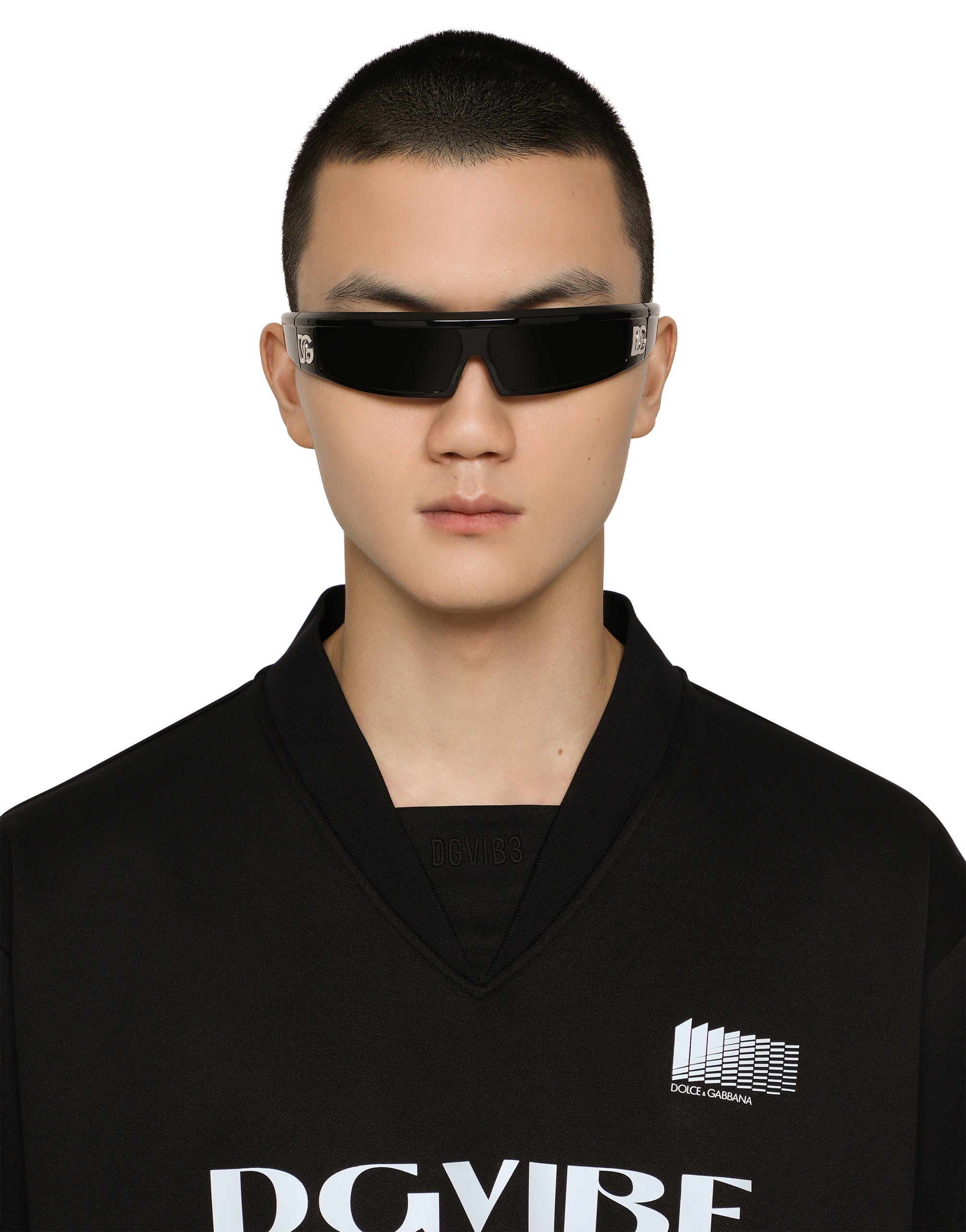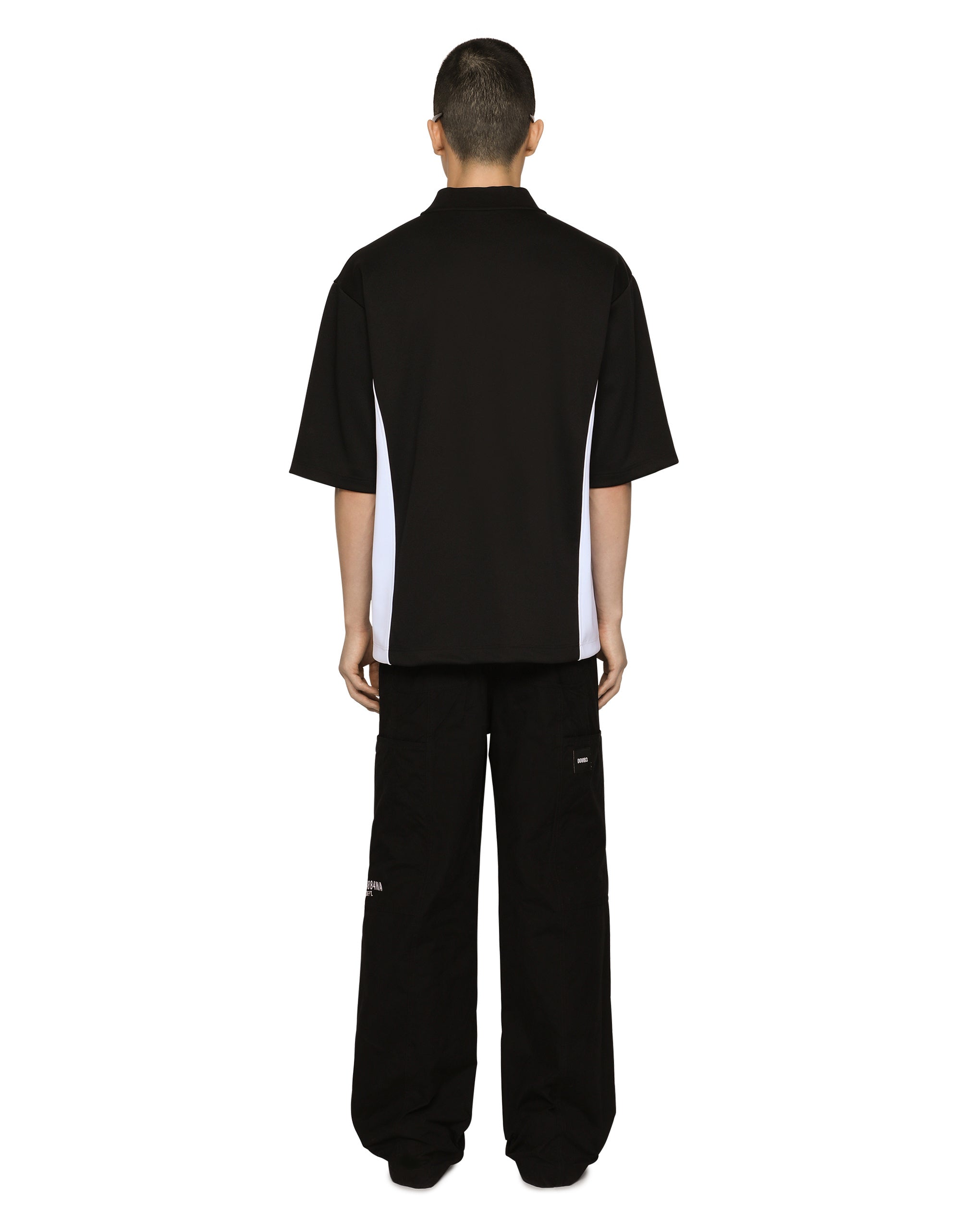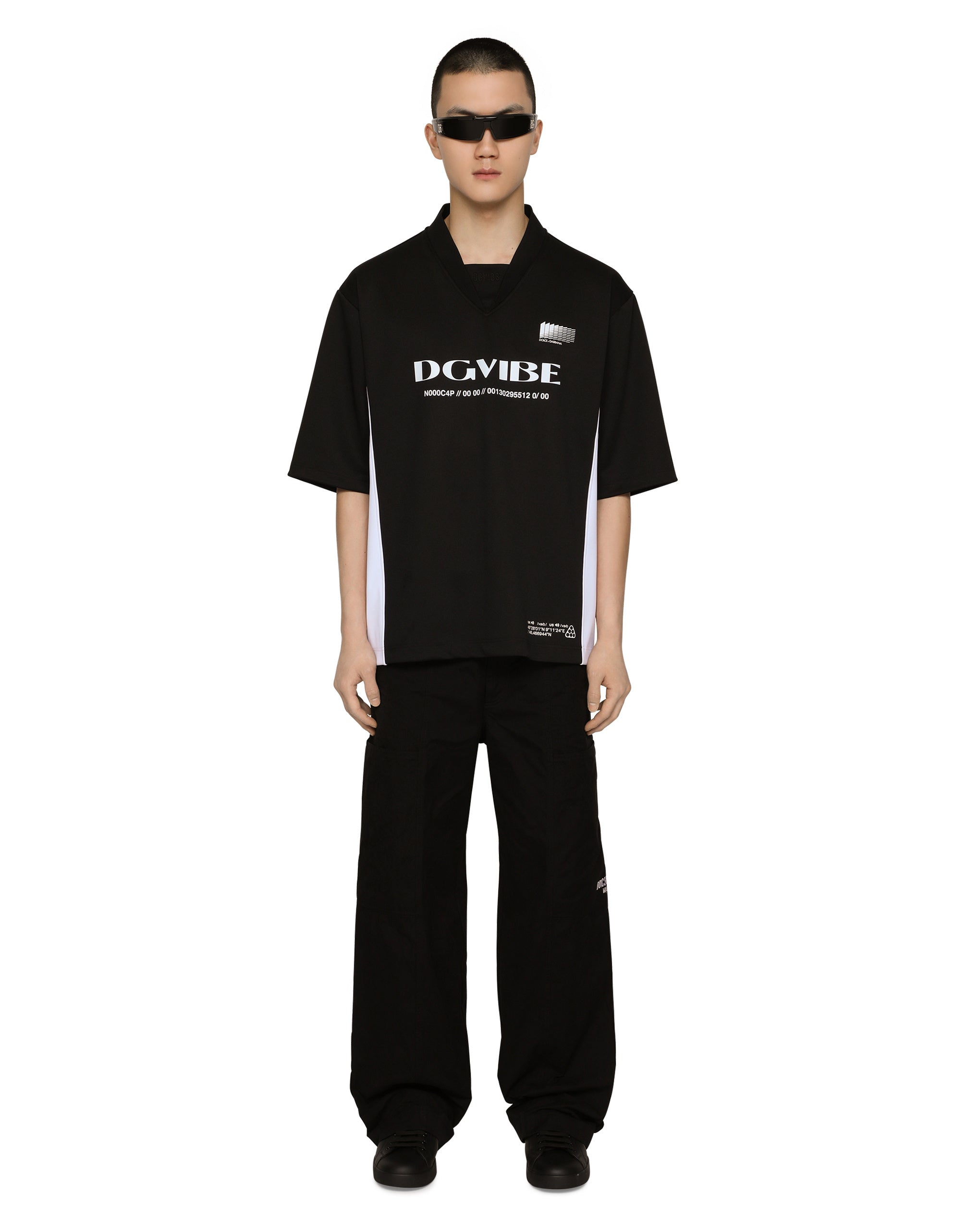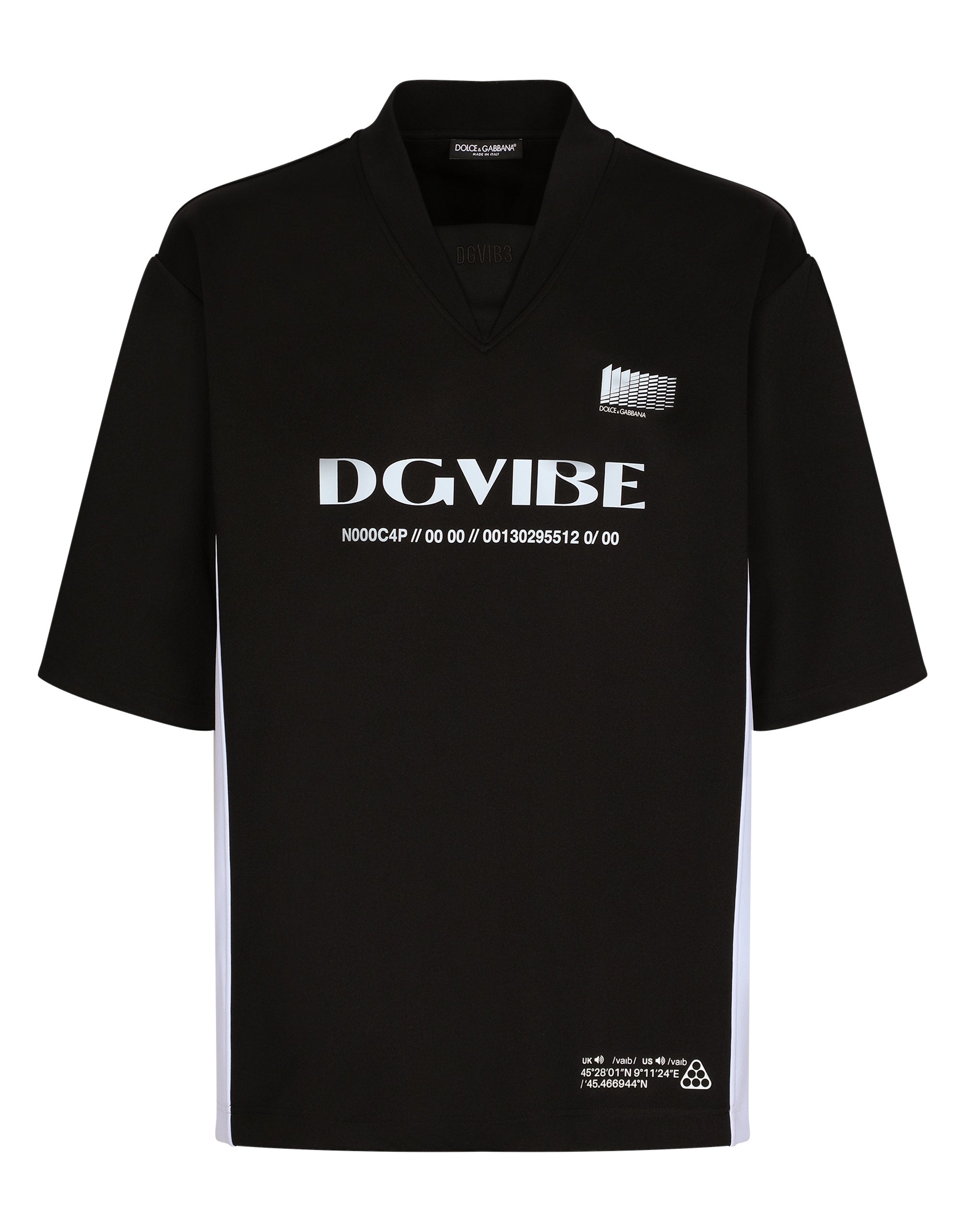The new DGVIB3 collection is introducing us to the new language of Dolce&Gabbana: graphic taste and music are the keywords. All the prints, symbols, oversize volumes, new shapes, lengths and urban/street influences that we find in the collection are there precisely to recreate a unisex aesthetic, one that isn't tied to any specific physicality, yet with the specific desire to respect the characteristics of both sexes and convey a new and as-yet unexplored side of the Dolce&Gabbana world. Triacetate T-shirt with print and DGVIB3 embroidery: • Oversize fit • Stretch knit V-neck with triangle embroidery • Contrasting side inserts • Short sleeves • Black • The piece measures 74 cm from the rear collar seam on a size M • The model is 185 cm tall and wears a size L • Made in Italy