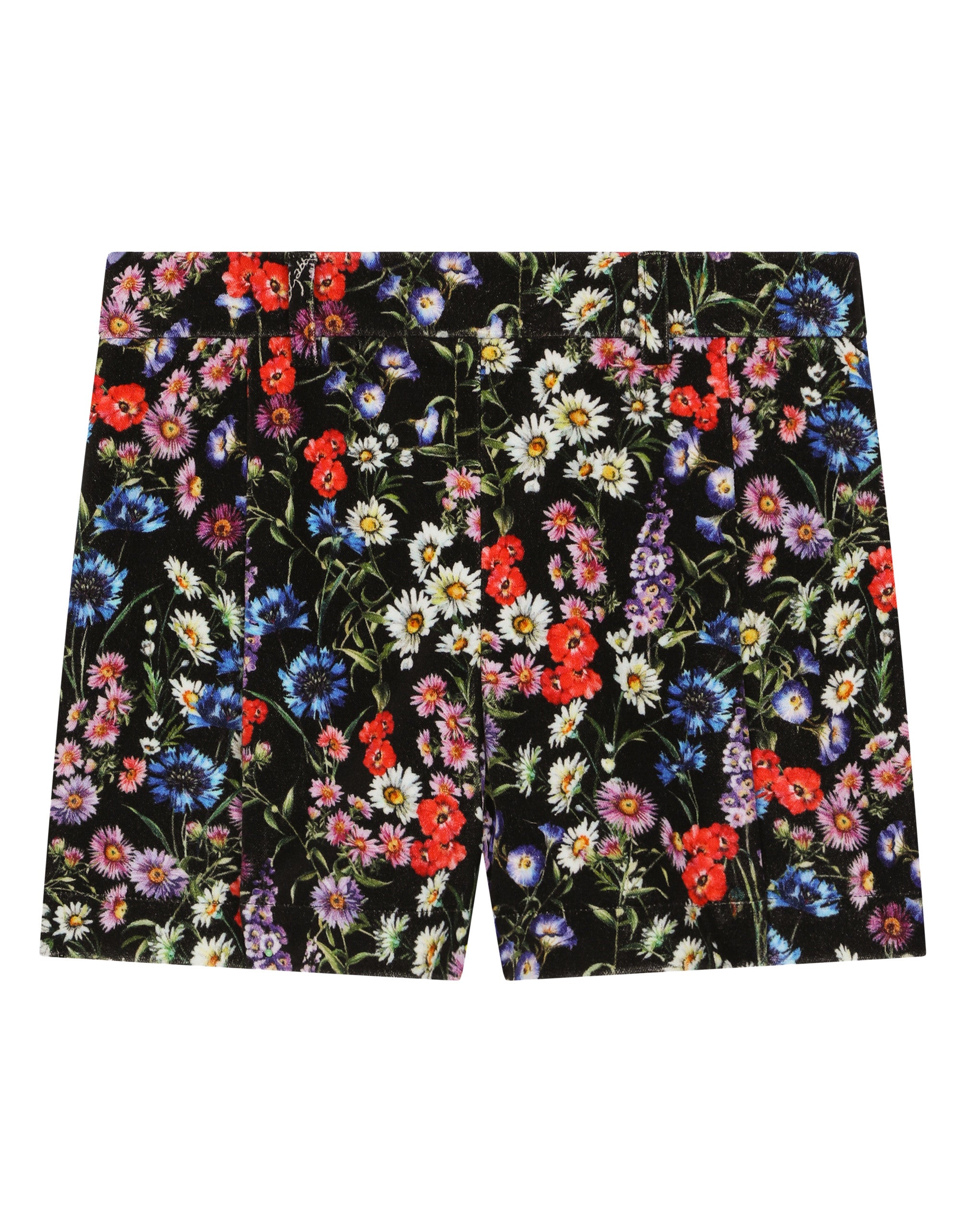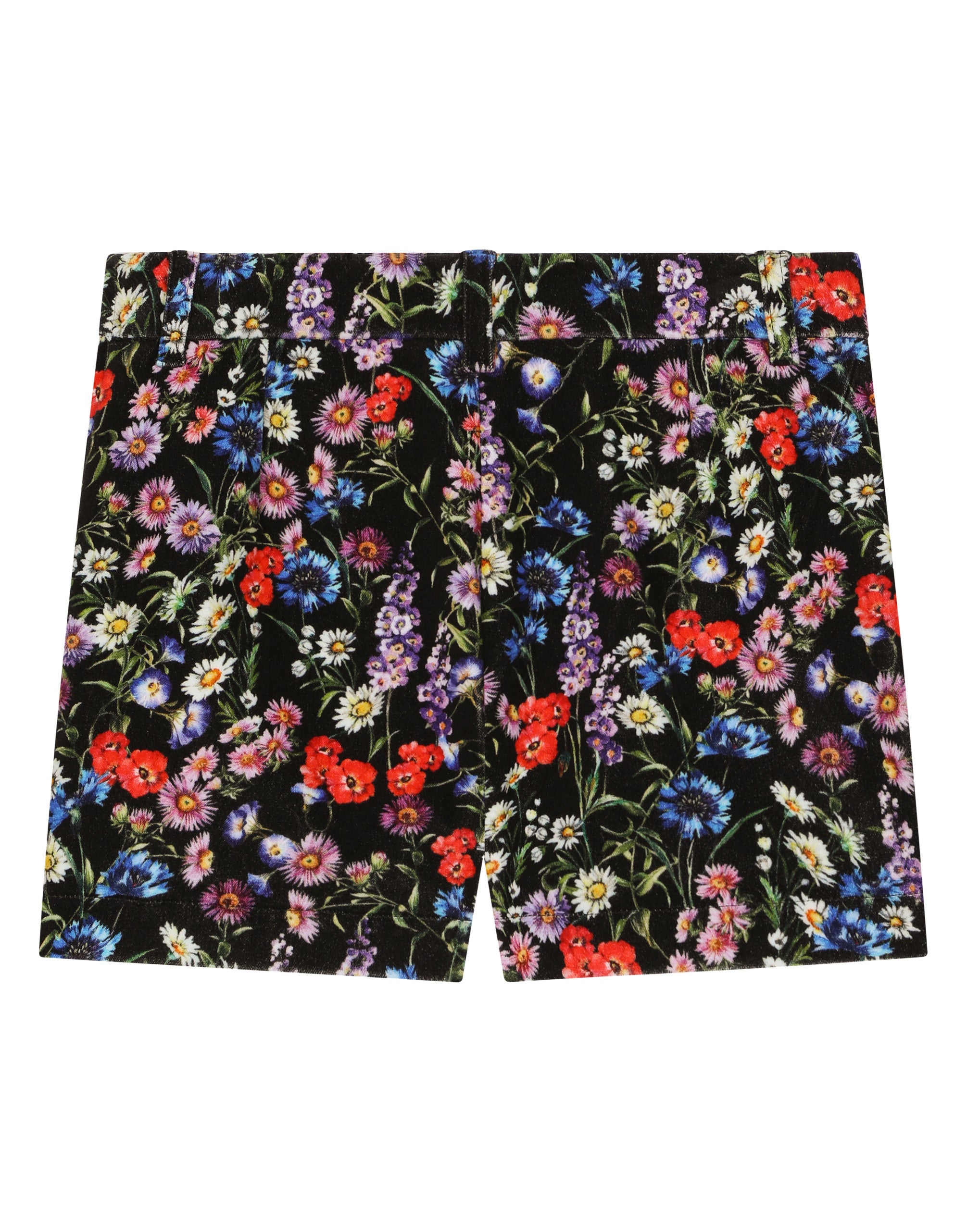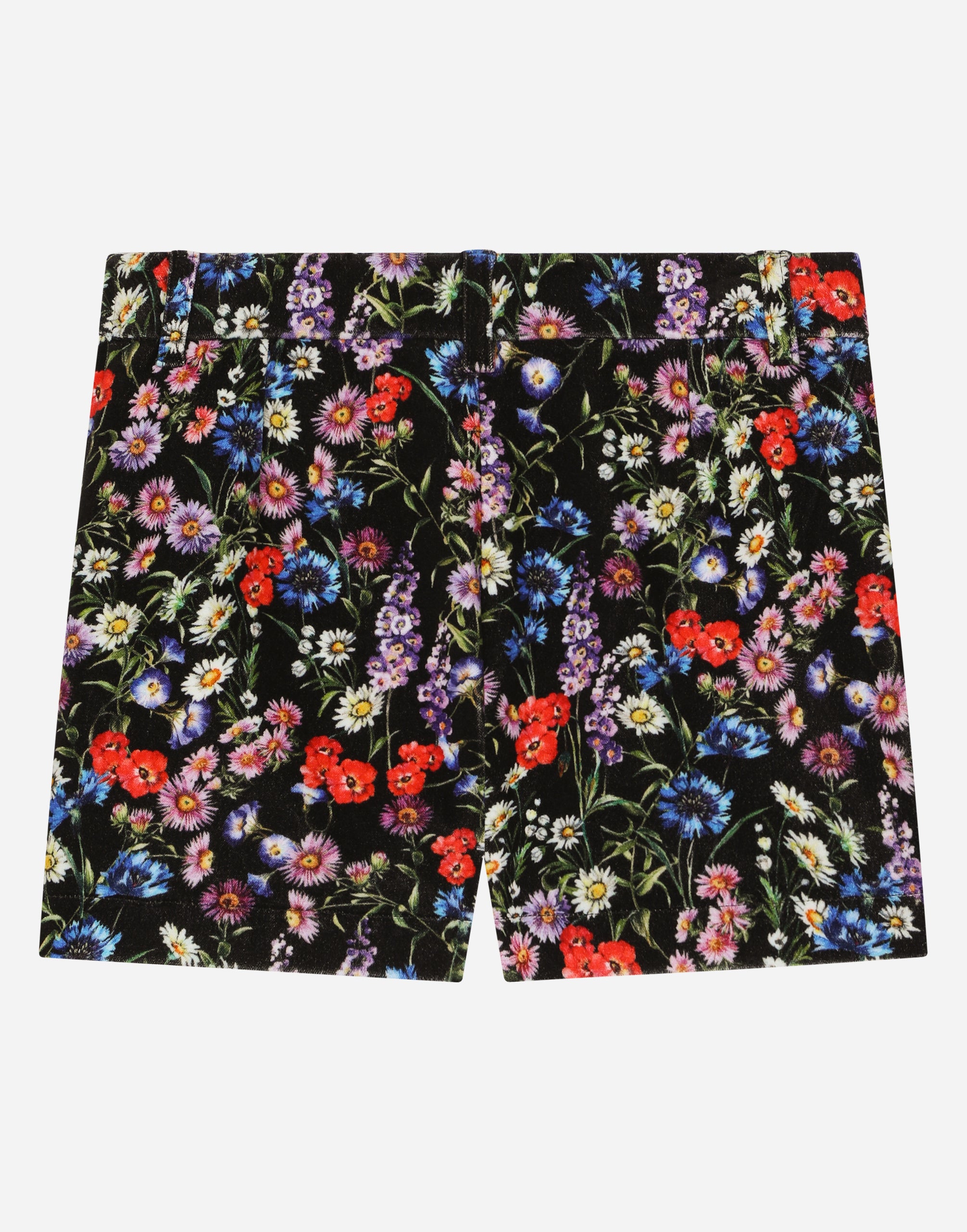The girl’s Prateria Collection is inspired by the women’s 2001 New Hippy Collection, where the desert and meadows become bohemian and glamorous. Vaguely vintage/grunge looks come made up of volume and special pieces flaunt light printed and solid-color fabric details, smock stitching, corduroy, faux fur and a print distinguished by delicate and joyful multi-colored wildflowers for fun and ironic little girls. Velvet shorts with meadow flower print: • Multi-colored • Regular fit • Inner waistband with adjustable elastic • Pleated on the front • Unlined • Concealed zipper fastening on the side • The item in the size 6 years measures 28 cm in length • Made in Italy The difference in the print placement that you may find on this product is a feature of Dolce&Gabbana’s “Handmade” pieces. A detail that makes every garment or accessory unique and exclusive.