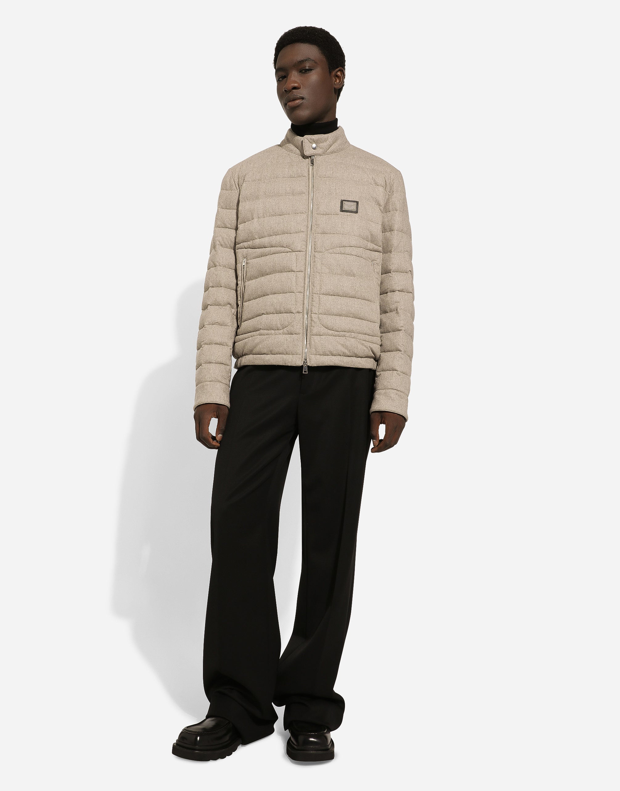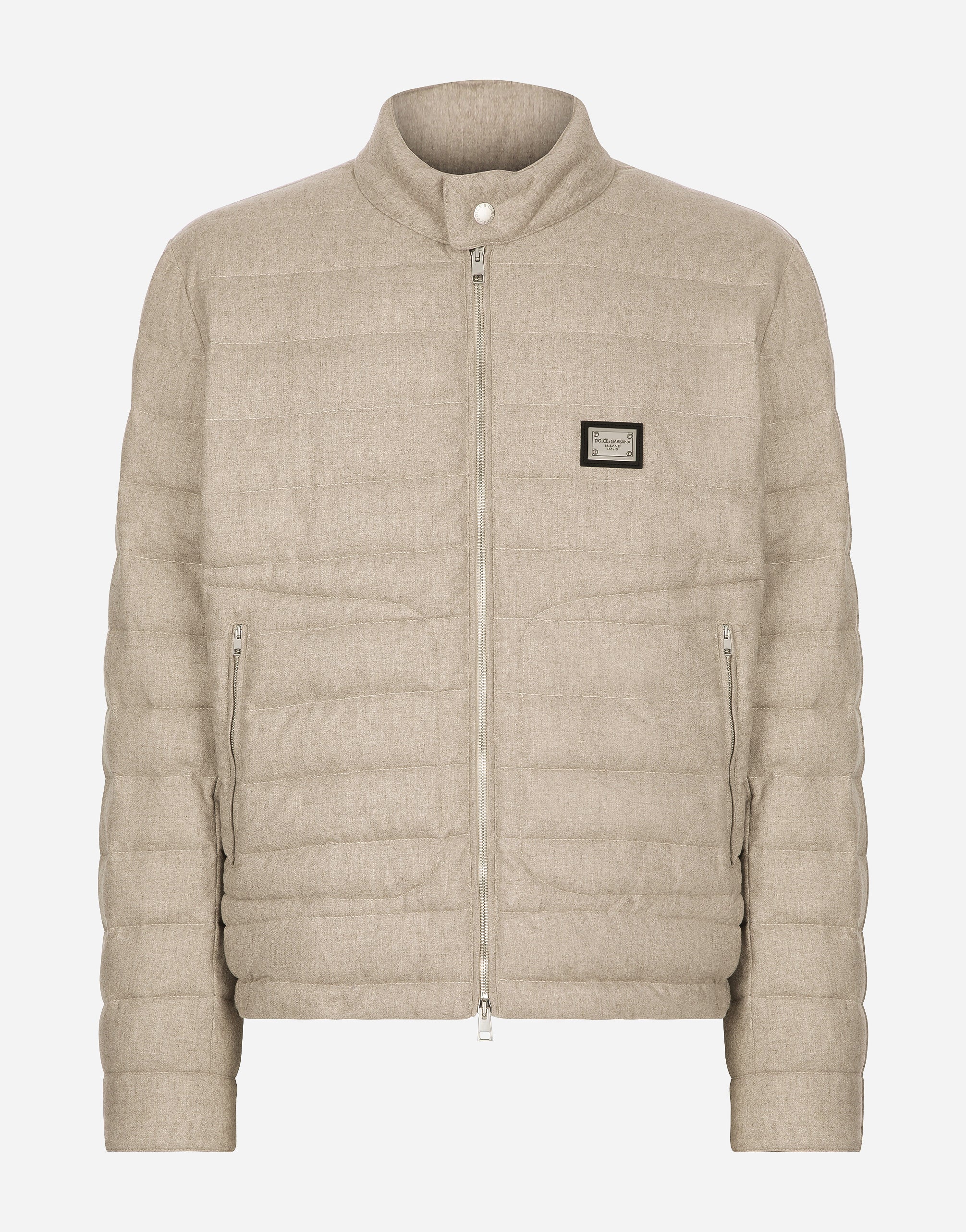 In the “Sartoriale” collection, iconic Italian sartorial heritage is presented from a new perspective, made up of lines, silhouettes and details, concealed buttoning, geometric lapels, and jackets that have seen their proportions completely overhauled. The tale is a journey embarked upon to discover a new kind of tailoring that is perfect in terms of fit, with meticulous attention to detail, that strives to speak and represent the style of the wearer, through small - yet significant - details that will make every piece unique. Quilted cashmere jacket with metal tag featuring the Dolce&Gabbana logo: • Beige • Press-stud fastening and zipper on front • Inner and outer pockets with zipper • Press-stud fastening on cuffs • The piece measures 61 cm from the rear collar seam on a size IT 48 • Made in Italy