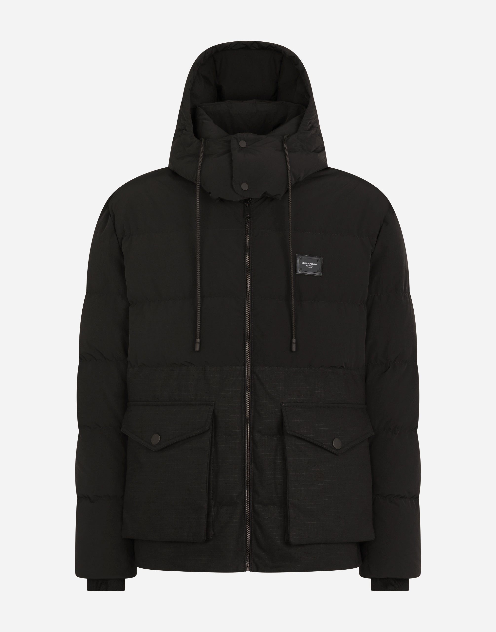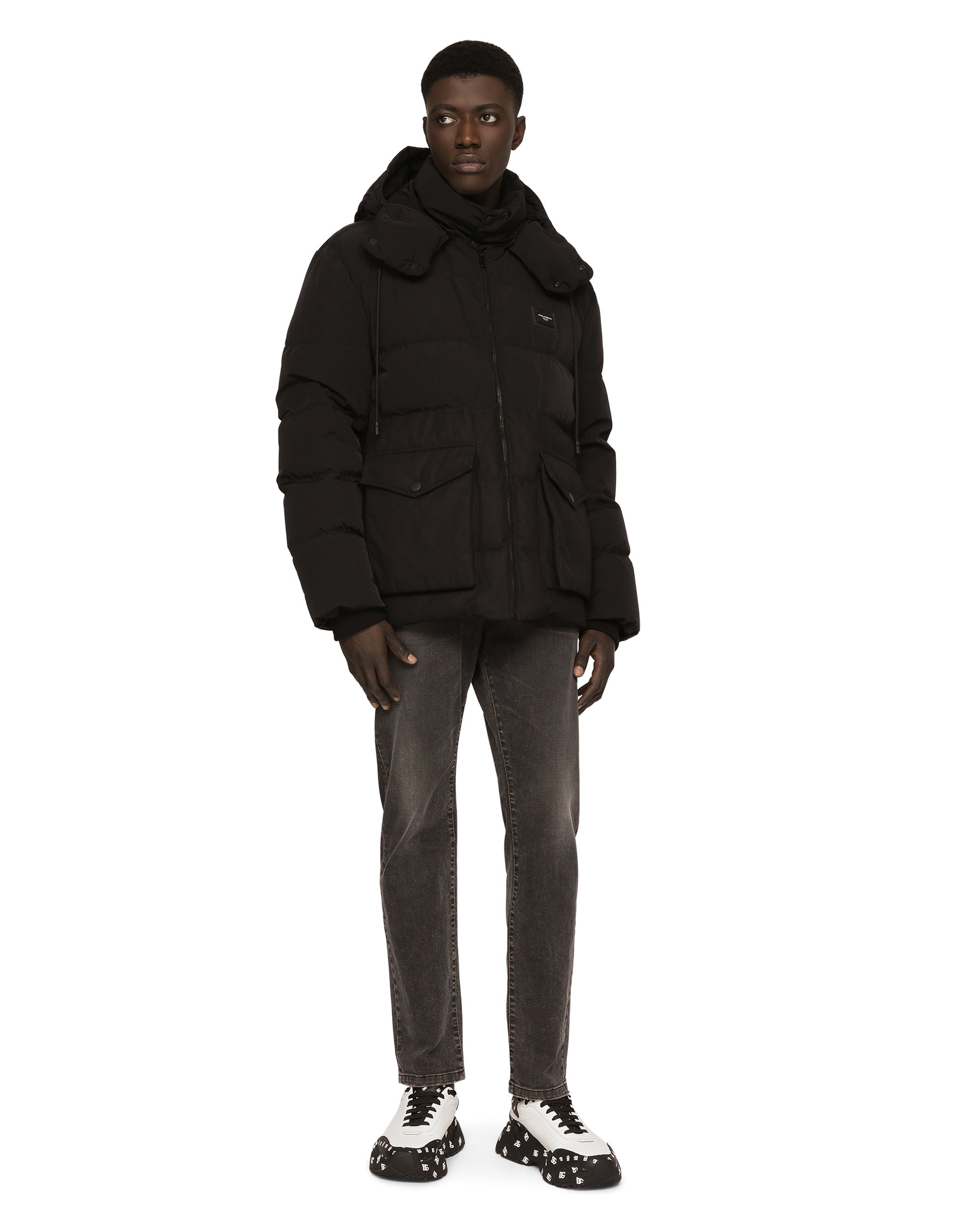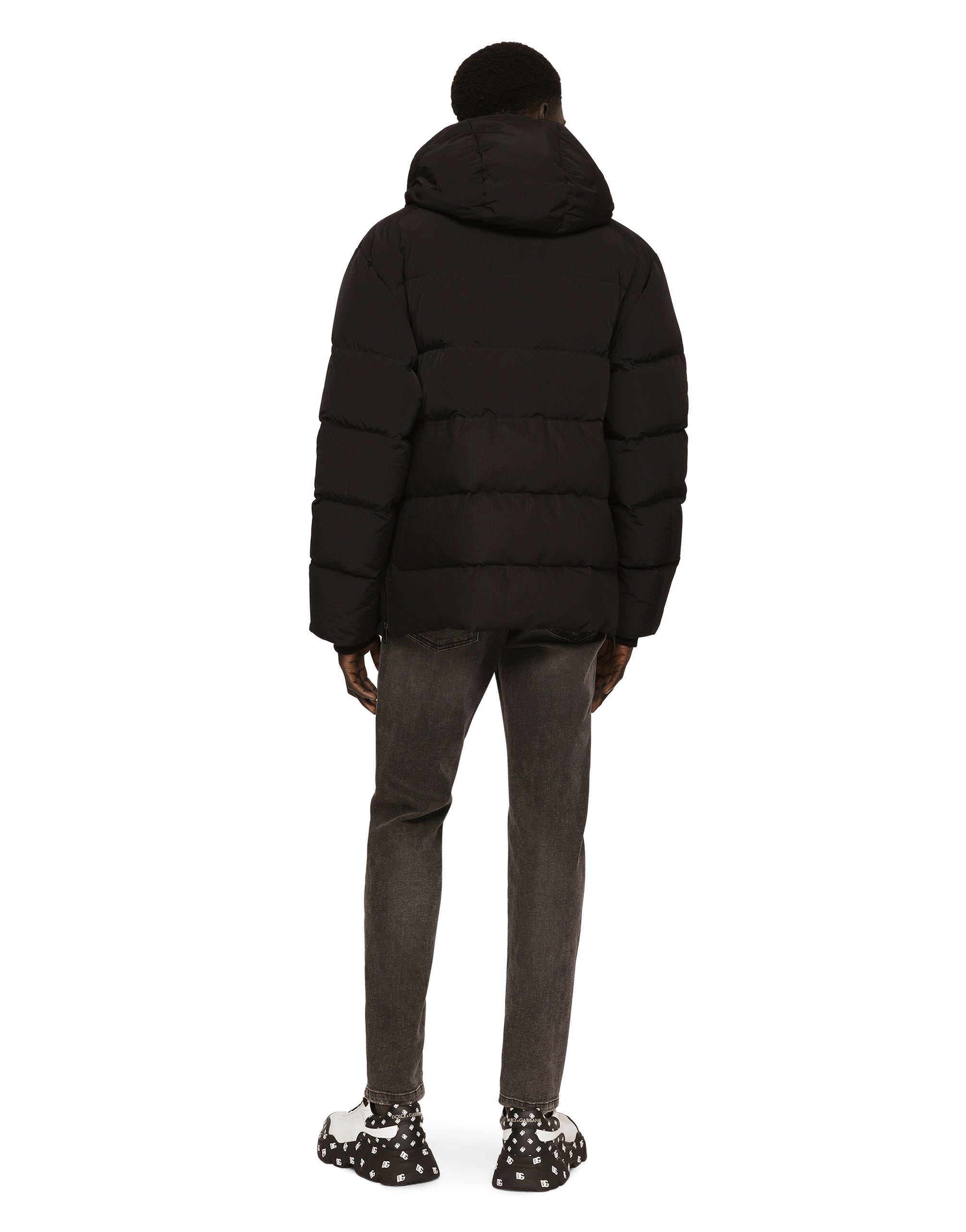 The “Essential” Collection is the modern men's closet designed by Dolce&Gabbana. A range of timeless, iconic pieces developed across all product categories. Quilted cotton and nylon jacket with side zippers and a metal tag featuring the Dolce&Gabbana logo. • Light goose down padding on the interior • Regular fit • Detachable drawstring hood with branded metal aglets • Front zipper fastening • Flap patch pockets with press-stud buttons • Drawstring hem • Lined • The piece measures 75 cm from the rear collar seam on a size IT 48 • The model is 185 cm tall and wears a size IT 48 • Made in Italy