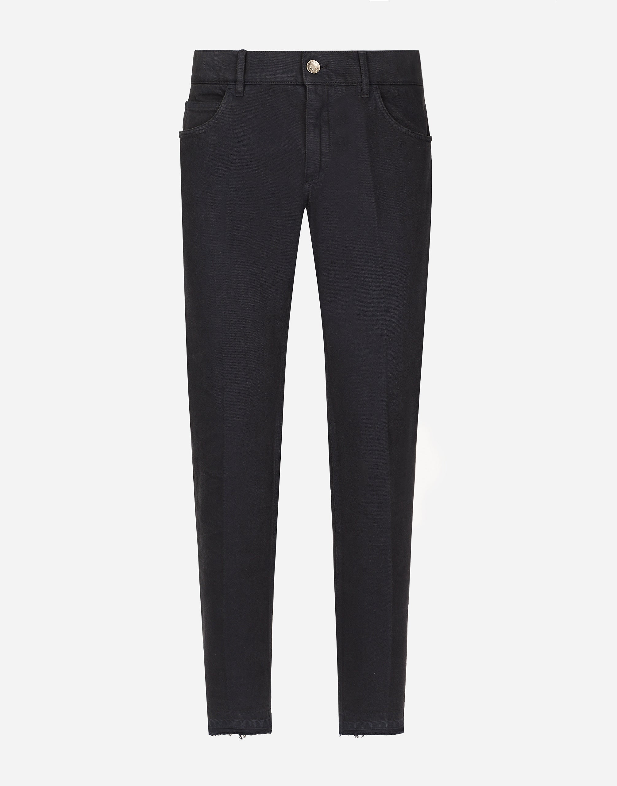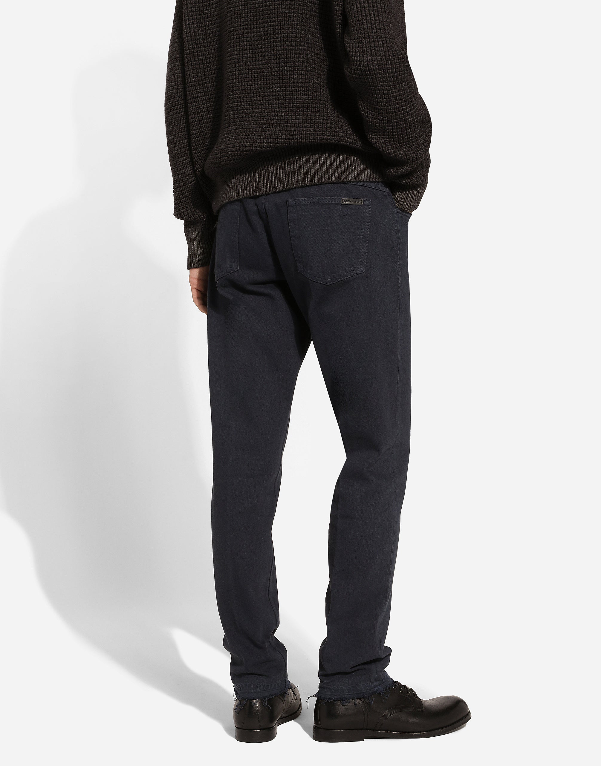 The men's FW 24-25 Re-Edition collection conveys contemporary style that flaunts all the power of the creative DNA that consolidated the brand's image and elevated it to iconic status in the 2000s. Raw-cut details and skilled finishes distinguish pieces with streetwear character: military-inspired jackets and maxi-coats, multi-pocket cargo pants and picot pieces alternate with denim boasting many washes and dyes, thereby redefining an iconic style that is always evolving. Five-pocket regular-fit denim jeans: • Blue • Regular fit • Fly-covered zipper and button fastening • Dolce&Gabbana logo tag on the back • The item measures 105 cm on the outer leg and the hem is 17 cm wide on a size IT 48 • Made in Italy