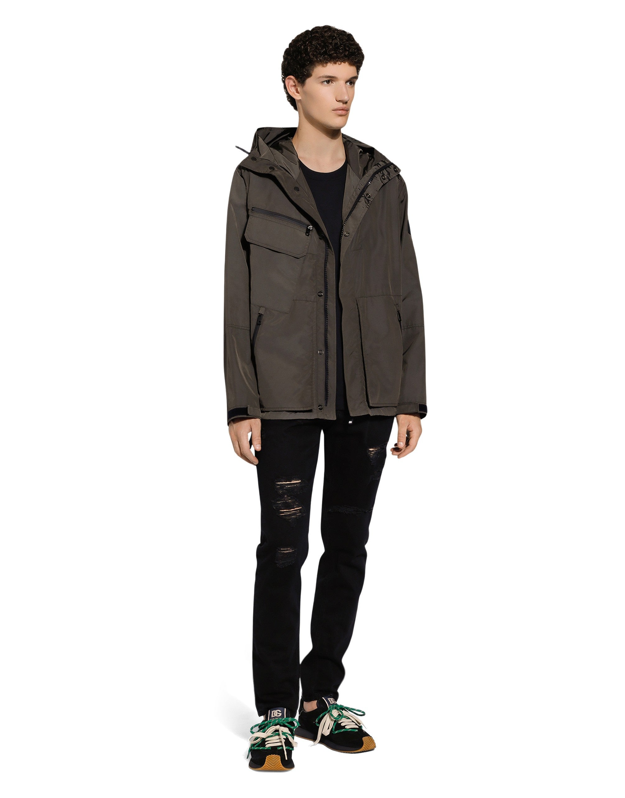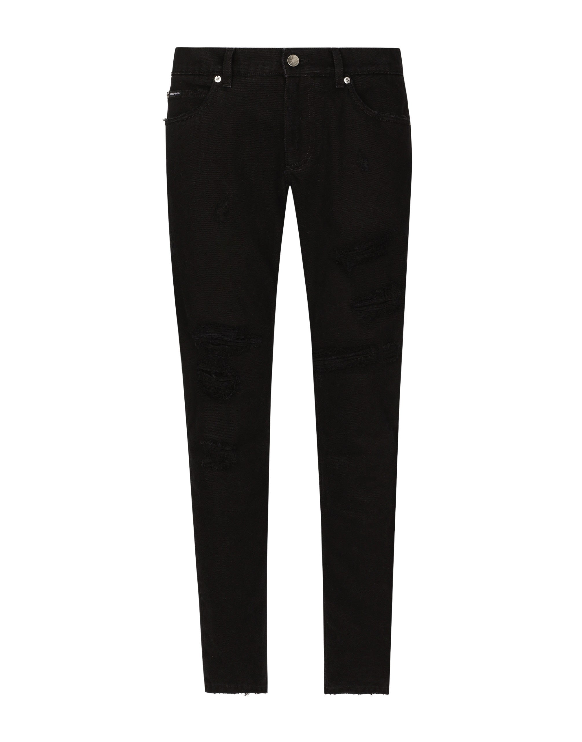 The men's FW 24-25 Re-Edition collection conveys contemporary style that flaunts all the power of the creative DNA that consolidated the brand's image and elevated it to iconic status in the 2000s. Raw-cut details and skilled finishes distinguish pieces with streetwear character: military-inspired jackets and maxi-coats, multi-pocket cargo pants and picot pieces alternate with denim boasting many washes and dyes, thereby redefining an iconic style that is always evolving. Five-pocket regular-fit denim jeans with rips: • Black • Regular fit • Fly-covered zipper and button fastening • Dolce&Gabbana logo tag on the back • The item measures 105 cm on the outer leg and the hem is 17 cm wide on a size IT 48 • Made in Italy