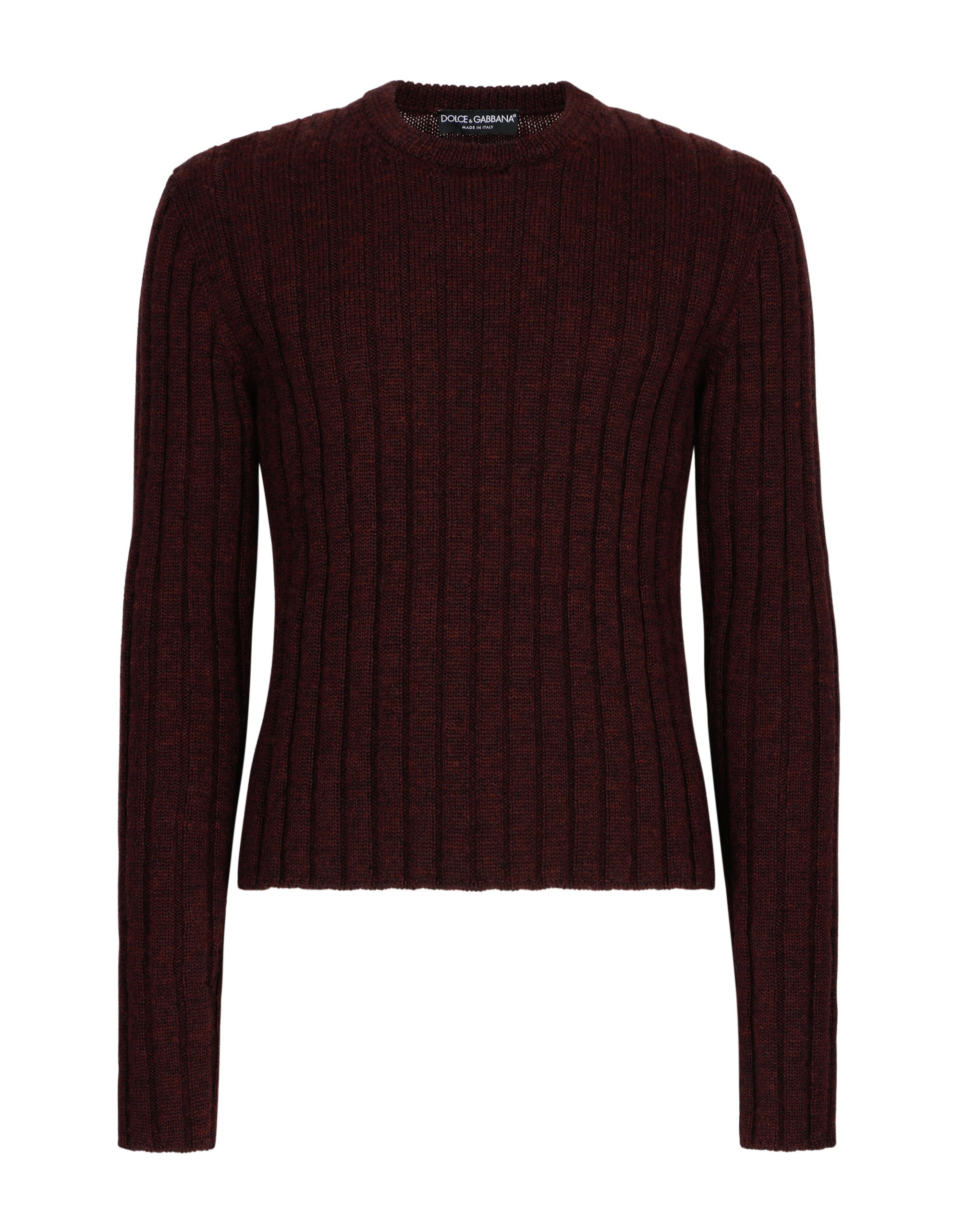 For FW23, Dolce&Gabbana rereads its own historical archive, which is an inexhaustible source of inspiration that is rich in fascination and creativity. The garments accompanied by a “Re-Edition” label report the dates referenced by the collection. Each look enhances in all its sophistication the concept of timeless relevance of a historical archive allowing new generations to discover a past but always current universe that is rich in creative insights and possible personal interpretations. Round-neck sweater in ribbed wool: • Burgundy • Slim fit • 5-gauge knit • The piece measures 63 cm from the shoulder seam on a size IT 48 • The model is 185 cm tall and wears a size IT 48 • Made in Italy