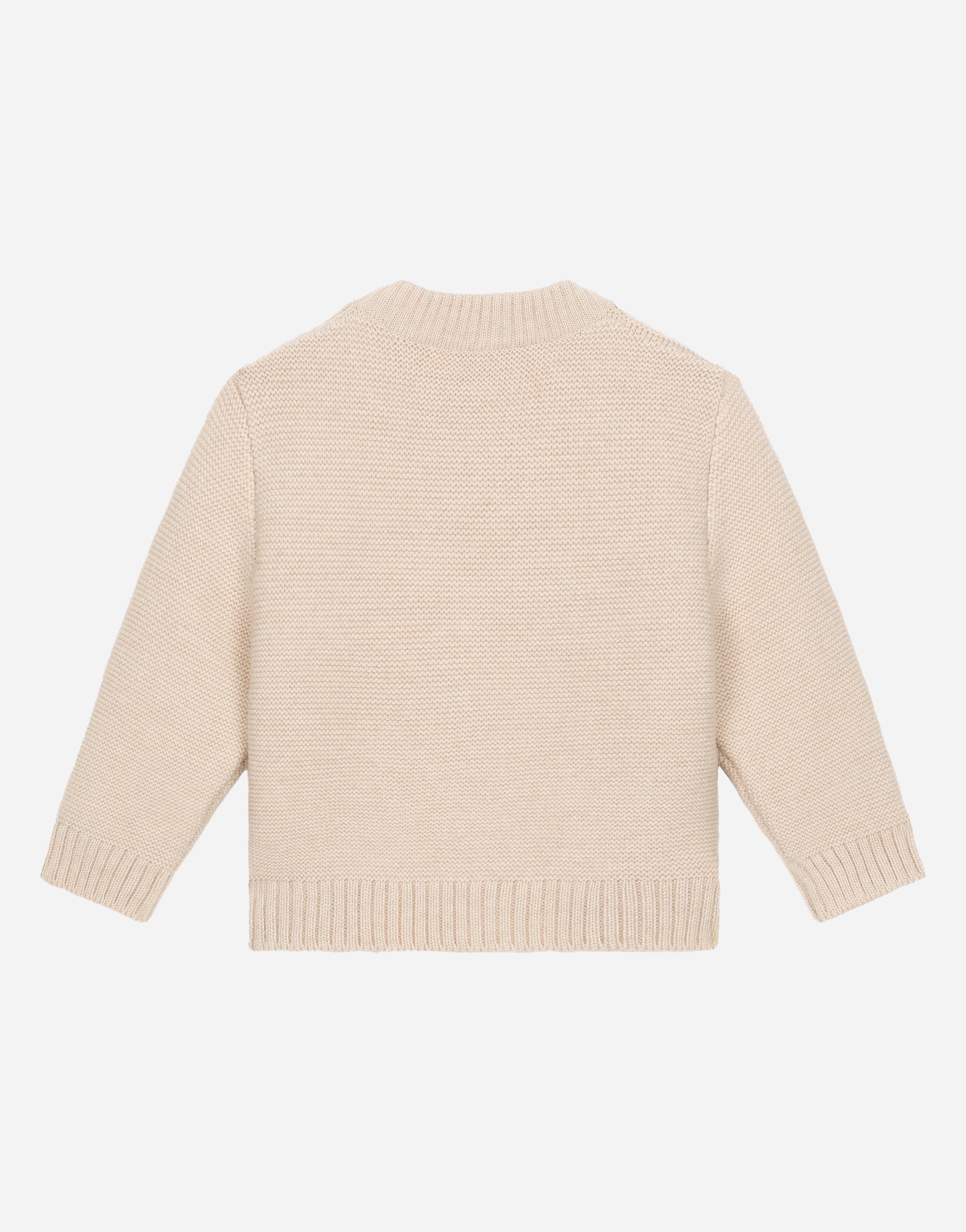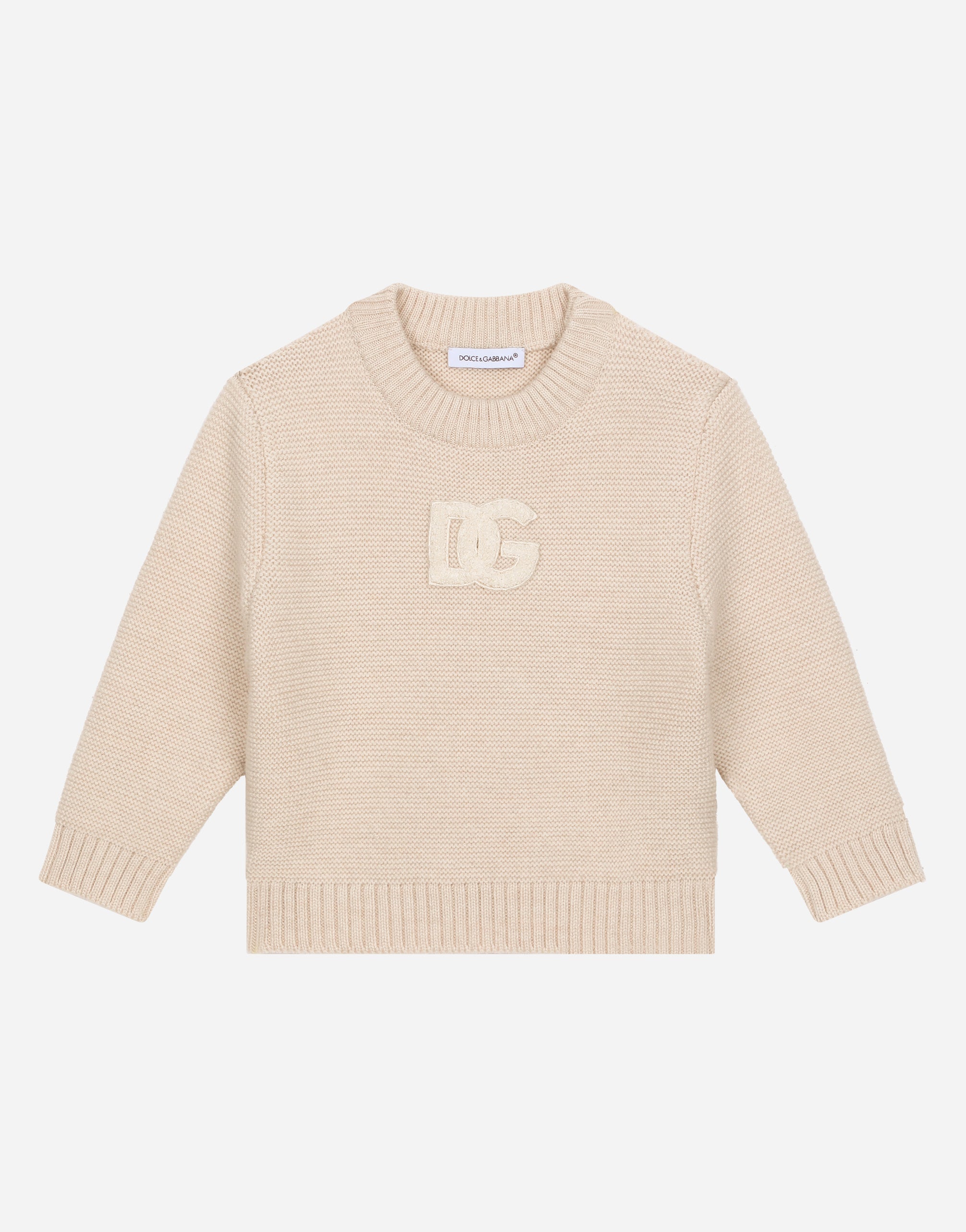 Dedicated to special occasions and the perfect gift idea, the DG Loves Newborn capsule collection dresses little ones in the elegance of total white and the softness of delicate pastel hues. Fine knitwear, the exquisiteness of duchesse silk and the comfort of jersey give life to stylish garments with sophisticated details, embellished by DG logo embroidery or exclusive prints. This soft round-neck pullover in a plain knit features the DG logo patch. • Regular fit • 7-gauge knit • Round neck • Long sleeves • Embroidered DG logo patch on the front • Small concealed press-stud fastenings on the shoulder • The item in the size 6/9 months measures 29.5 cm from the shoulder seam • Made in Italy